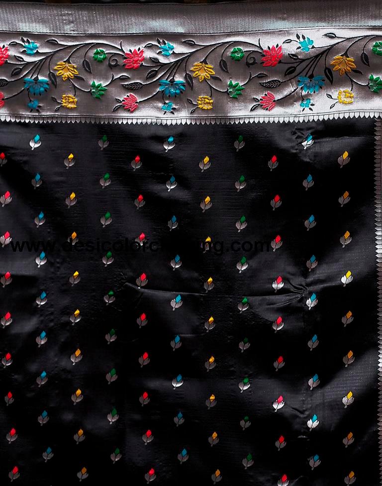 Blouse Color:Black Blouse Fabric:Silk Blouse Length:0.70 Mtr Blouse Work:Plain, Woven Border Saree Color:Silver, Black, Multi Saree Fabric:Silk Saree Length:5.30 Mtr Saree Work:Plain, Woven ( Paithani) Type:paithani