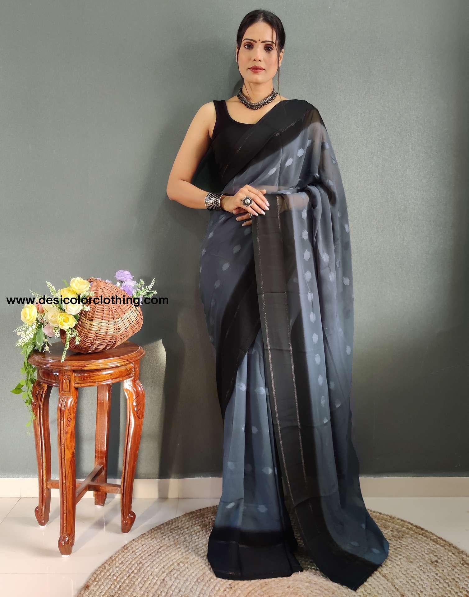 Blouse Color:Black Blouse Fabric:Banglori Silk Blouse Length:5.50 Mtr Blouse Work:Plain Saree Color:Steel Blue Saree Fabric:Georgette Saree Length:5.50 Mtr Saree Work:Plain, Jacquard, Satin Jari Border