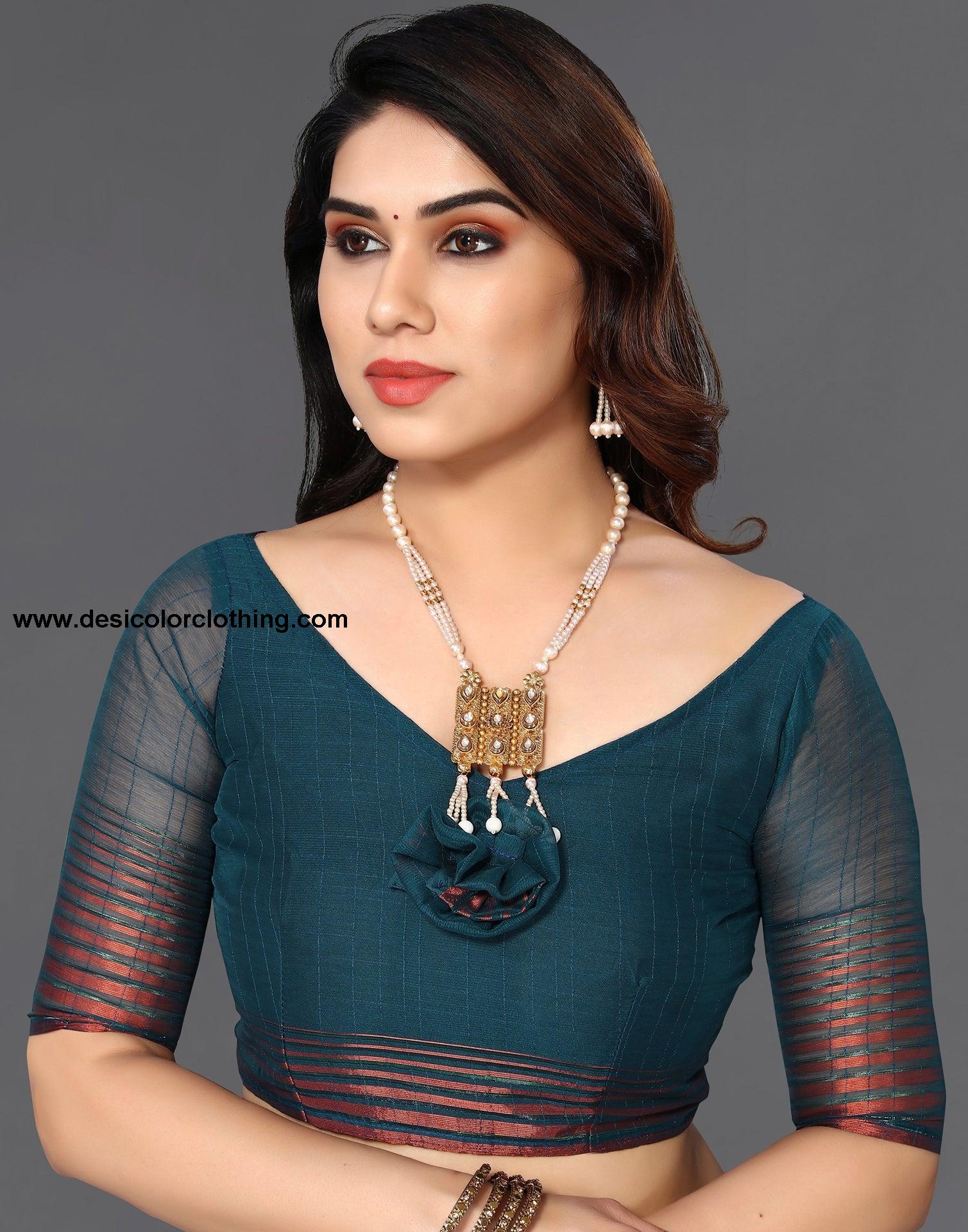 Blouse Color:Teal Blue Blouse Fabric:Chiffon Blouse Length:0.70 Mtr Blouse Work:Plain, Jari Stripes In Border Saree Color:Teal Blue Saree Fabric:Chiffon Saree Length:5.30 Mtr Saree Work:Plain