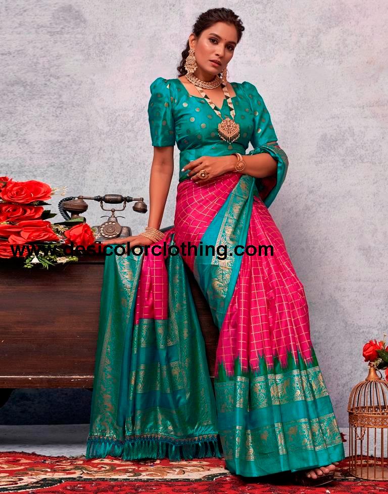 Blouse Color:Teal Blue, Golden Blouse Fabric:Dola Silk Blouse Length:0.80 Mtr Blouse Work:Plain, Foil Print Saree Color:Teal Blue, Magenta, Golden Saree Fabric:Dola Silk Saree Length:5.40 Mtr Saree Work:Printed, Foil Print, Tassels