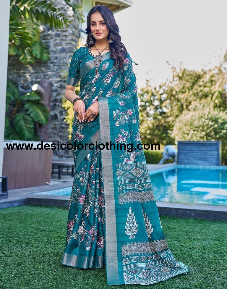 Blouse Color:Teal Blue, Cream Blouse Fabric:Silk Blouse Length:0.70 Mtr Blouse Work:Floral Printed, Zari Border Saree Color:Teal Blue, Cream Saree Fabric:Silk Saree Length:5.30 Mtr Saree Work:Floral Printed, Zari Border