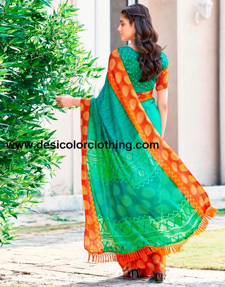 Blouse Color:Teal Green Blouse Fabric:Moss Blouse Length:0.70 Mtr Blouse Work:Floral Printed Saree Color:Teal Green, Orange Saree Fabric:Moss Saree Length:5.50 Mtr Saree Work:Geometric Printed