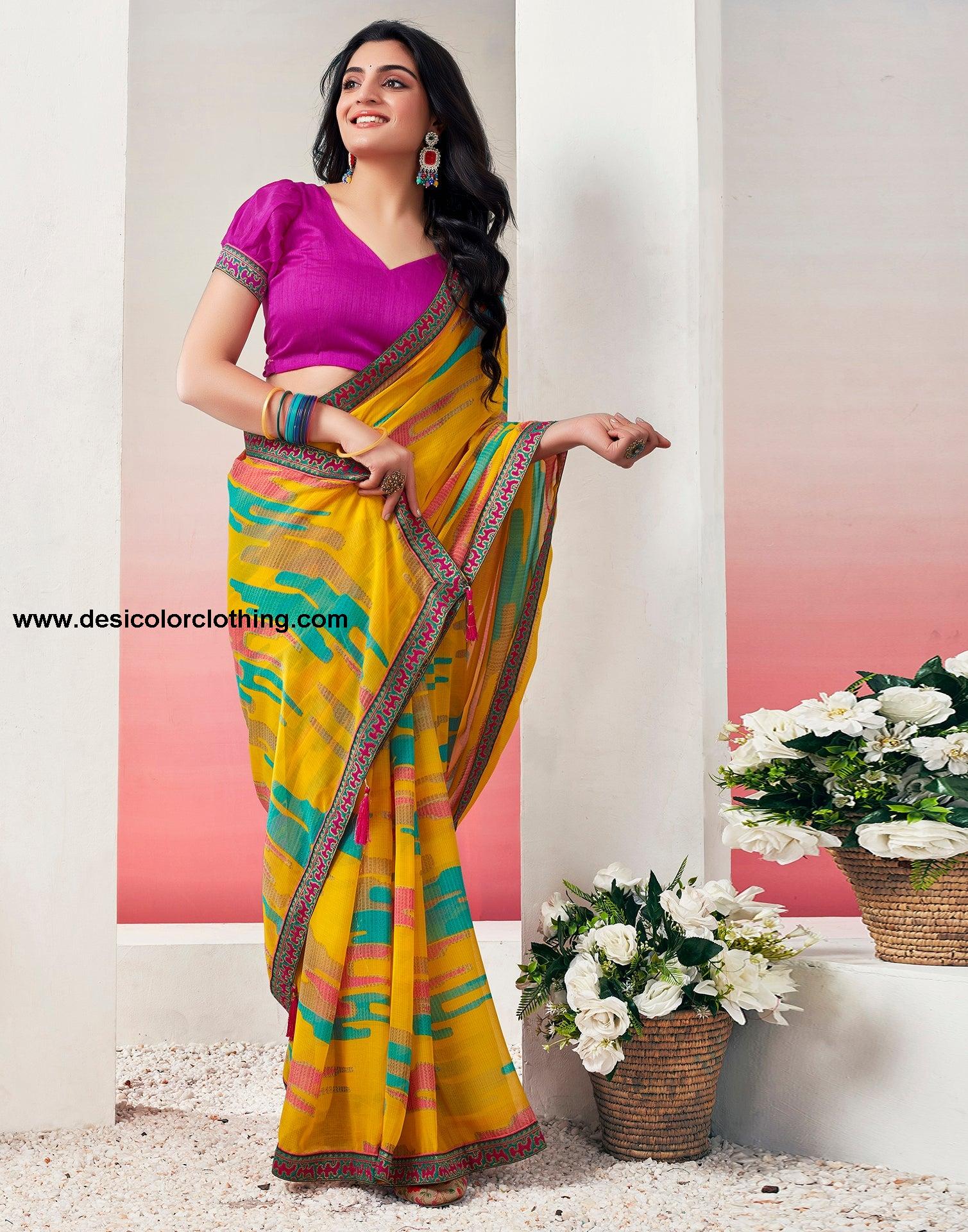 Blouse Color:Rani Pink Blouse Fabric:Plain Blouse Length:0.80 Mtr Blouse Work:Plain, Lace Saree Color:Turmeric, Multicoloured Saree Fabric:Chiffon Saree Length:5.50 Mtr Saree Work:Printed