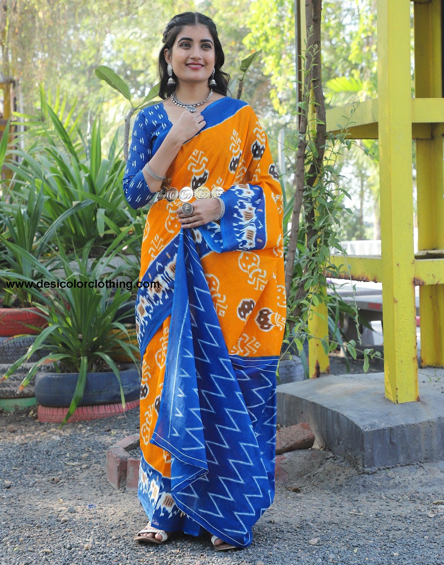 Blouse Color:Dark Blue, White Blouse Fabric:Printed Blouse Length:0.80 Mtr Blouse Work:Printed Saree Color:Turmeric, Dark Blue Saree Fabric:Cotton Saree Length:5.50 Mtr Saree Work:Printed