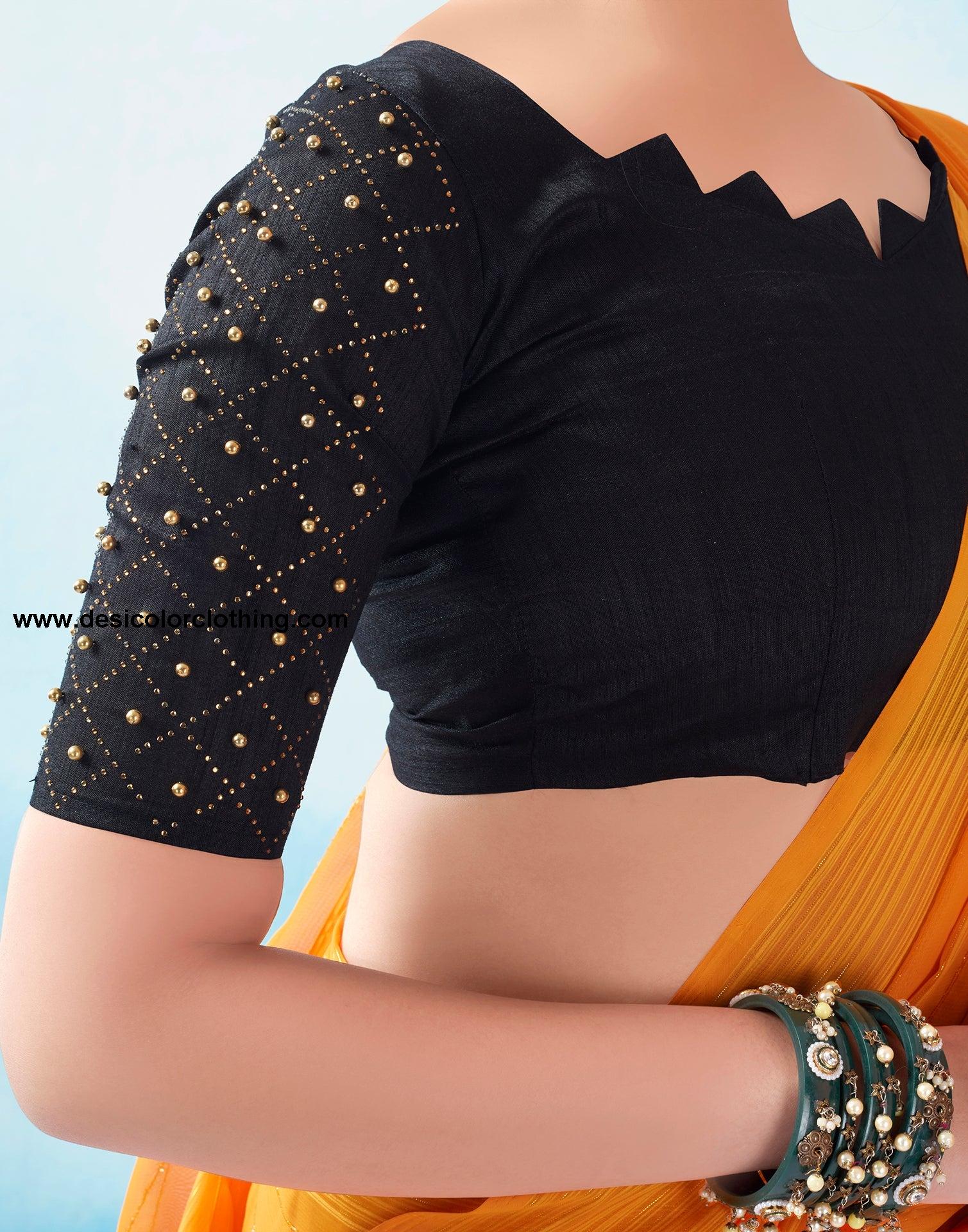 Blouse Color:Black Blouse Fabric:Plain Blouse Length:0.80 Mtr Blouse Work:Plain, Hot Fixing, Pearl Work Saree Color:Turmeric Saree Fabric:Georgette Saree Length:5.50 Mtr Saree Work:Plain