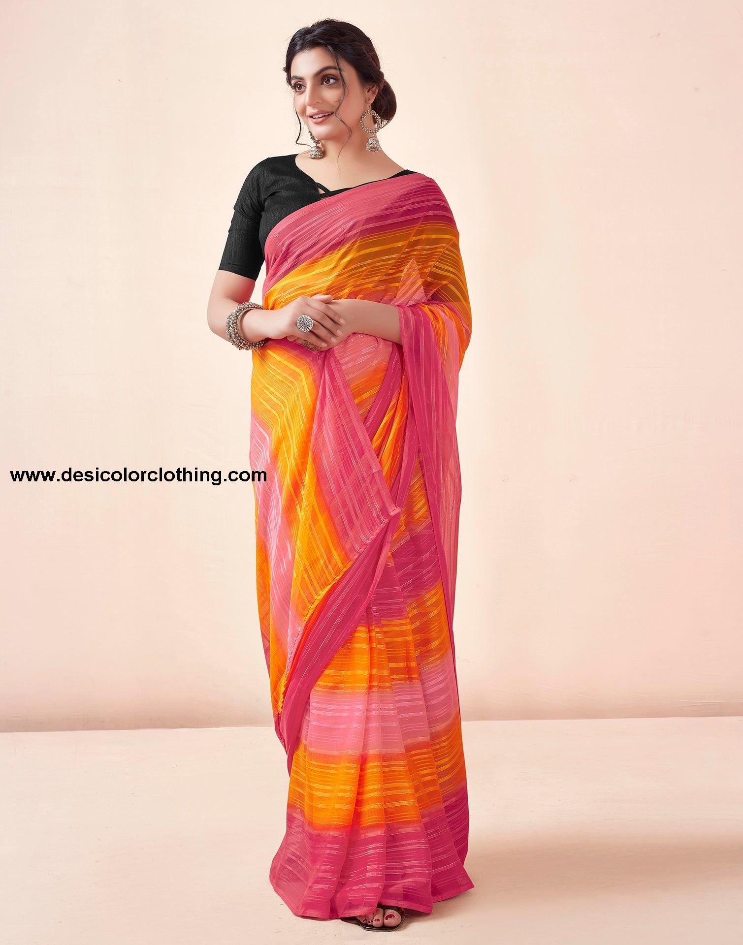Blouse Color:Black Blouse Fabric:Plain Blouse Length:0.80 Mtr Blouse Work:Plain Saree Color:Turmeric, Pink Saree Fabric:Georgette Saree Length:5.50 Mtr Saree Work:Printed