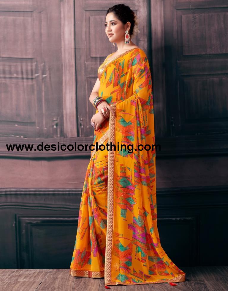 Blouse Color:Yellow Blouse Fabric:Plain Blouse Length:0.80 Mtr Blouse Work:Plain, Lace Saree Color:Turmeric Saree Fabric:Georgette Saree Length:5.50 Mtr Saree Work:Printed