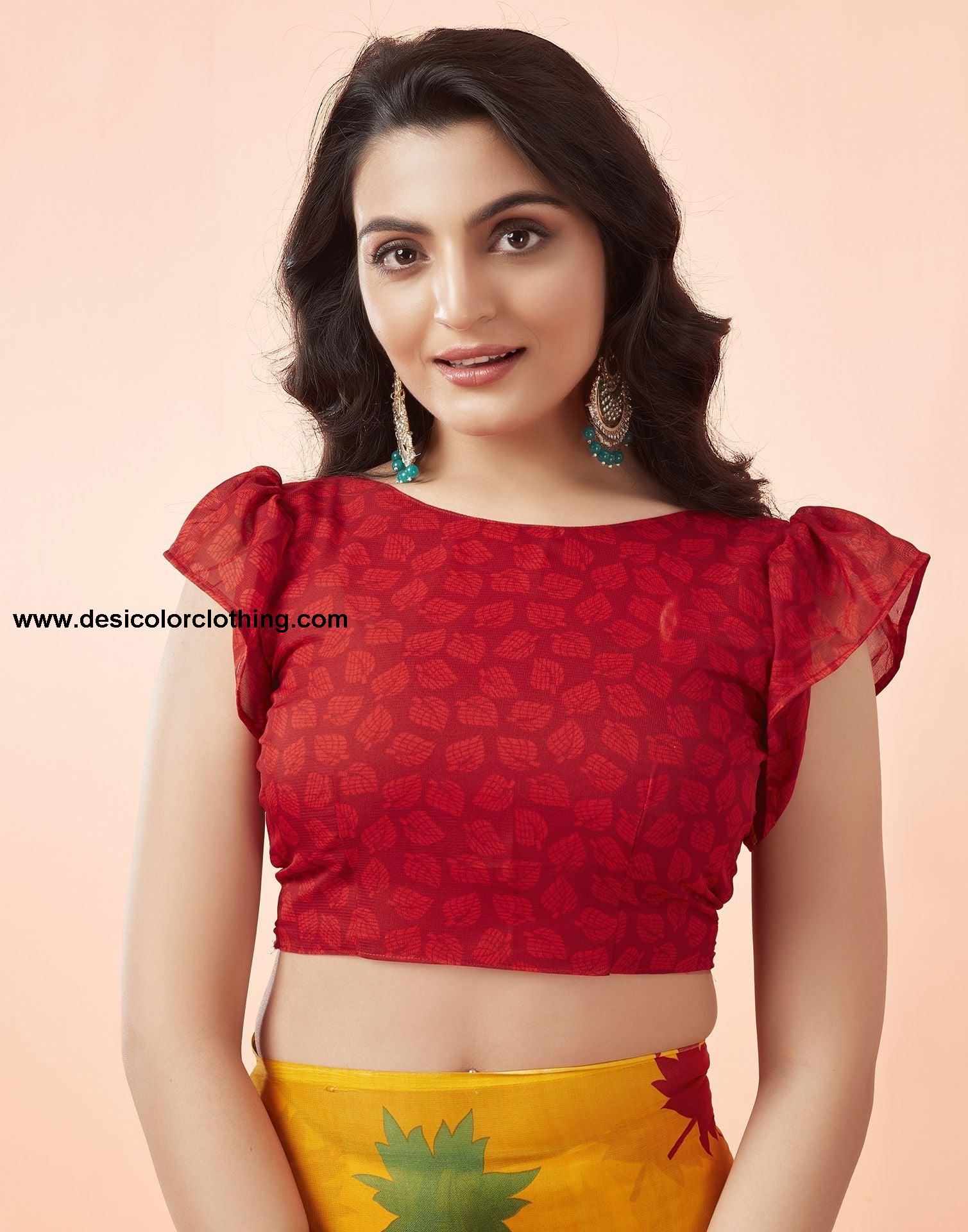 Blouse Color:Red Blouse Fabric:Georgette Blouse Length:0.70 Mtr Blouse Work:Printed Saree Color:Turmeric Yellow Saree Fabric:Georgette Saree Length:5.30 Mtr Saree Work:Floral Printed