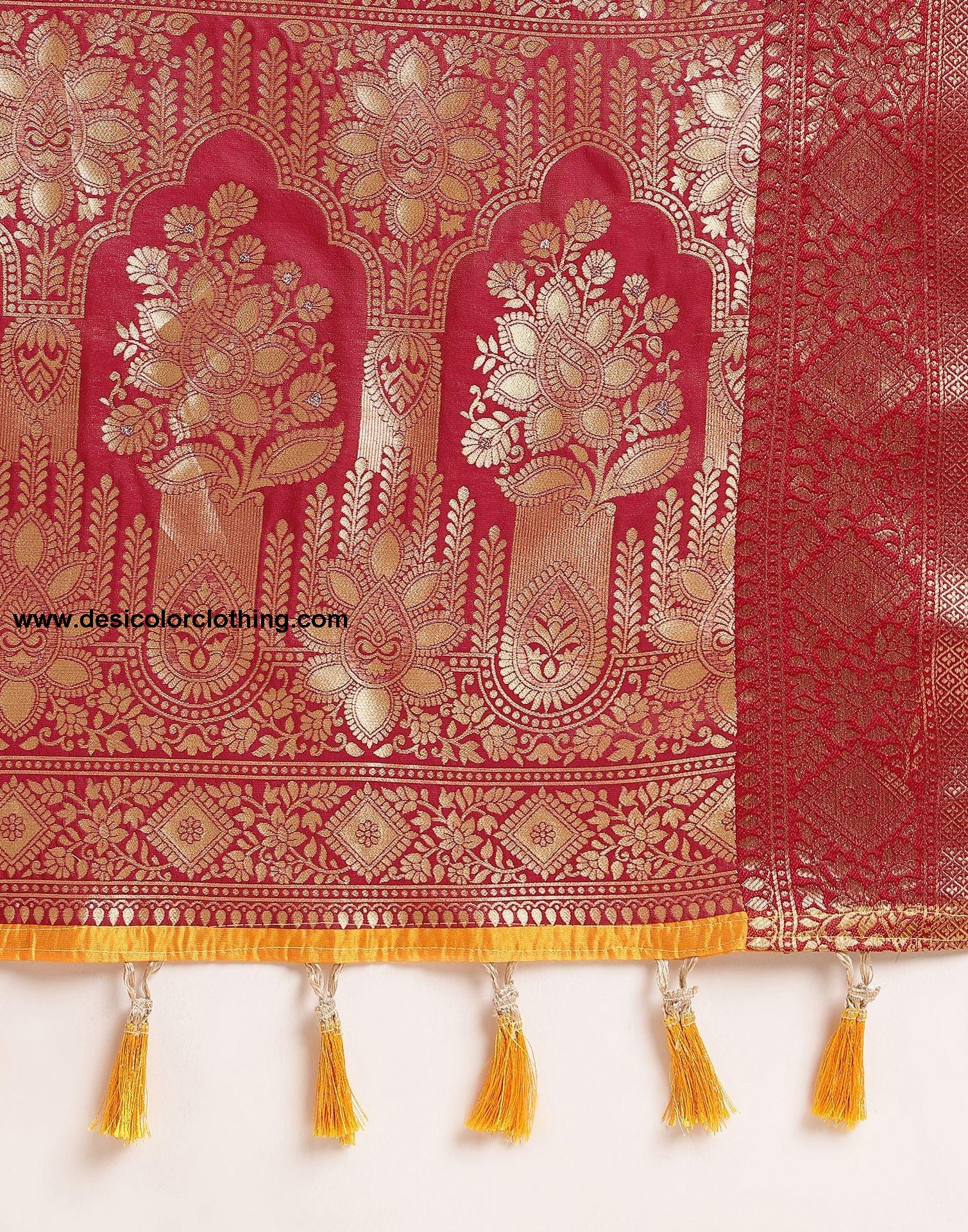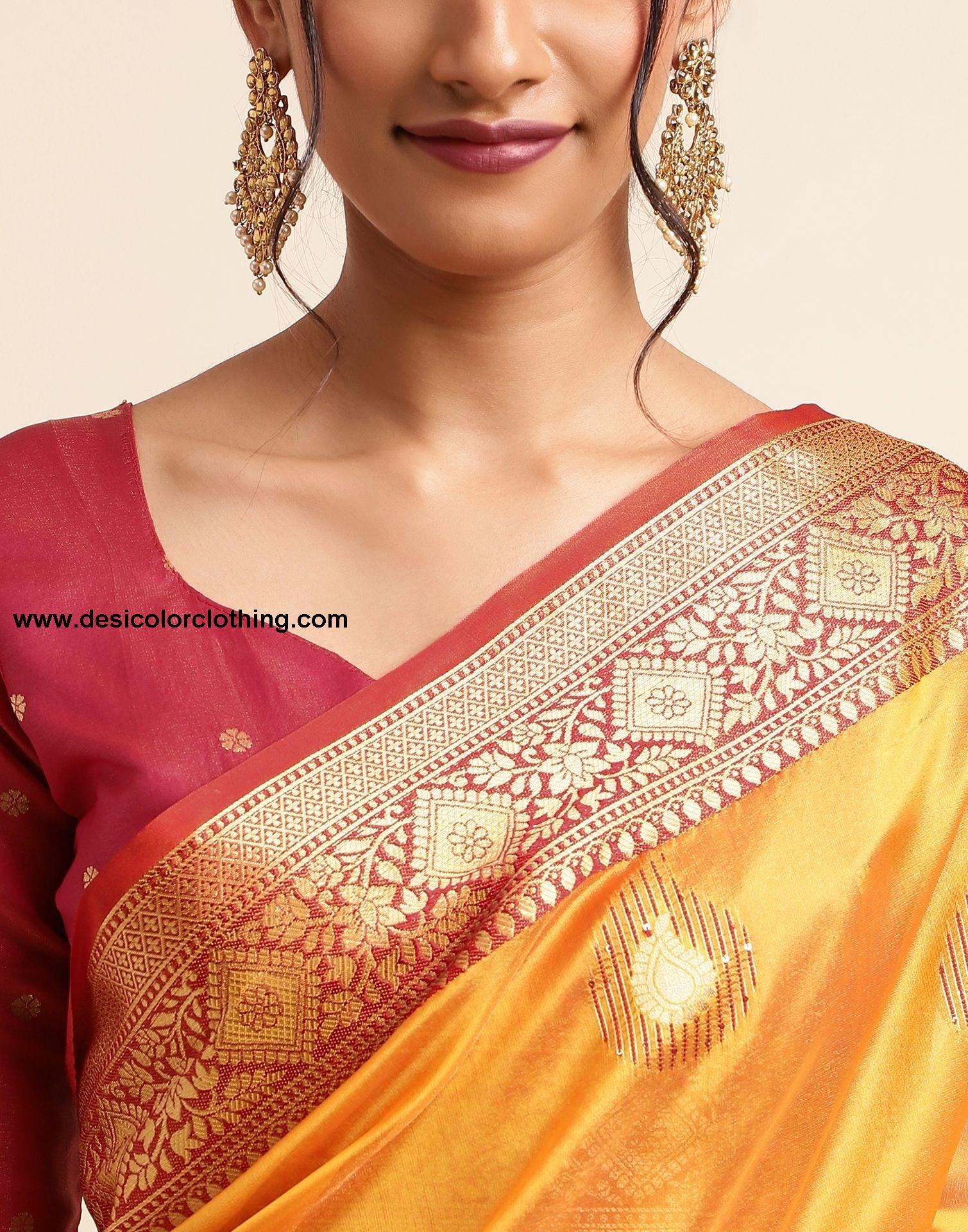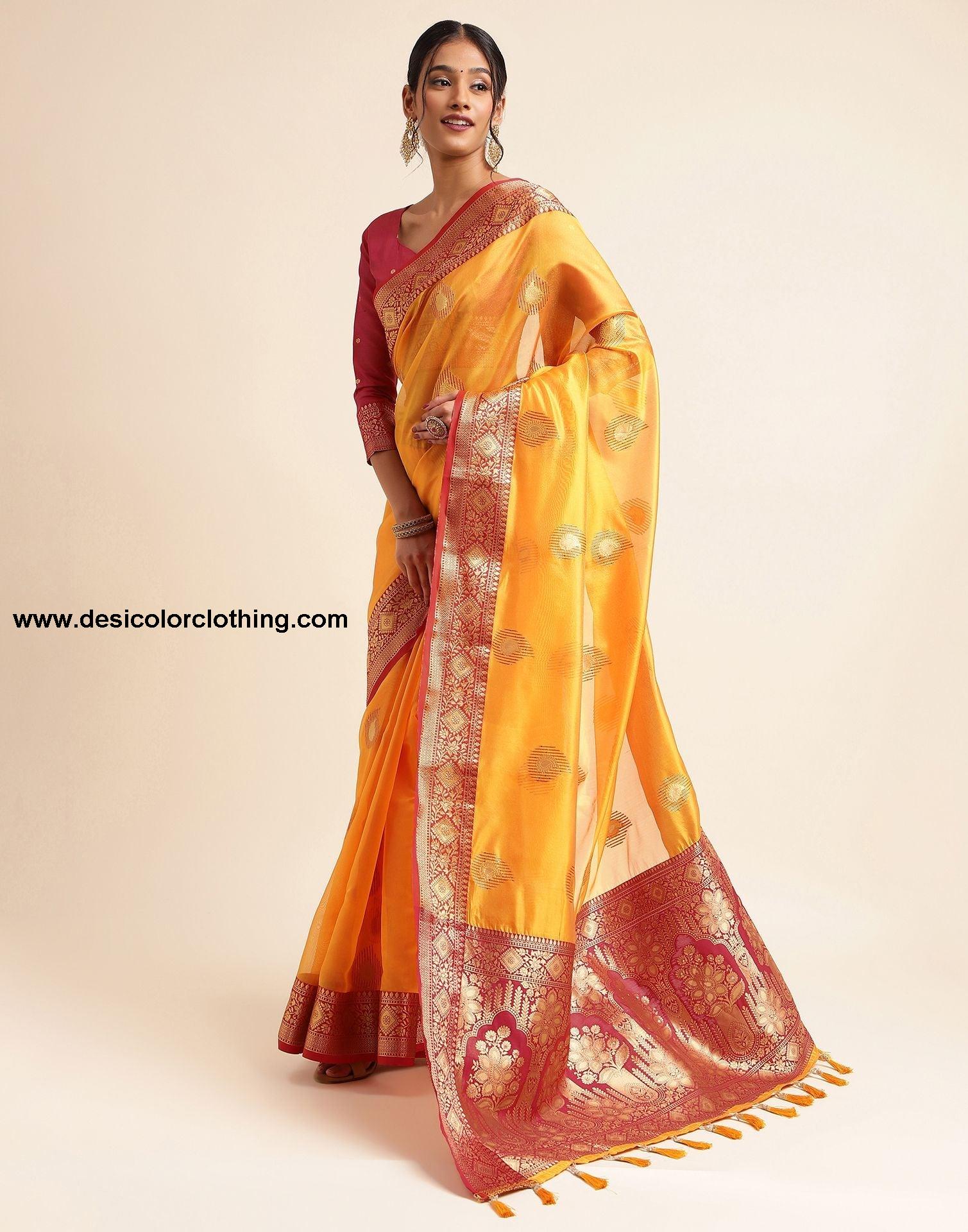 Blouse Color:Maroon Blouse Fabric:Silk Blouse Length:0.80 Mtr Blouse Work:Jacquard Saree Color:Turmeric Yellow, Gold Saree Fabric:Tissue Silk Saree Length:5.50 Mtr Saree Work:Banarasi Jacquard, Tassel Type:Banarasi