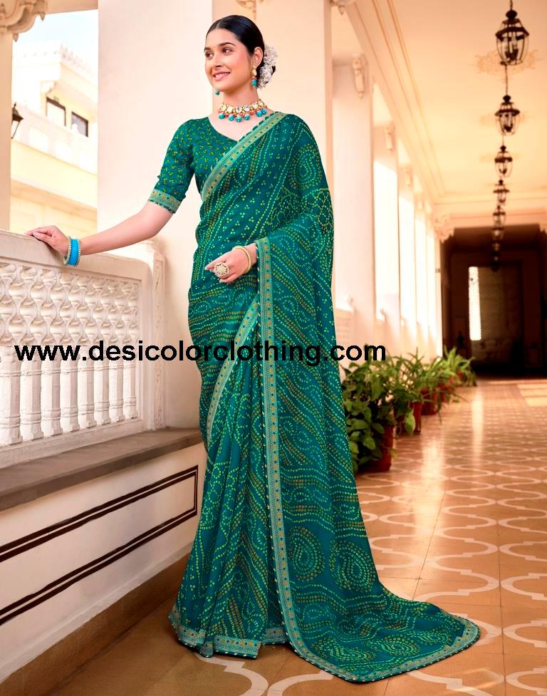 Blouse Color:Tourquise, Multi Blouse Fabric:Dola Silk Blouse Length:0.80 Mtr Blouse Work:Bandhani Printed, Lace Saree Color:Tourquise, Multi Saree Fabric:Chiffon Saree Length:5.30 Mtr Saree Work:Bandhani Printed, Lace
