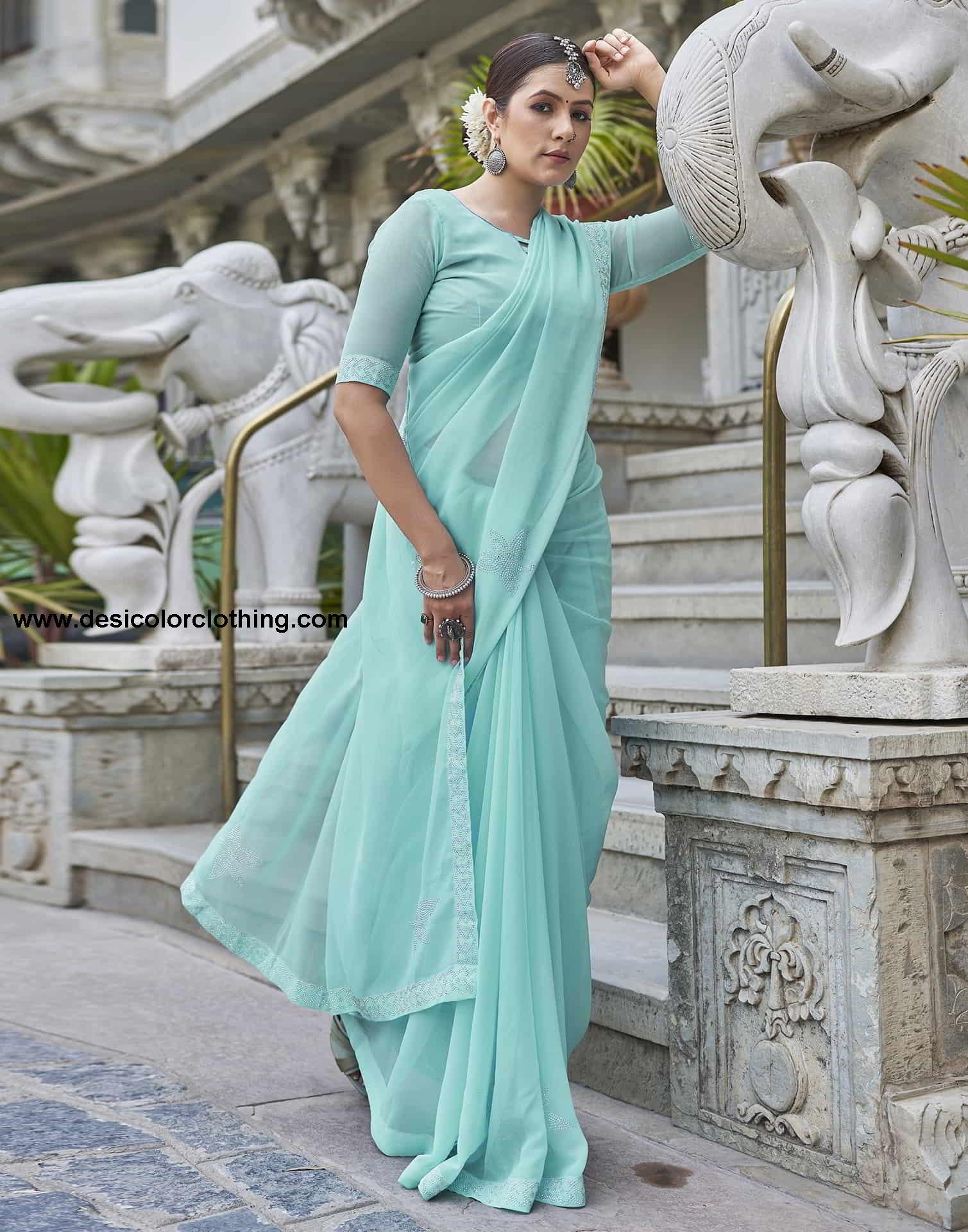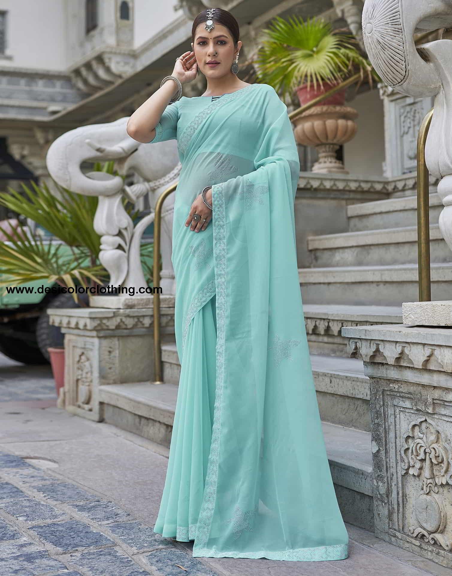 Blouse Color:Pale Turquoise Blouse Fabric:Georgette Blouse Length:0.80 Mtr Blouse Work:Plain, Stone Work Saree Color:Pale Turquoise, Silver Saree Fabric:Georgette Saree Length:5.50 Mtr Saree Work:Plain, Stone Work Type:Embellished