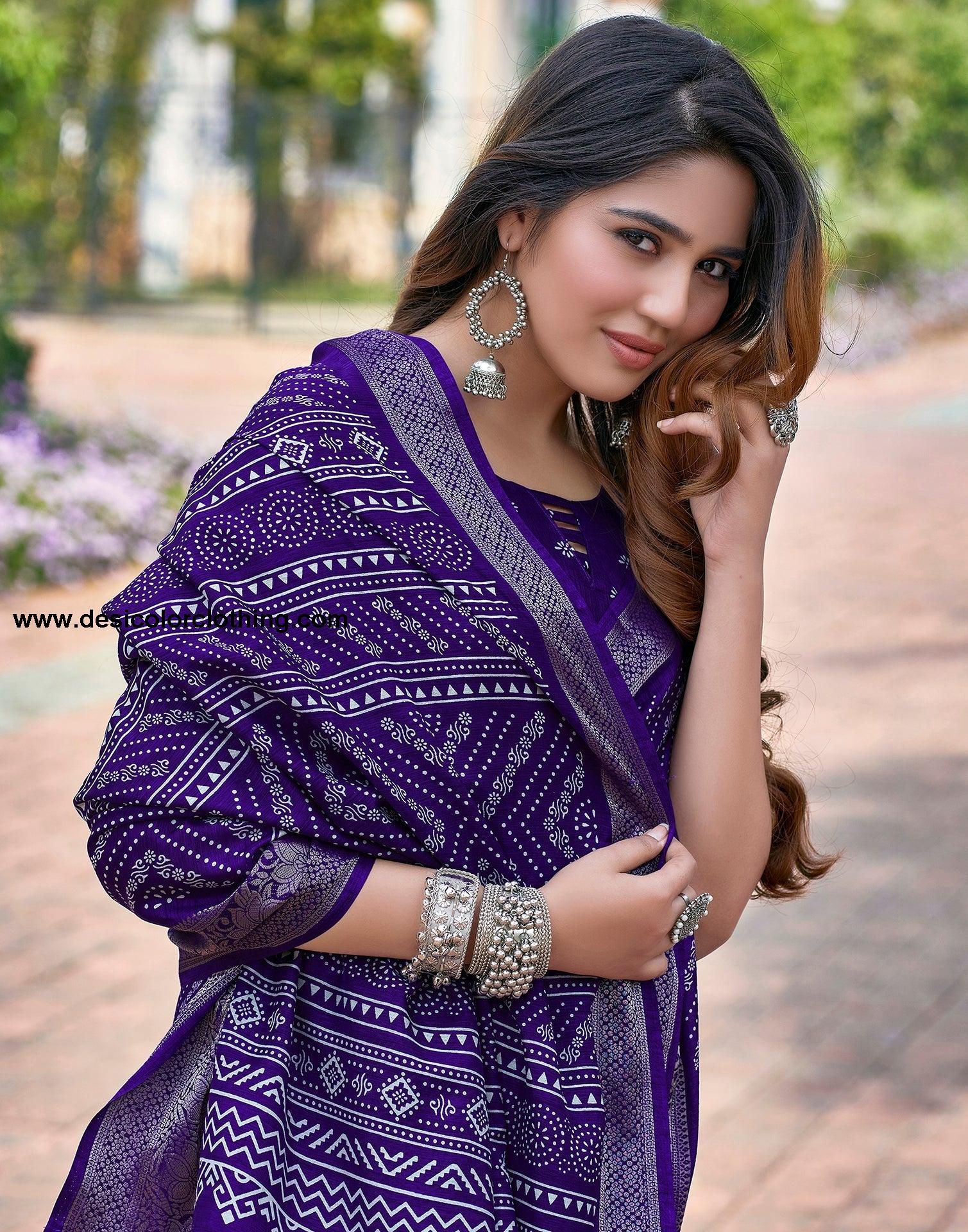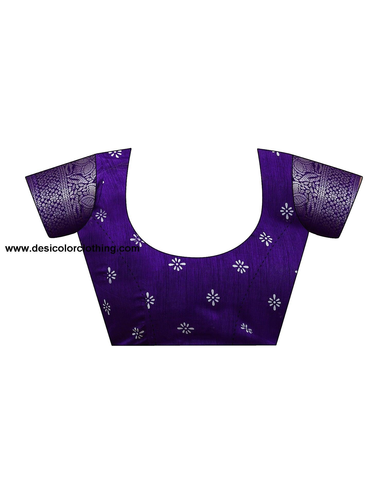Blouse Color:Voilet, White Blouse Fabric:Printed Blouse Length:0.70 Mtr Blouse Work:Printed, Weaving Border Saree Color:Voilet, White Saree Fabric:Dola Silk Saree Length:5.50 Mtr Saree Work:Printed