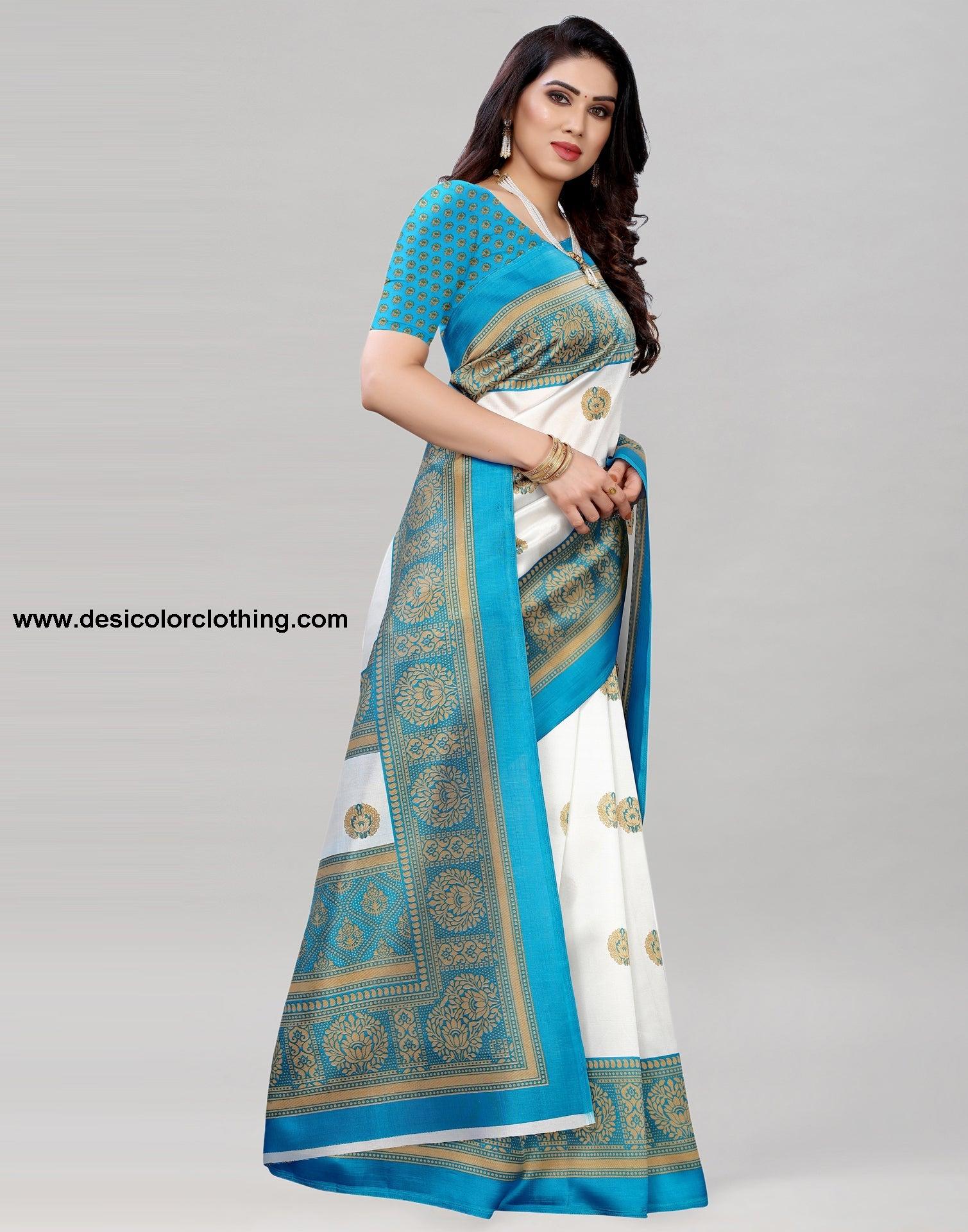 Blouse Color:Sky Blue Blouse Fabric:Poly Silk Blouse Length:0.70 Mtr Blouse Work:Printed Saree Color:White Saree Fabric:Poly Silk Saree Length:5.30 Mtr Saree Work:Printed Type:Banarasi