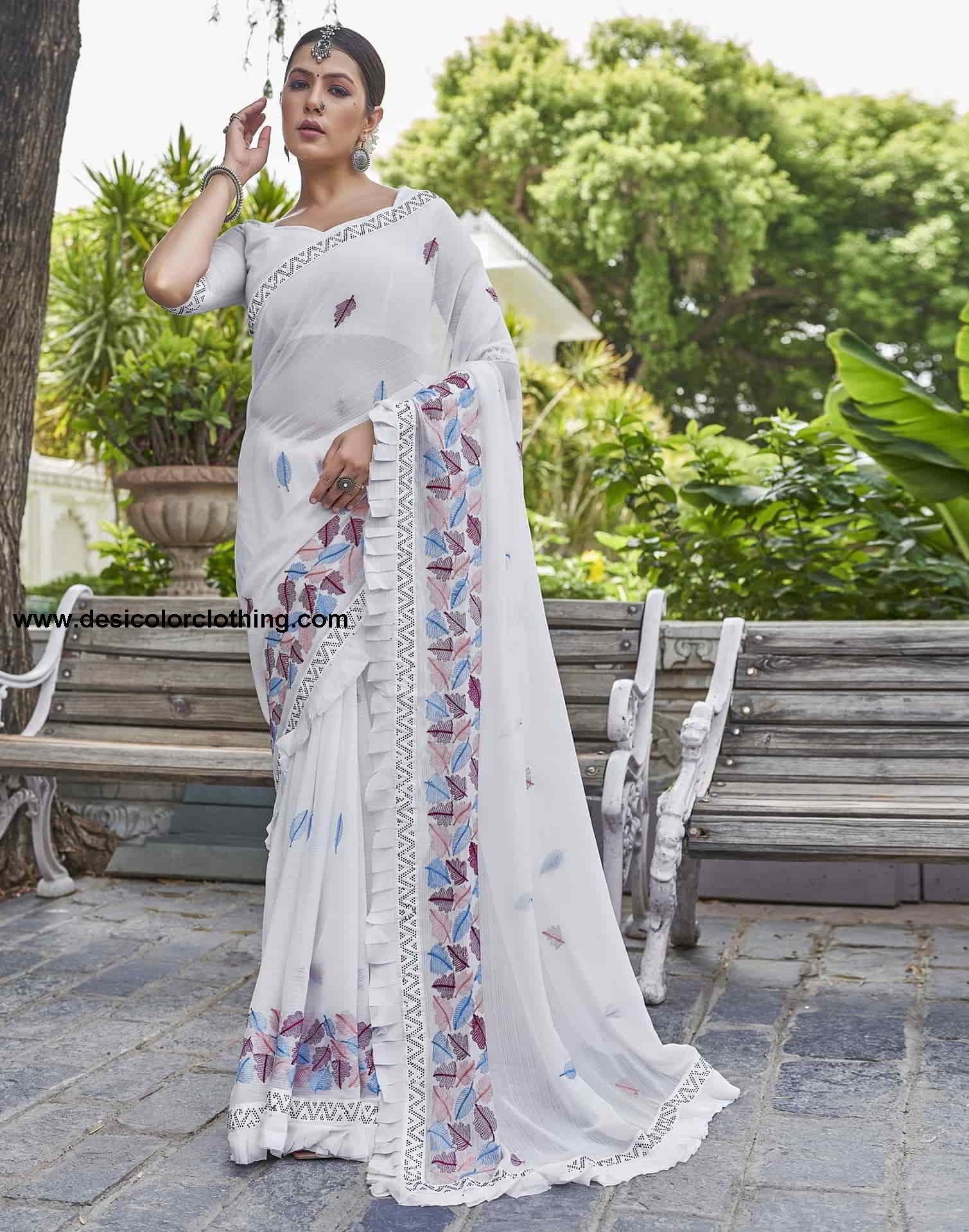 Blouse Color:White Blouse Fabric:Georgette Blouse Length:0.80 Mtr Blouse Work:Plain, Stone Work Saree Color:White, Multi Saree Fabric:Georgette Saree Length:5.50 Mtr Saree Work:Plain, Embroidery, Stone Work Border, Ruffle Lace Type:Embroidery