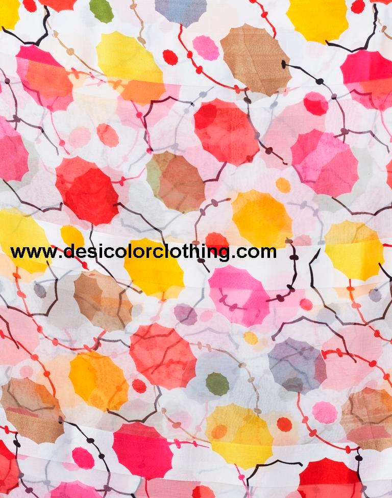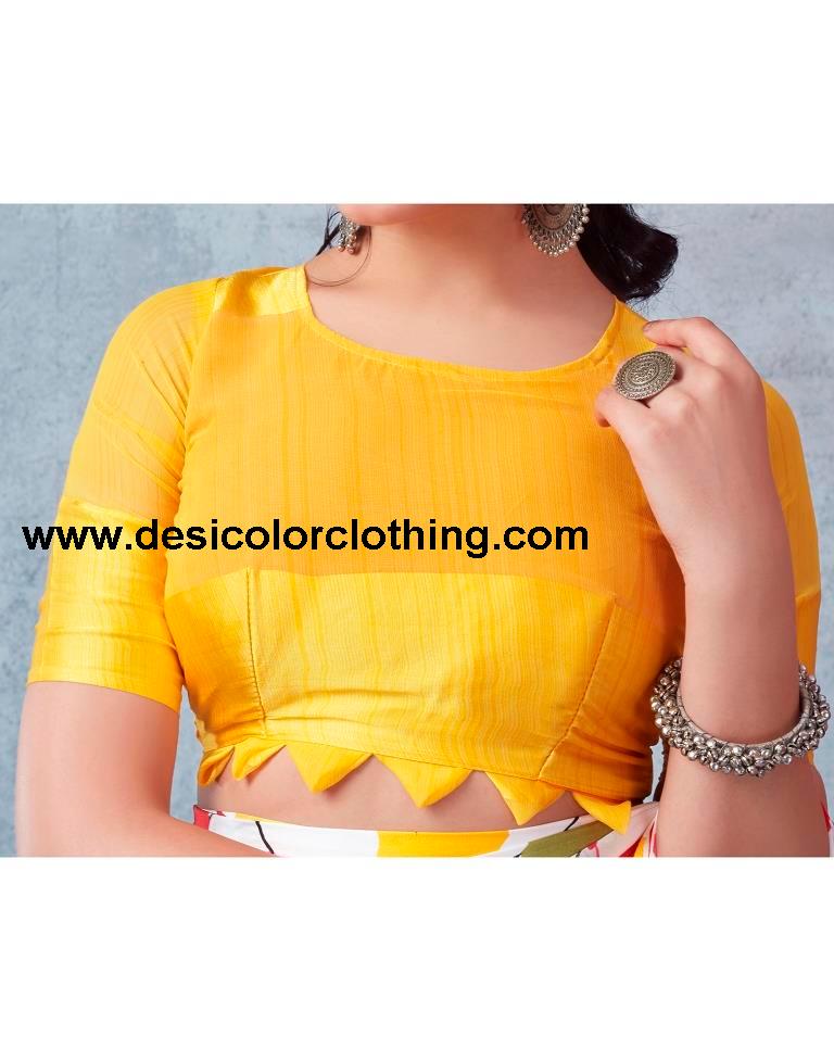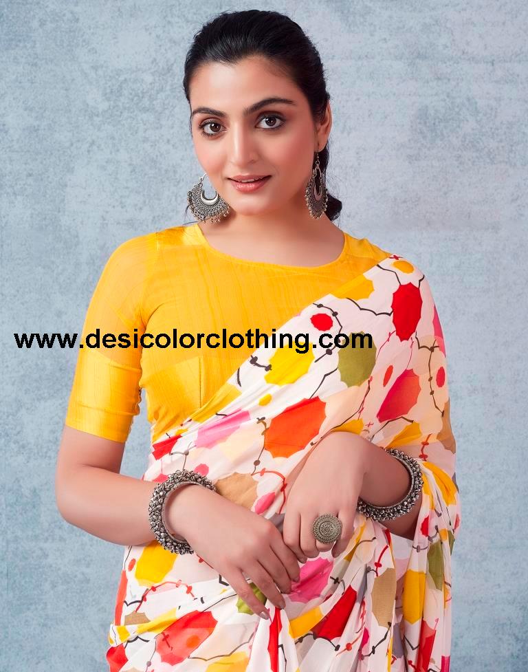 Blouse Color:Yellow Blouse Fabric:Georgette Blouse Length:0.80 Mtr Blouse Work:Printed, Satin Patta Saree Color:White, Multi Saree Fabric:Georgette Saree Length:5.50 Mtr Saree Work:Geometric Printed, Satin Patta