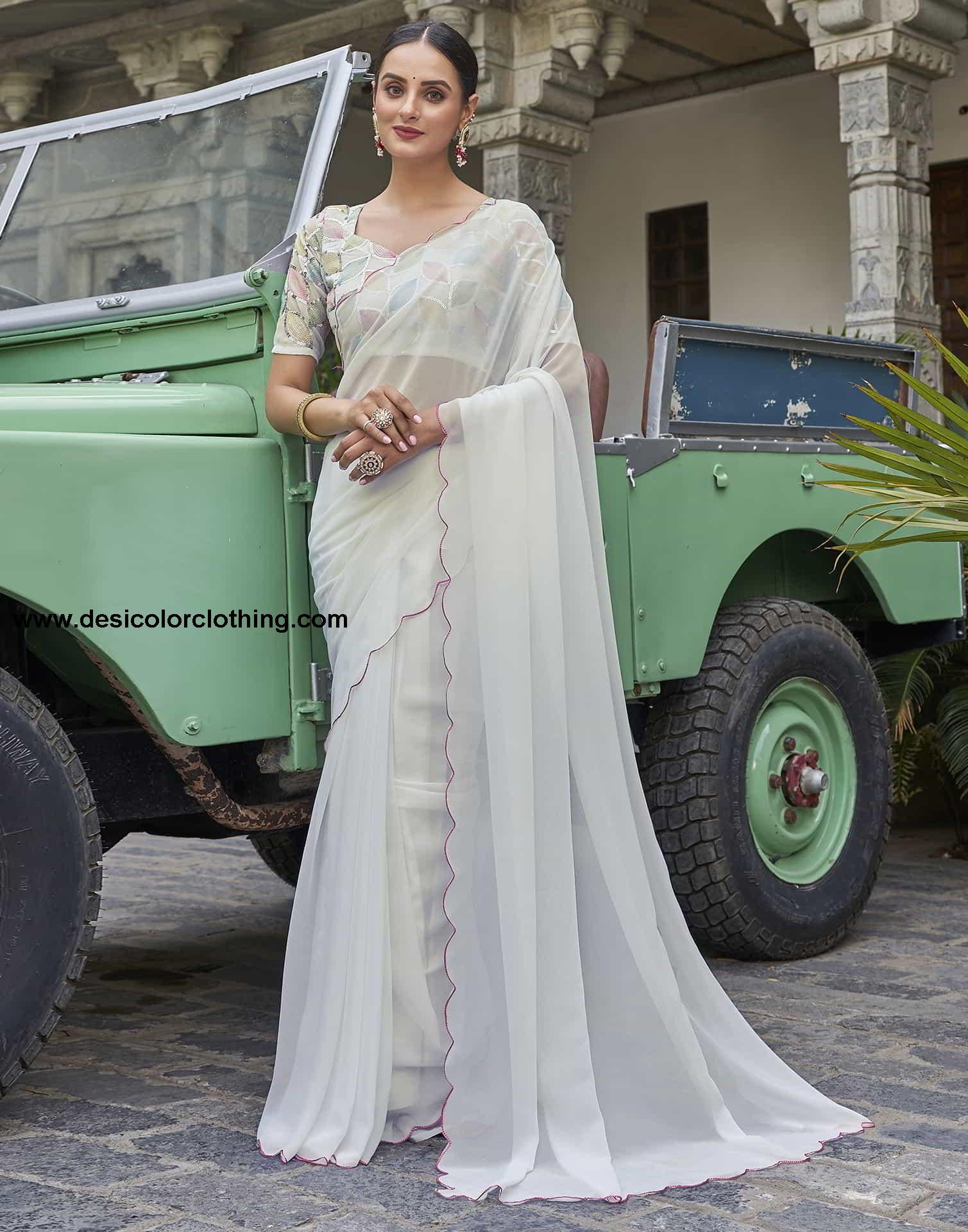 Blouse Color:White, Multi Blouse Fabric:Georgette Blouse Length:0.80 Mtr Blouse Work:Plain, Sequence Embroidery Work Saree Color:White Saree Fabric:Georgette Saree Length:5.30 Mtr Saree Work:Plain, Cut Work Border Type:Plain