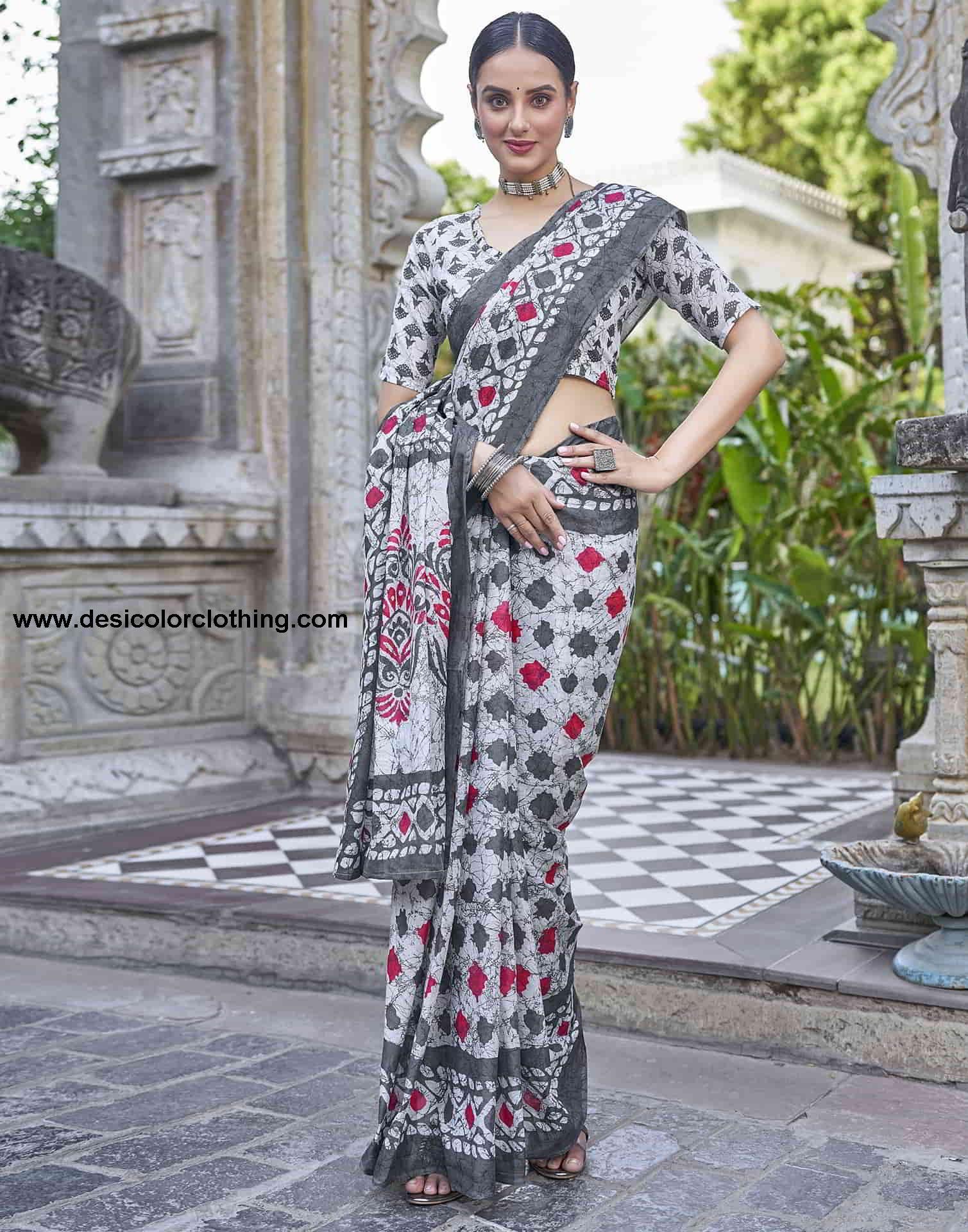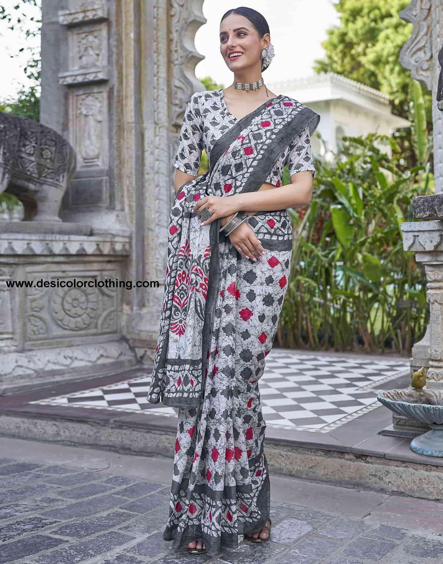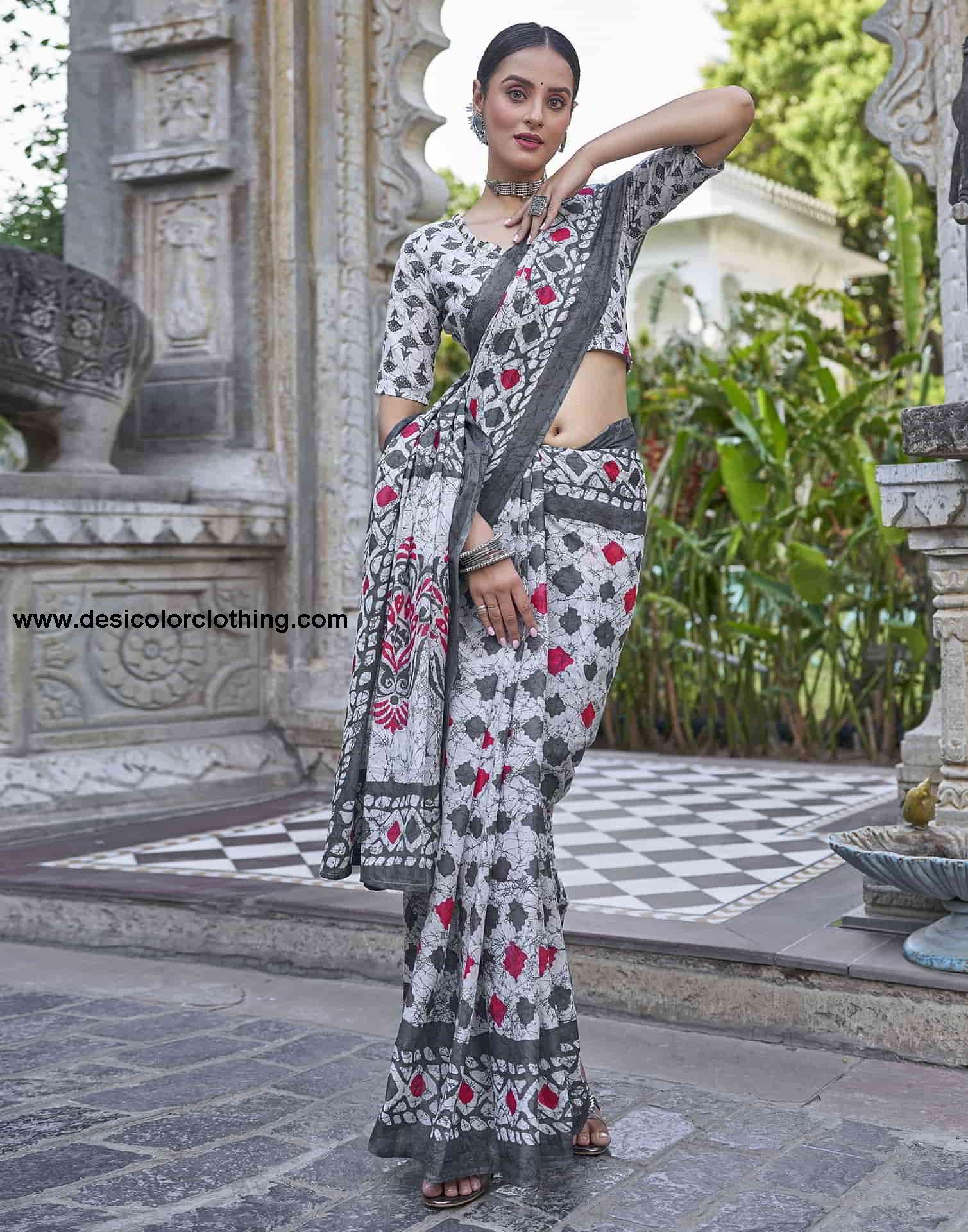 Blouse Color:White, Grey Blouse Fabric:Cotton Blouse Length:0.70 Mtr Blouse Work:Geometric Printed Saree Color:White, Grey, Red Saree Fabric:Cotton Saree Length:5.30 Mtr Saree Work:Floral And Geometric Printed Type:Printed