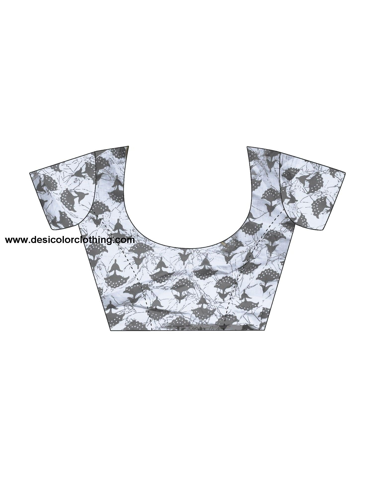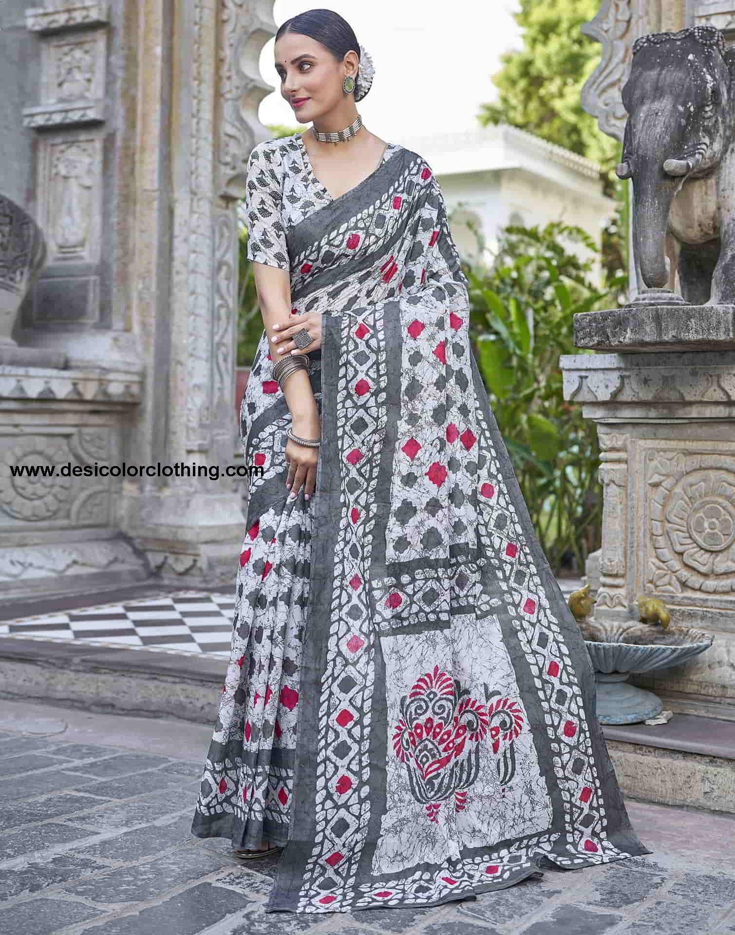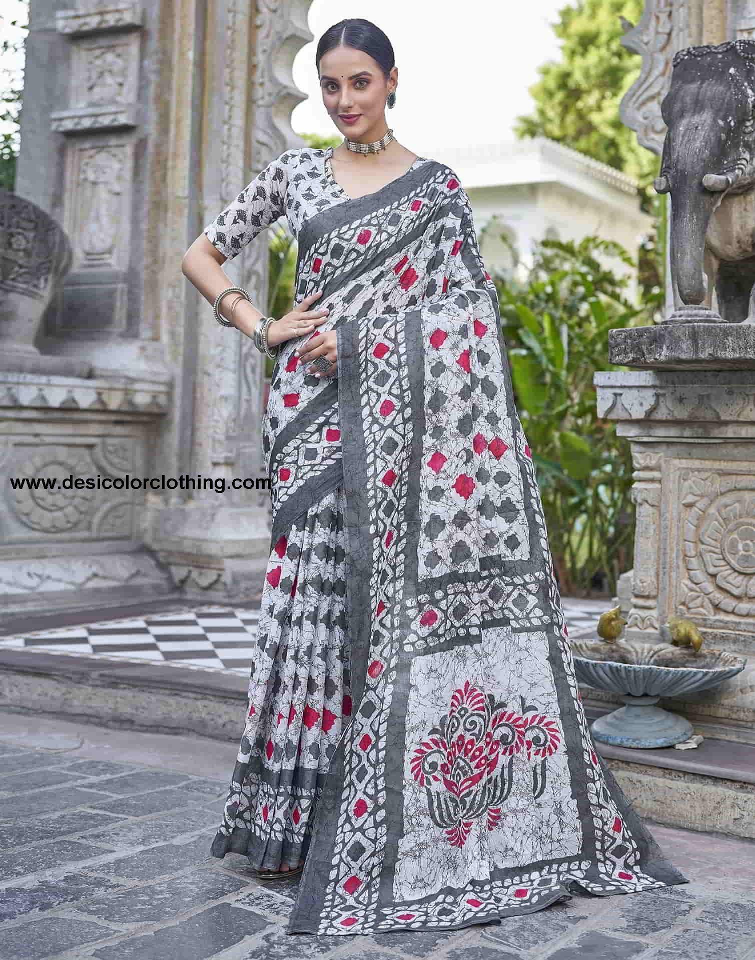 Blouse Color:White, Grey Blouse Fabric:Cotton Blouse Length:0.70 Mtr Blouse Work:Geometric Printed Saree Color:White, Grey, Red Saree Fabric:Cotton Saree Length:5.30 Mtr Saree Work:Floral And Geometric Printed Type:Printed