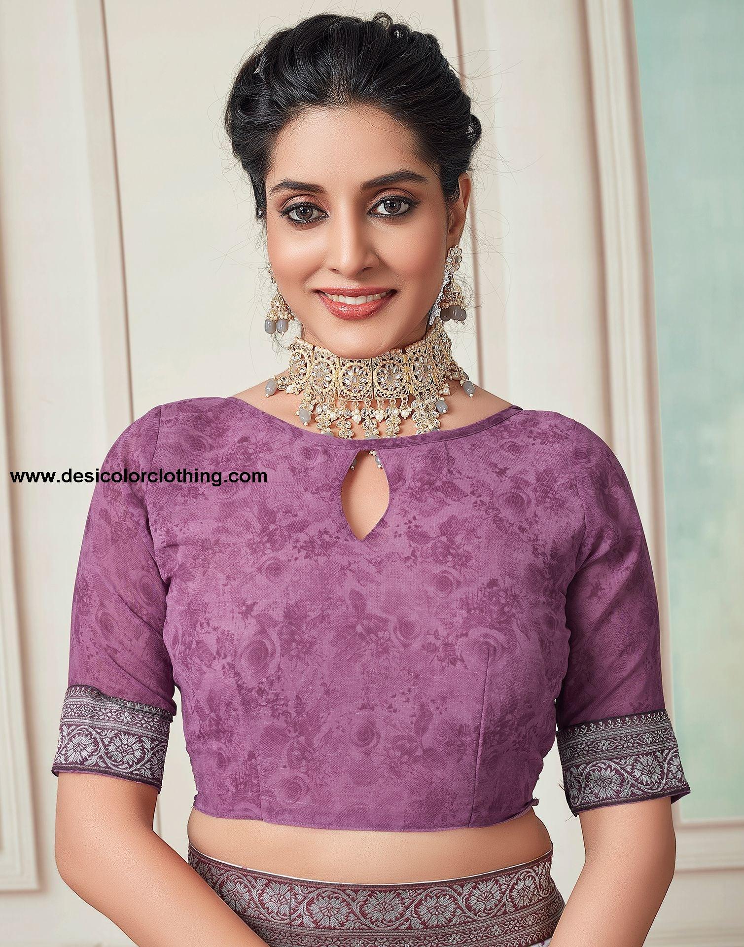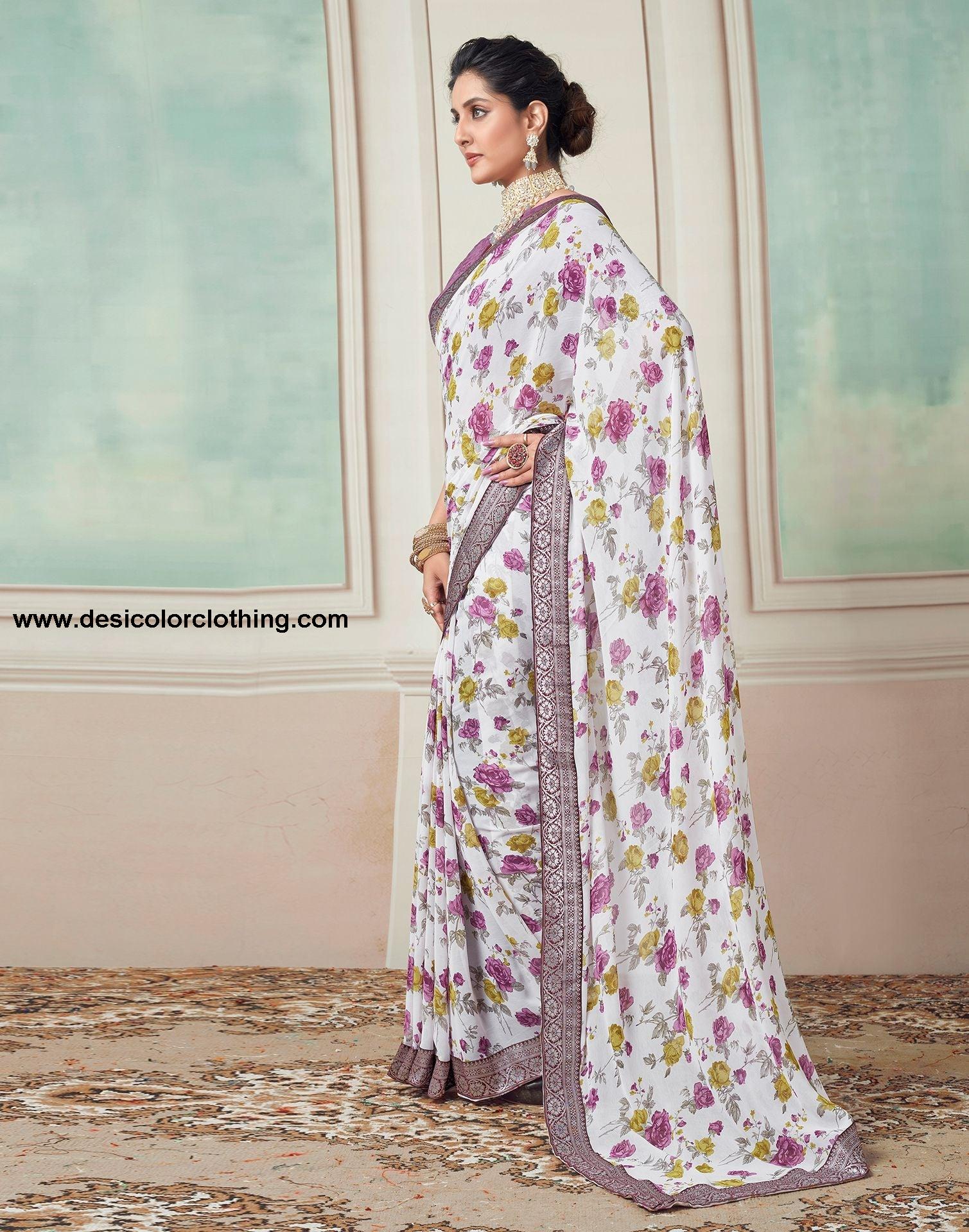 Blouse Color:Purple Blouse Fabric:Georgette Blouse Length:0.80 Mtr Blouse Work:Printed Saree Color:White, Purple, Multicoloured Saree Fabric:Georgette Saree Length:0.80 Mtr Saree Work:Floral Printed