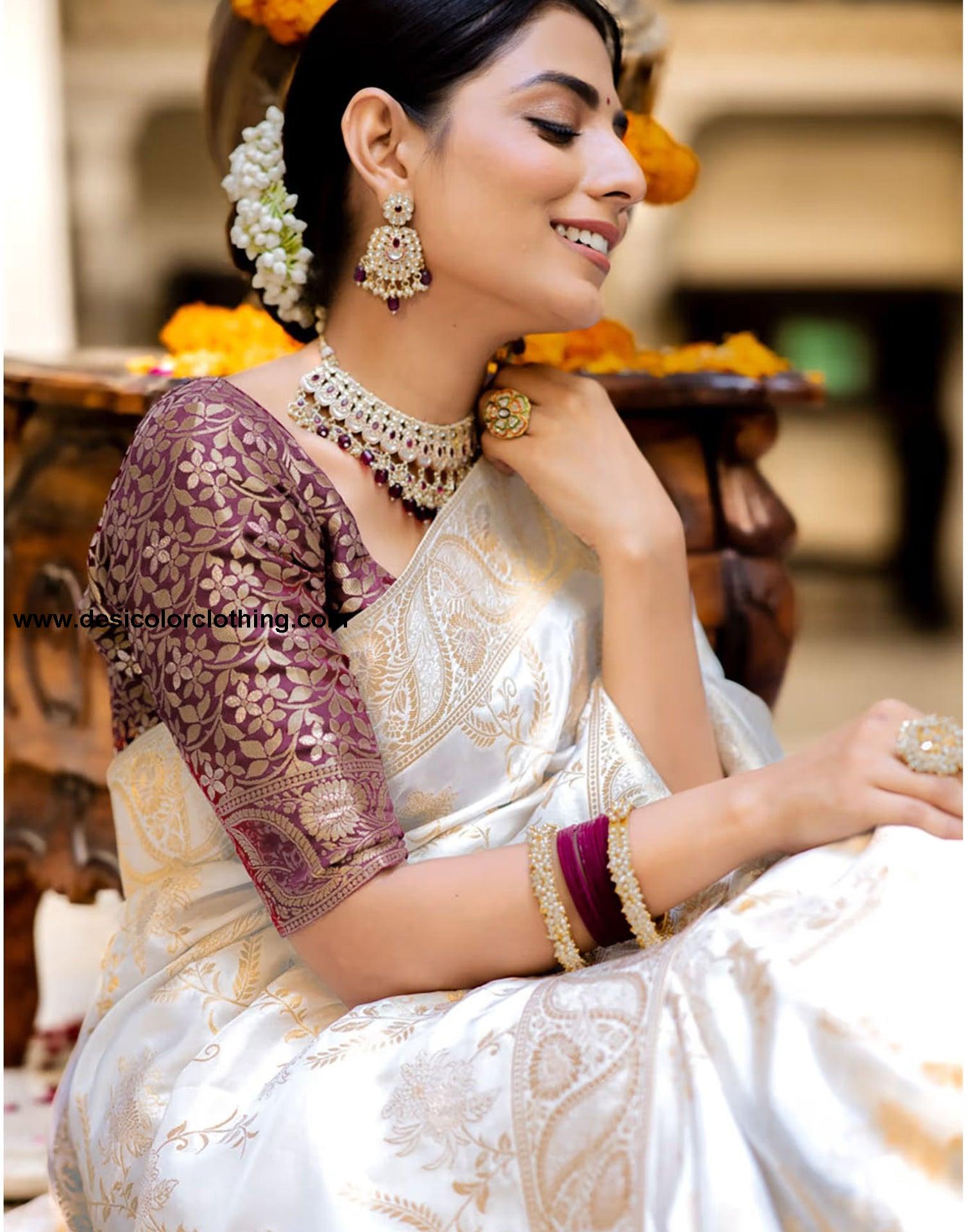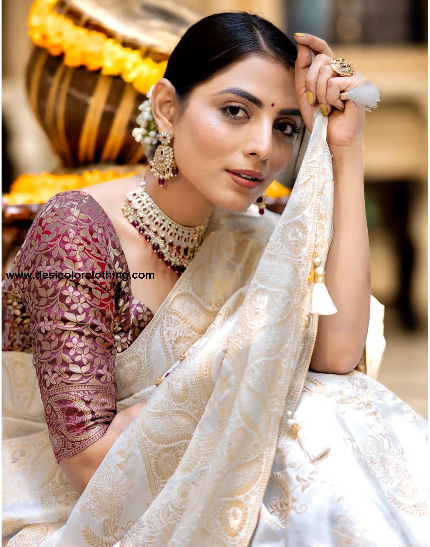 Blouse Color:Dark Pink, Golden, Silver Blouse Fabric:Plain Blouse Length:0.80 Mtr Blouse Work:Plain, Weaving Saree Color:White Saree Fabric:Art Silk Saree Length:5.50 Mtr Saree Work:Plain