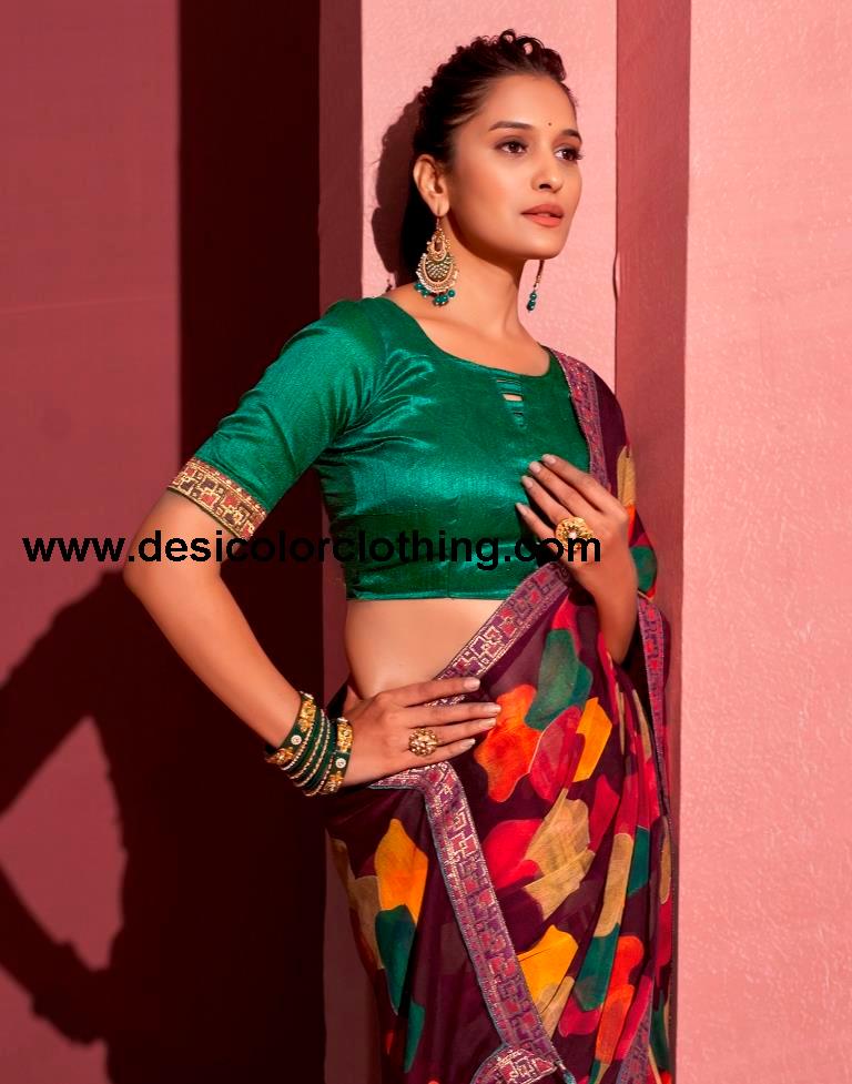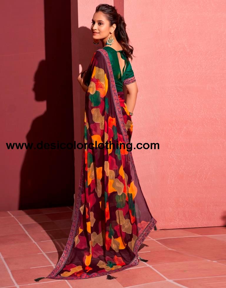 Blouse Color:Dark Green Blouse Fabric:Bhagalpuri Silk Blouse Length:0.80 Mtr Blouse Work:Plain, Lace Saree Color:Wine, Multi Saree Fabric:Chiffon Saree Length:5.50 Mtr Saree Work:Printed, Lace, Tassels