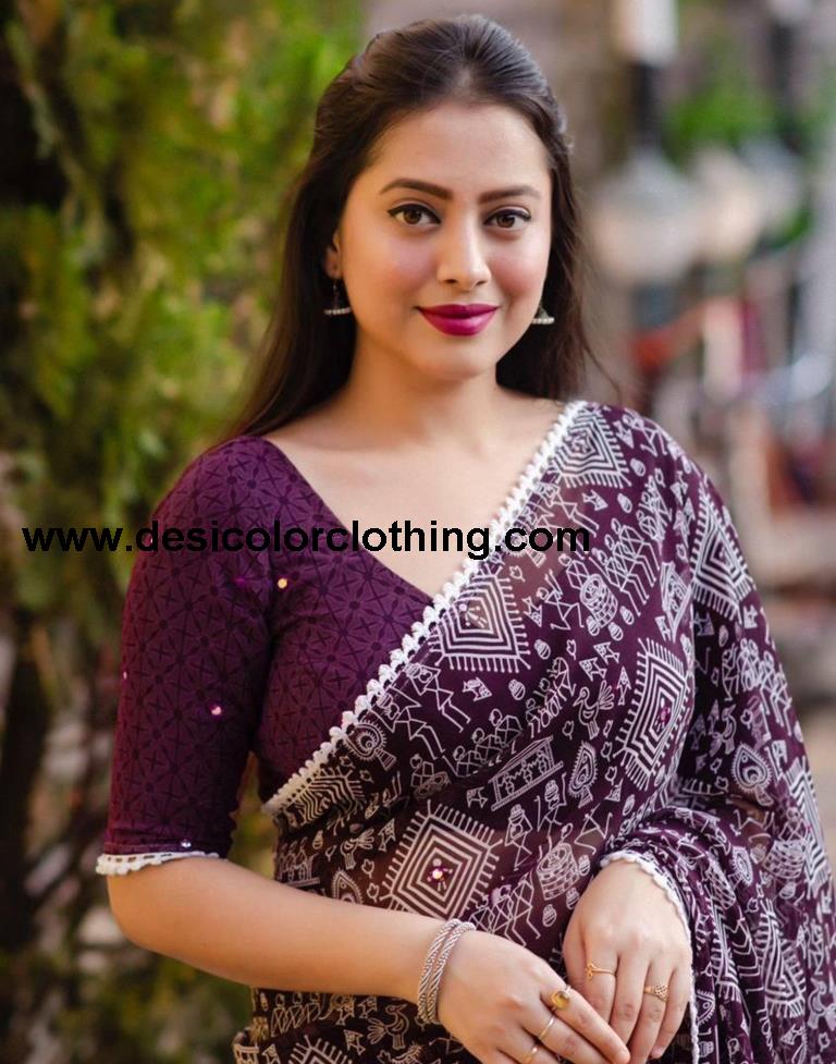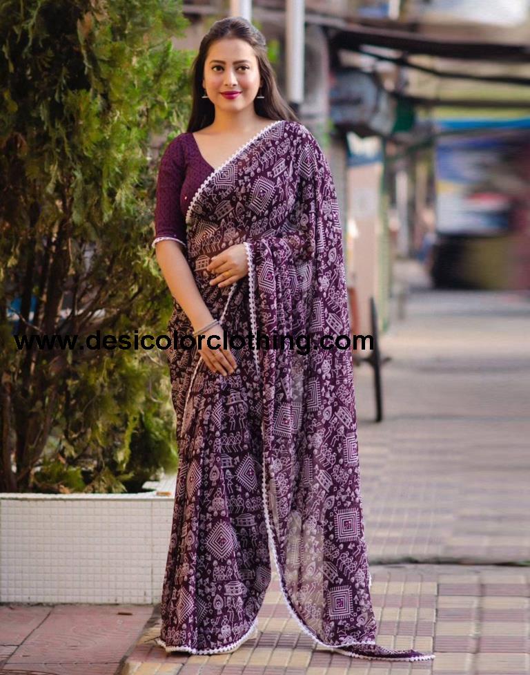 Blouse Color:Wine, Cream Blouse Fabric:Georgette Blouse Length:0.75 Mtr Blouse Work:Printed, Lace Saree Color:Wine Saree Fabric:Georgette Saree Length:5.30 Mtr Saree Work:Printed