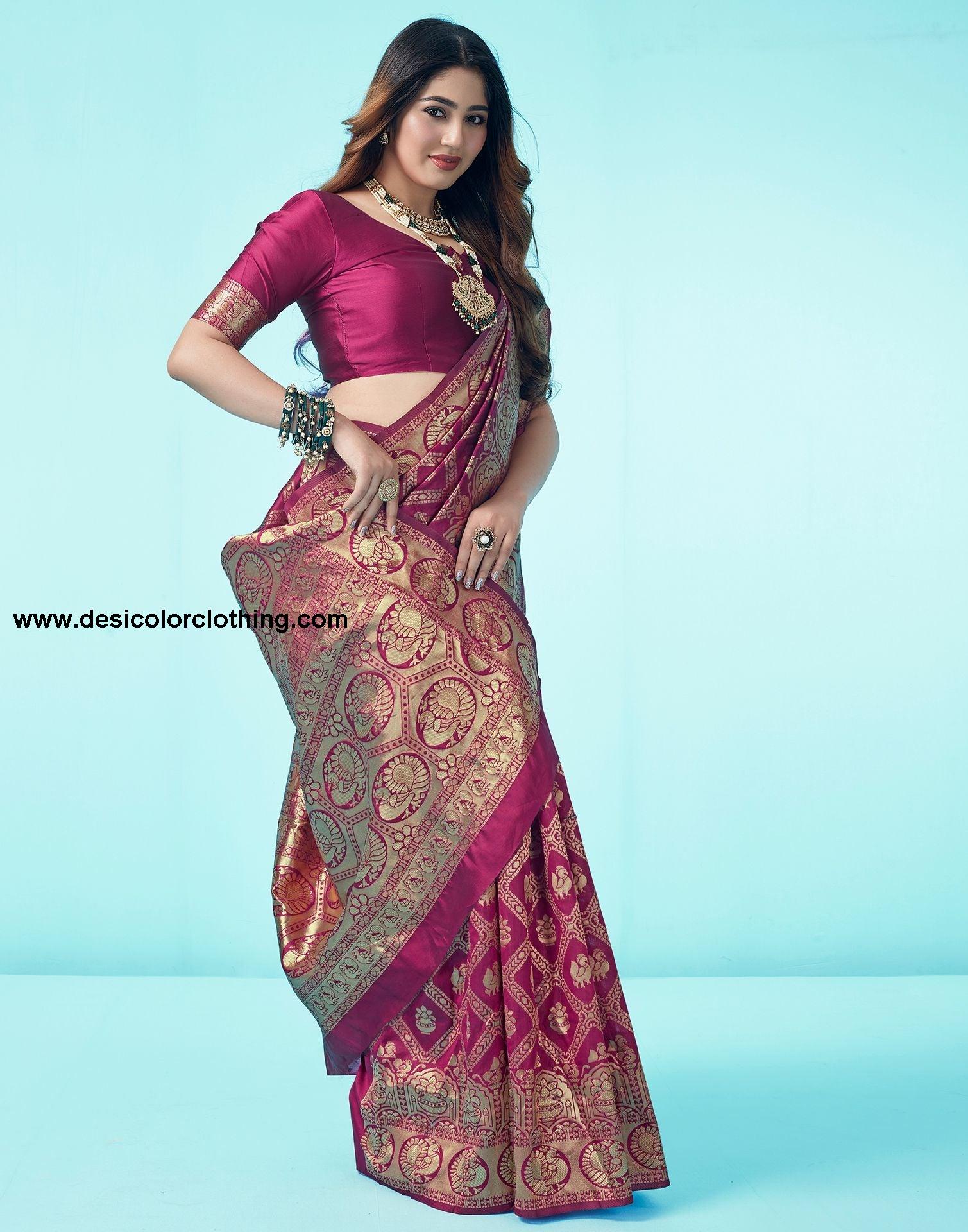 Blouse Color:Wine Blouse Fabric:Poly Silk Blouse Length:0.80 Mtr Blouse Work:Plain, Jacquard Border Saree Color:Wine, Gold Saree Fabric:Art Silk Saree Length:5.30 Mtr Saree Work:Banarasi Jacquard
