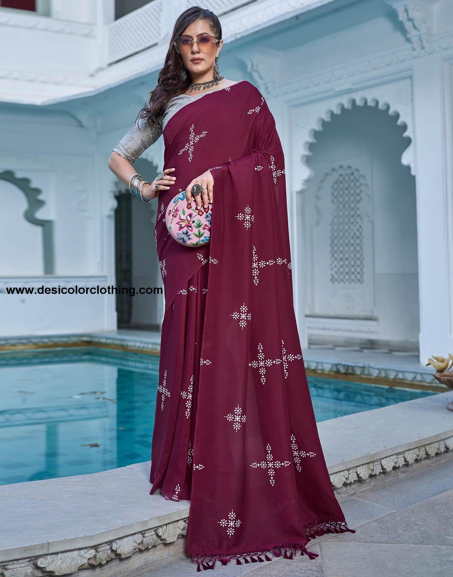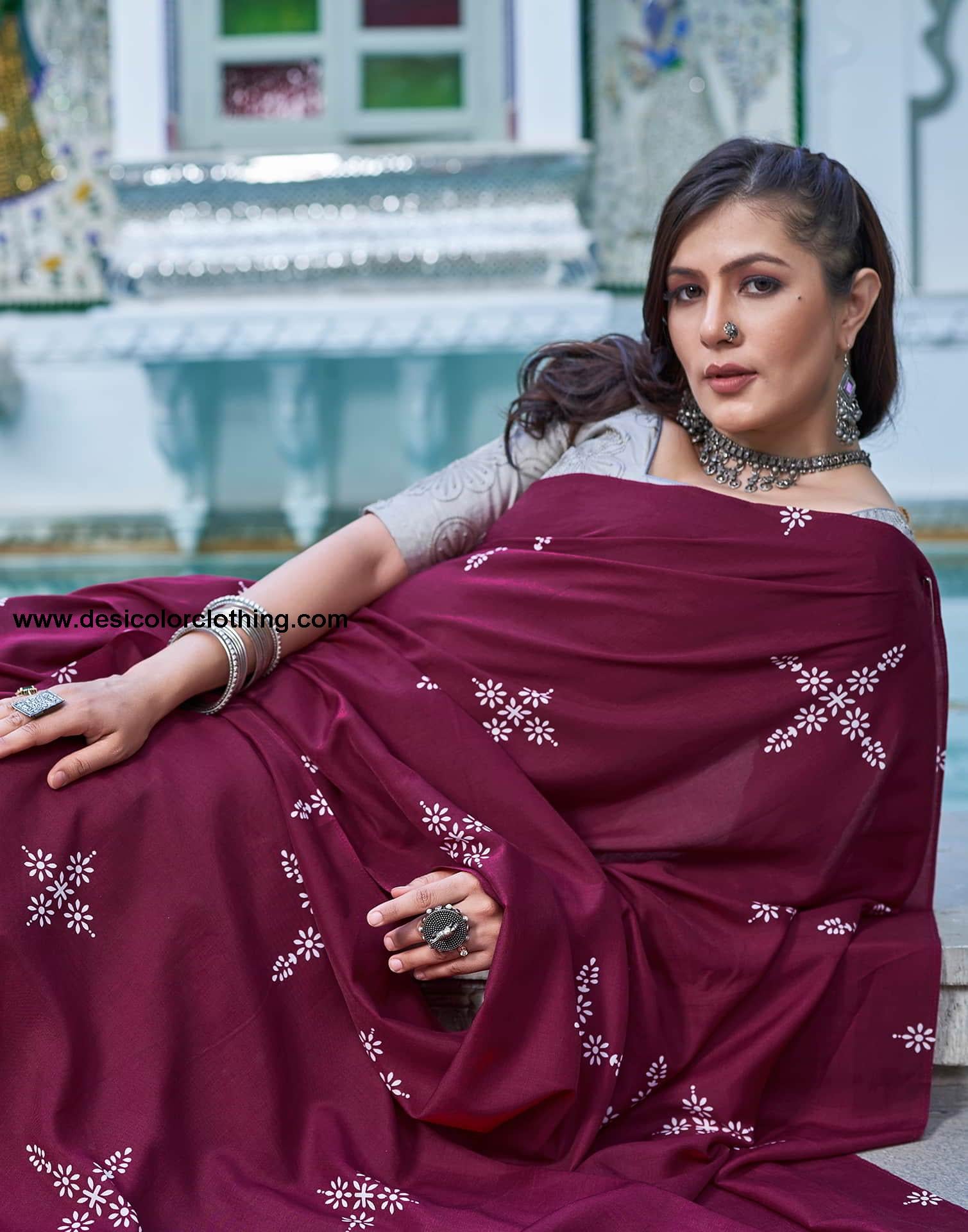 Blouse Color:Stone Grey Blouse Fabric:Bhagalpuri Silk Blouse Length:0.80 Mtr Blouse Work:Plain, Embroidery Saree Color:Wine, White Saree Fabric:Cotton Silk Saree Length:5.40 Mtr Saree Work:Printed, Tassels Type:Printed