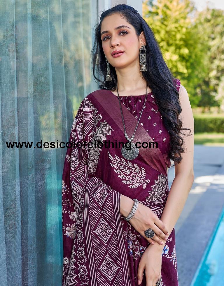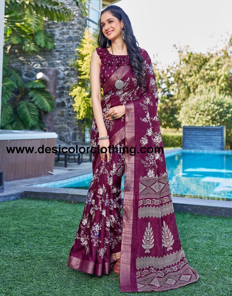 Wine Silk Printed Saree