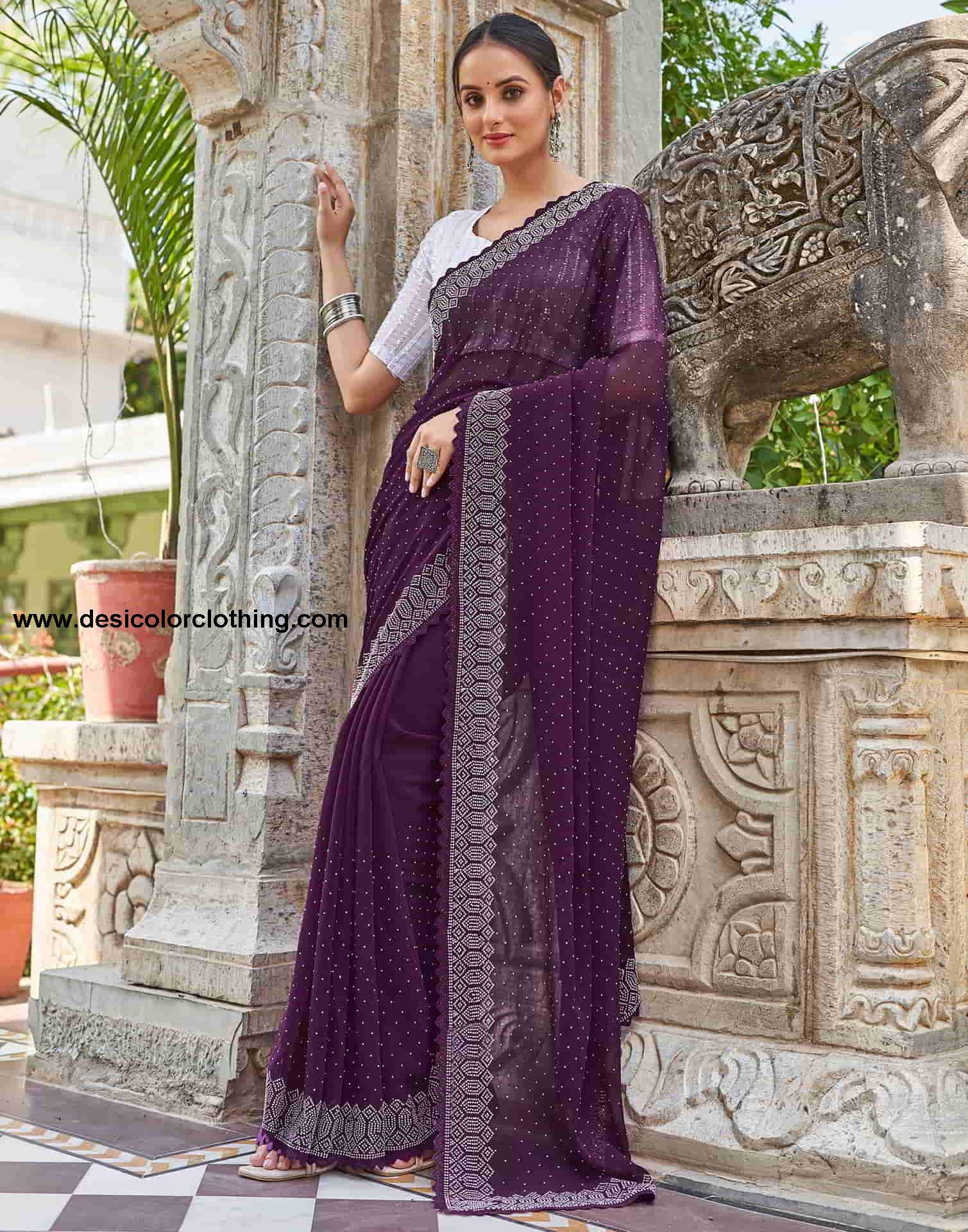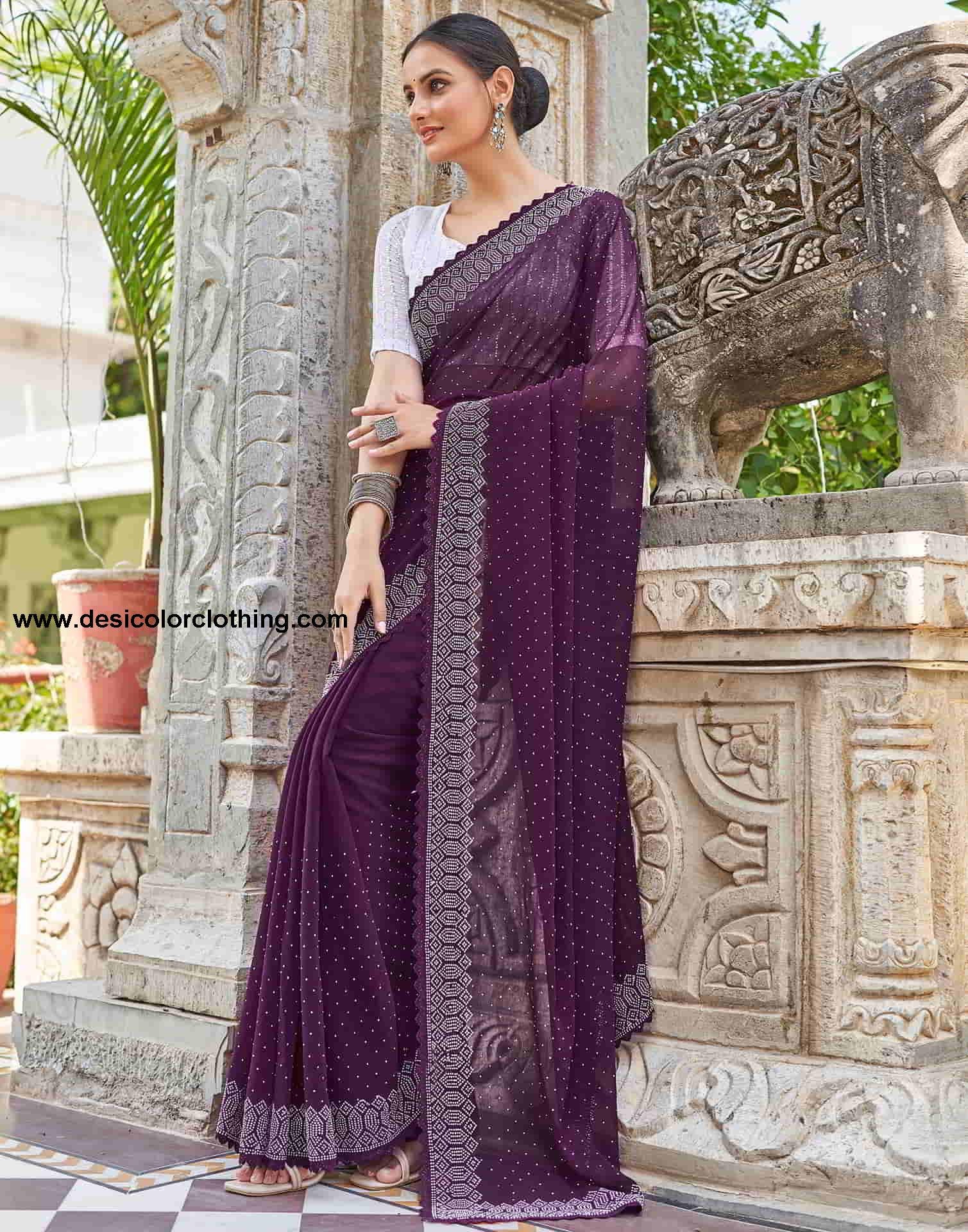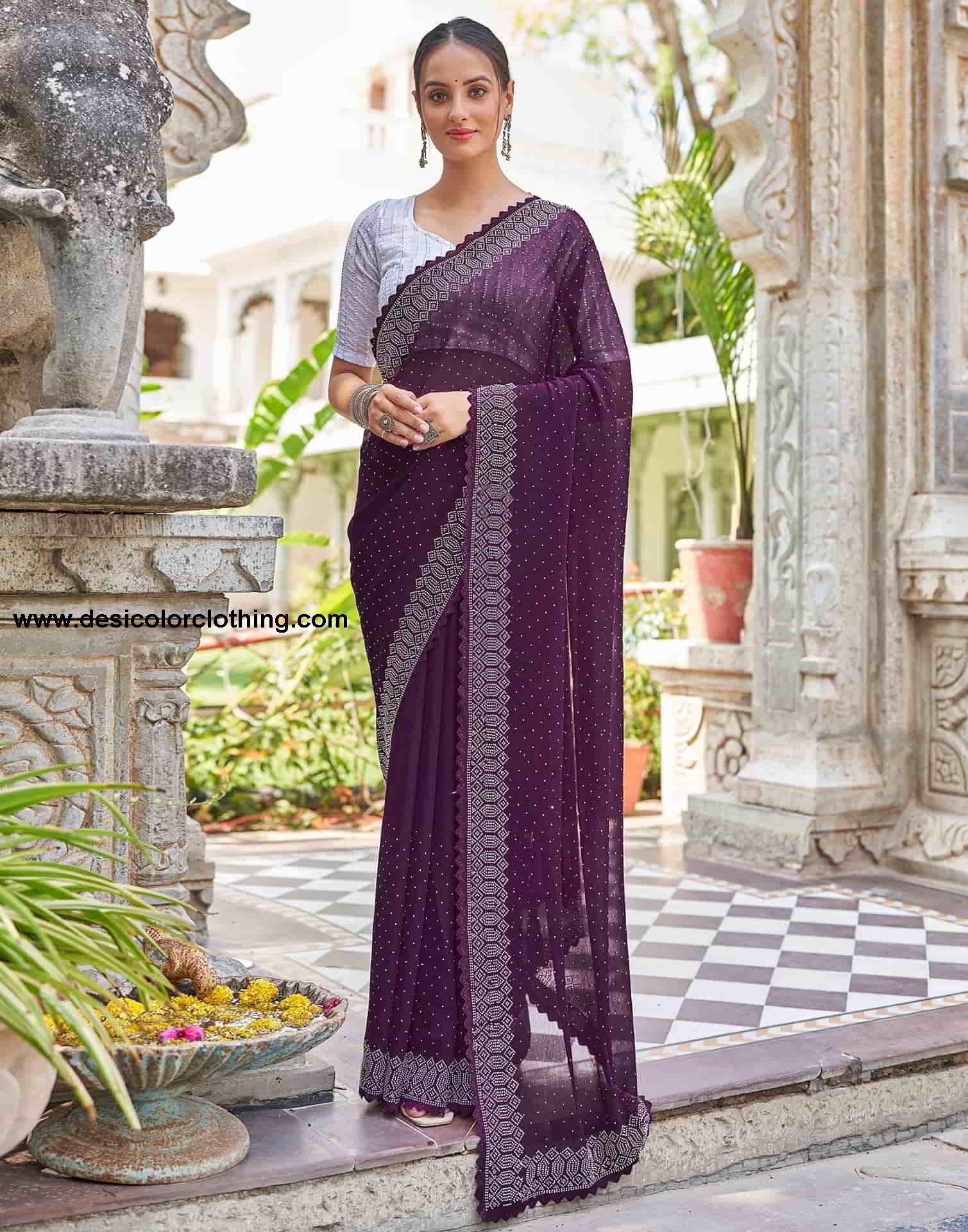 Blouse Color:White Blouse Fabric:Georgette Blouse Length:0.80 Mtr Blouse Work:Sequence Embroidery Saree Color:Wine, Silver Saree Fabric:Georgette Saree Length:5.30 Mtr Saree Work:Plain, Stone Work Type:Embellished