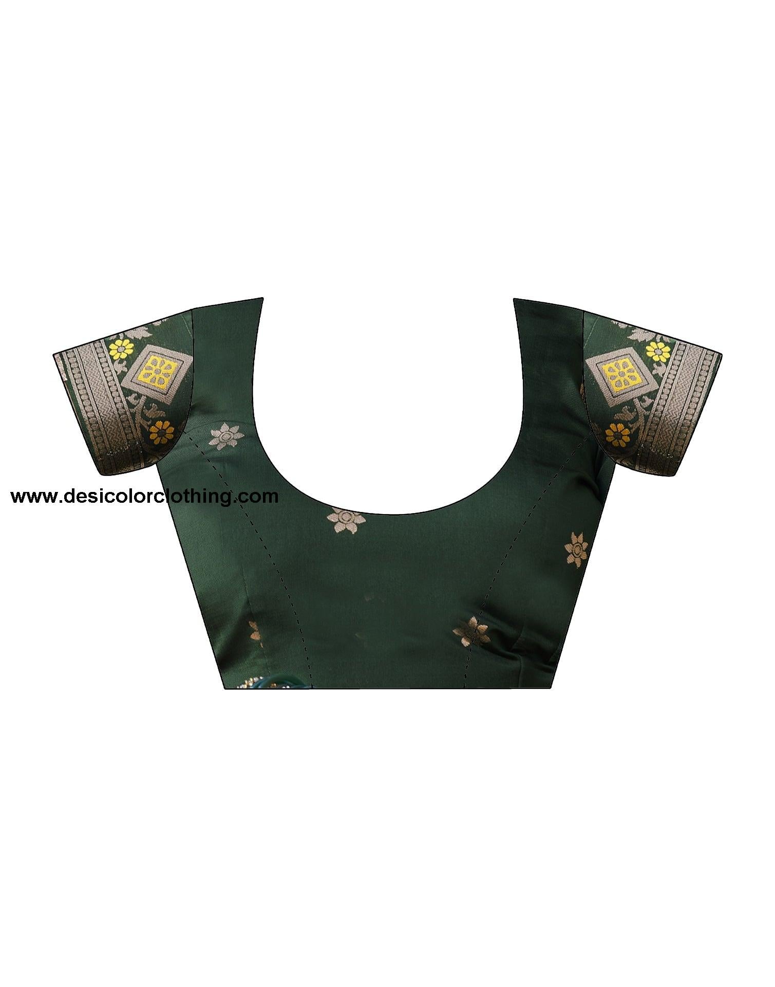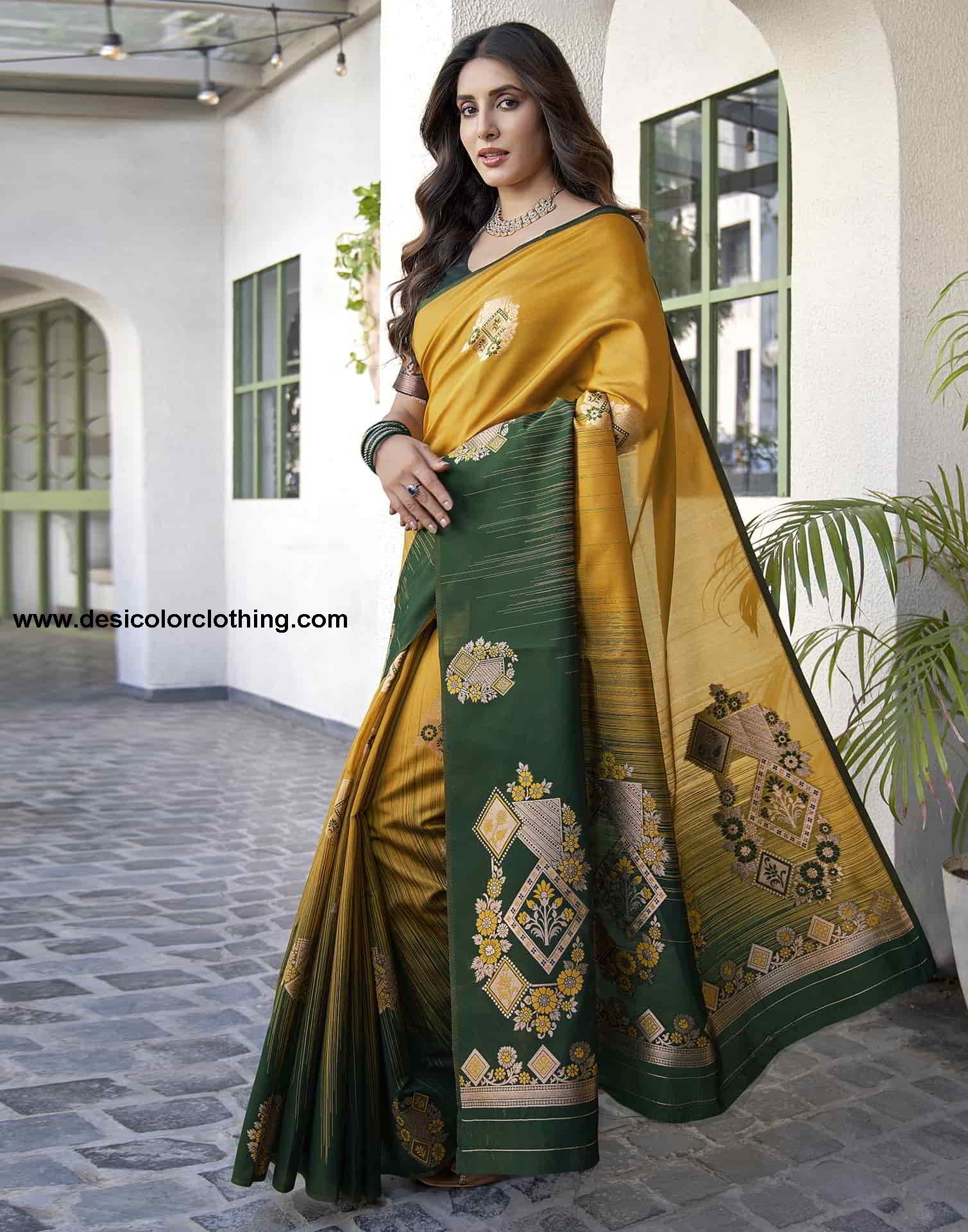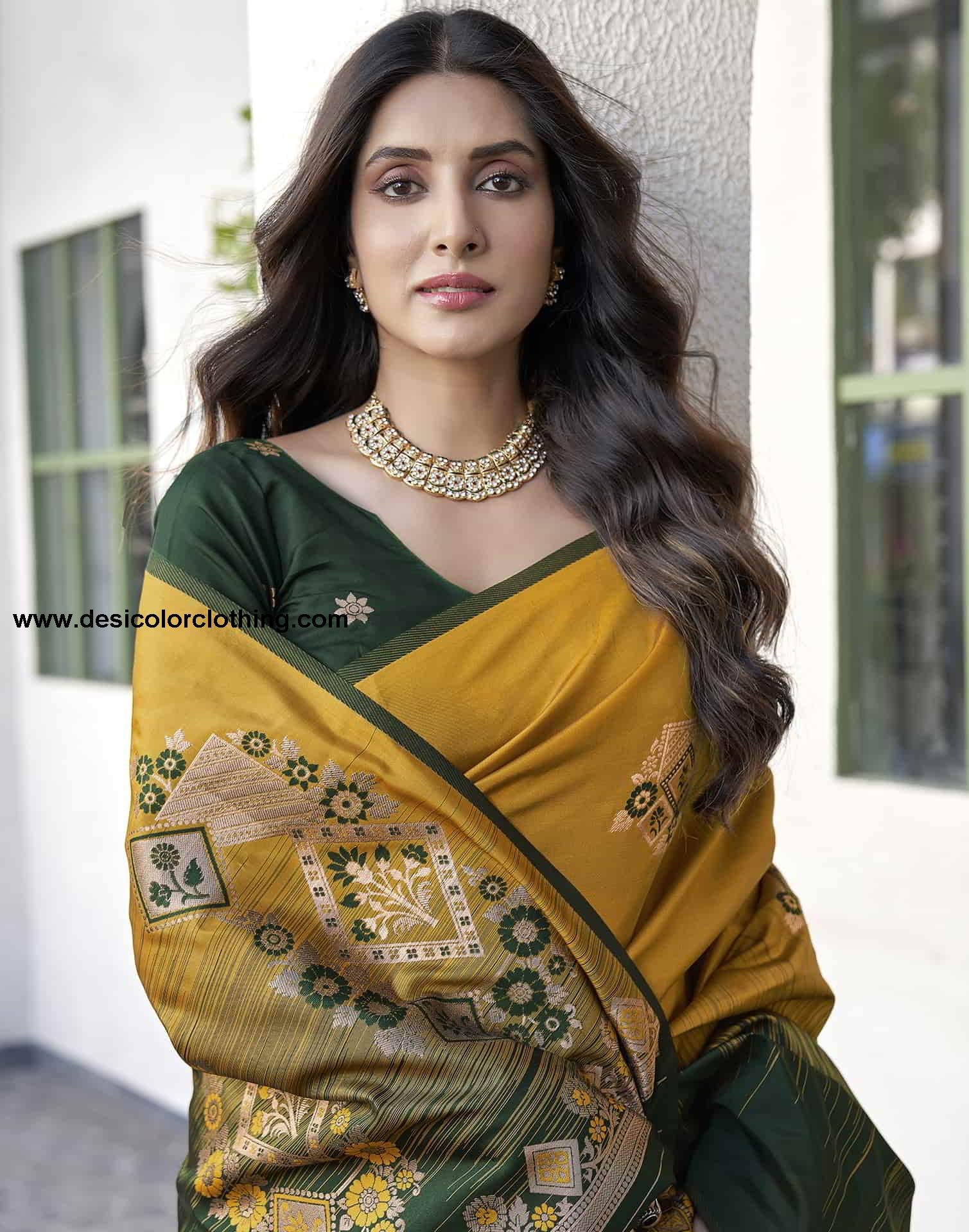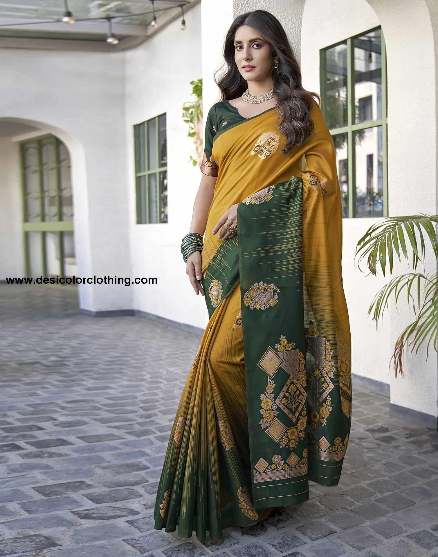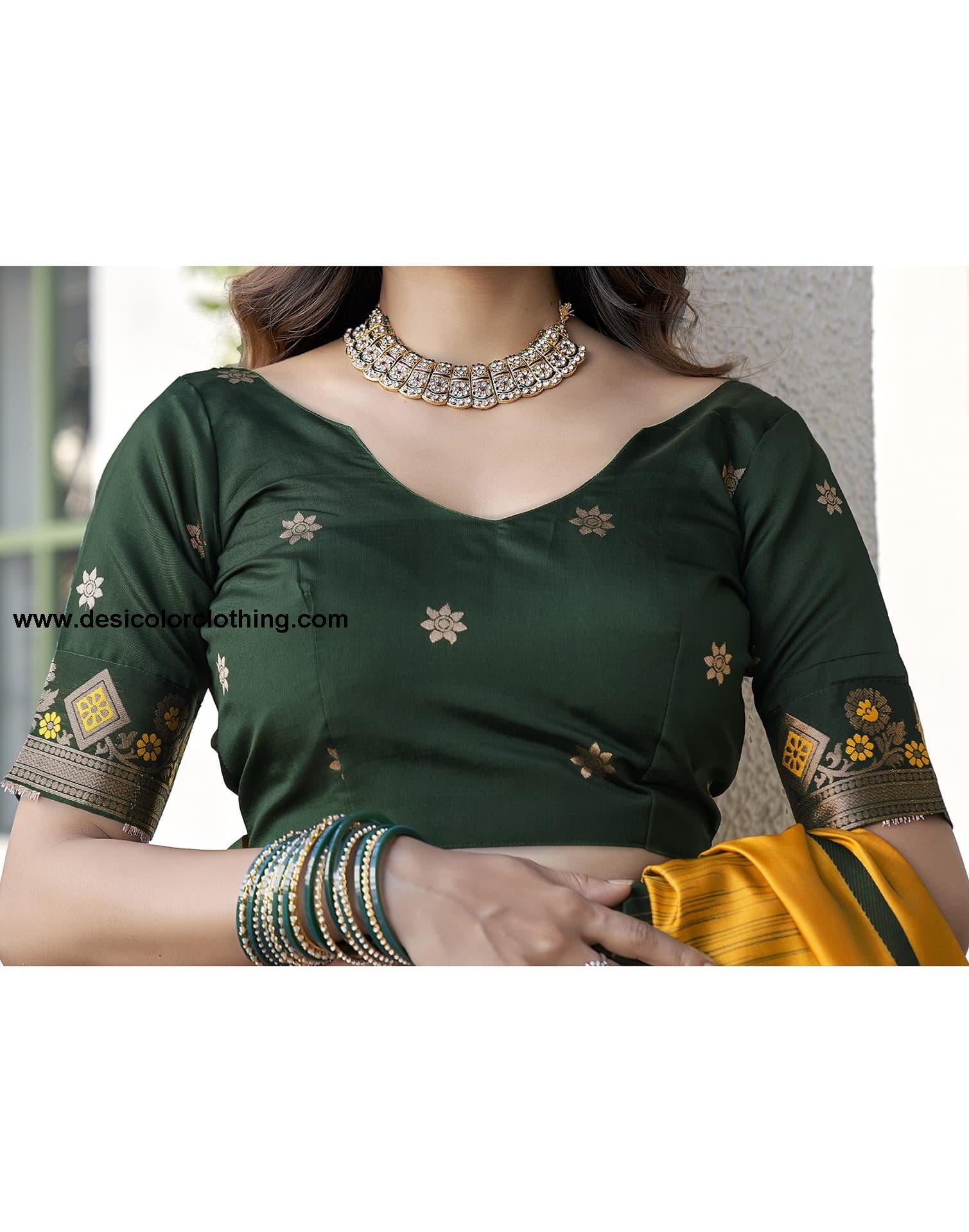 Blouse Color:Dark Green, Golden Blouse Fabric:Silk Blend Blouse Length:0.80 Mtr Blouse Work:Plain, Woven Saree Color:Mustard Yellow, Dark Green, Golden Saree Fabric:Silk Blend Saree Length:5.30 Mtr Saree Work:Plain, Woven Type:Banarasi