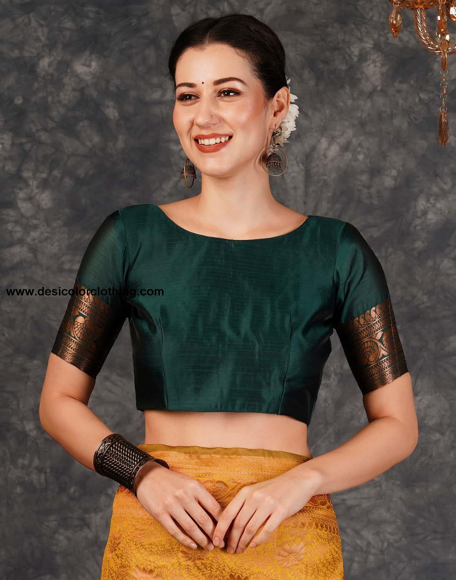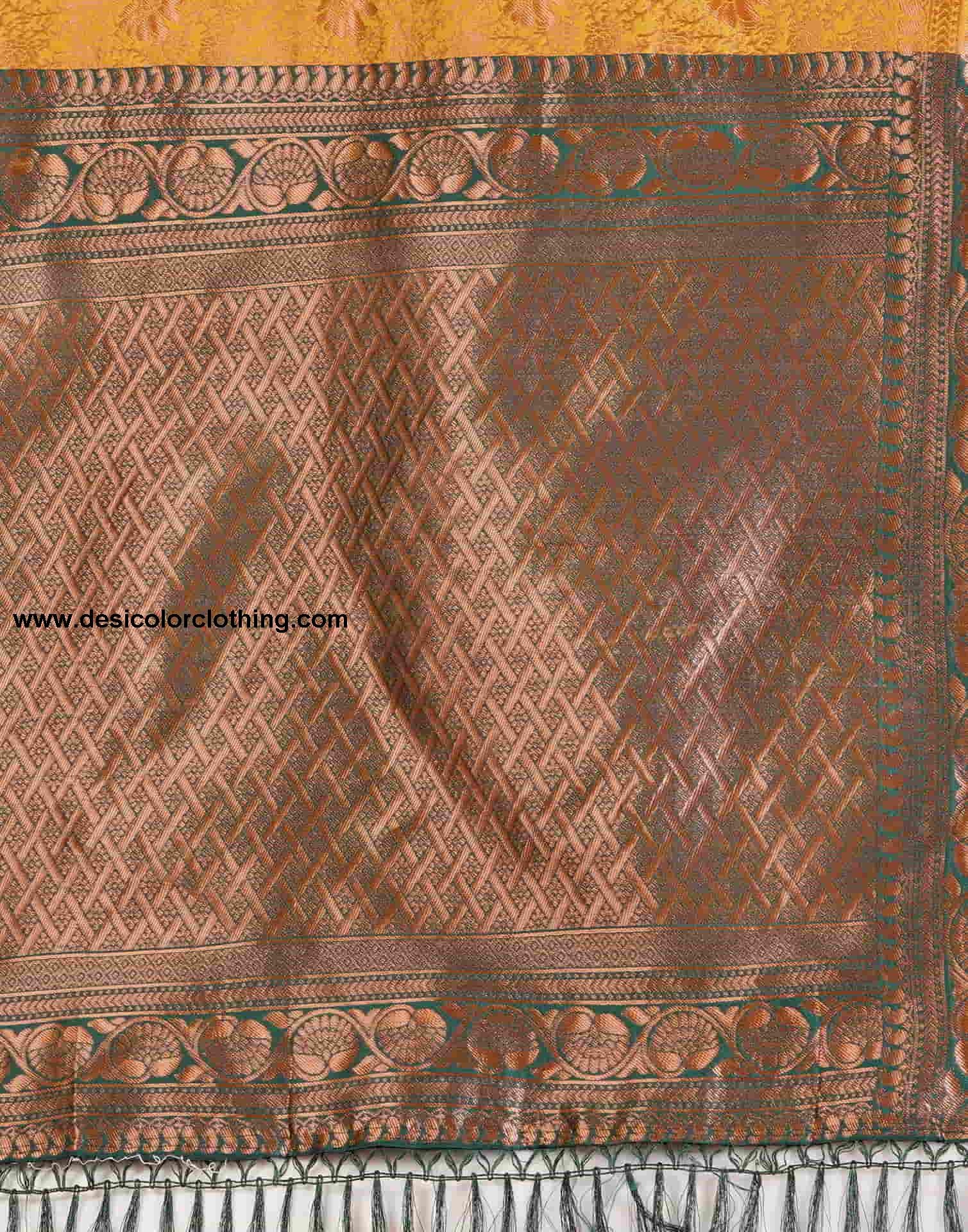 Blouse Color:Dark Green, Golden Blouse Fabric:Silk Blouse Length:0.80 Mtr Blouse Work:Plain, Woven Saree Color:Turmeric, Dark Green, Golden Saree Fabric:Silk Saree Length:5.50 Mtr Saree Work:Woven, Tassels Type:Banarasi