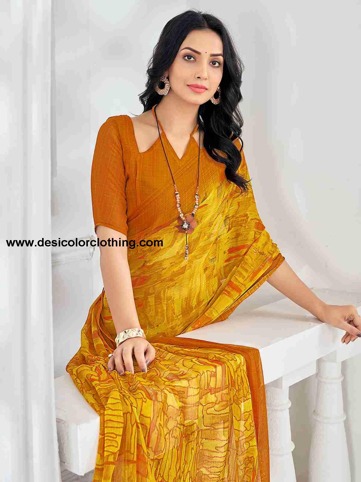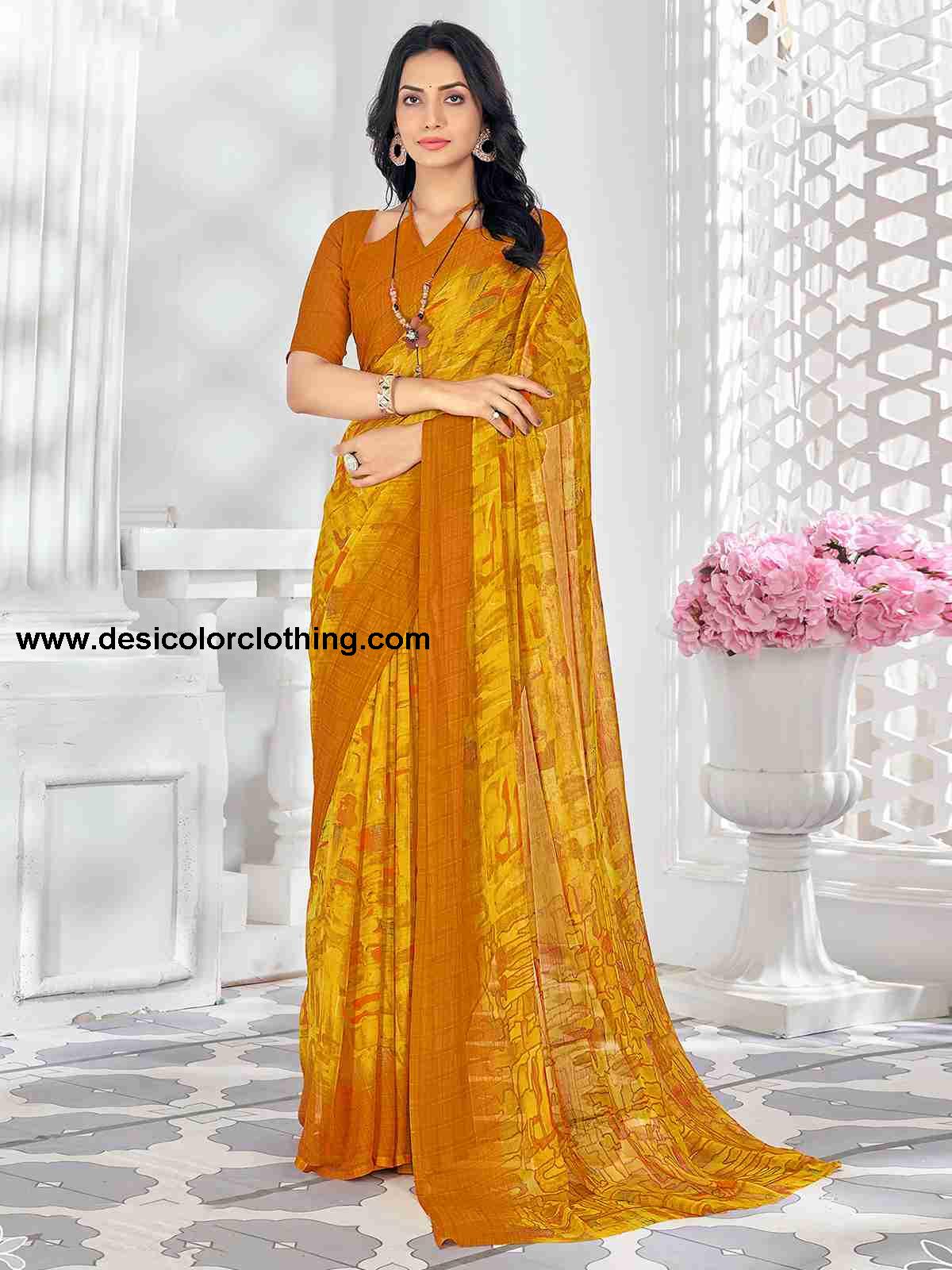 Blouse Color:Orange Blouse Fabric:Chiffon Blouse Length:0.80 Mtr Blouse Work:Geometric Printed Saree Color:Yellow, Orange Saree Fabric:Chiffon Saree Length:5.50 Mtr Saree Work:Geometric Printed