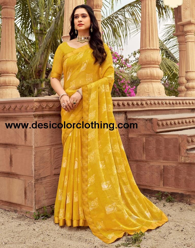 Blouse Color:Yellow Blouse Fabric:Chiffon Blouse Length:0.80 Mtr Blouse Work:Printed, Lace Saree Color:Yellow, White Saree Fabric:Chiffon Saree Length:5.50 Mtr Saree Work:Floral Printed, Lace