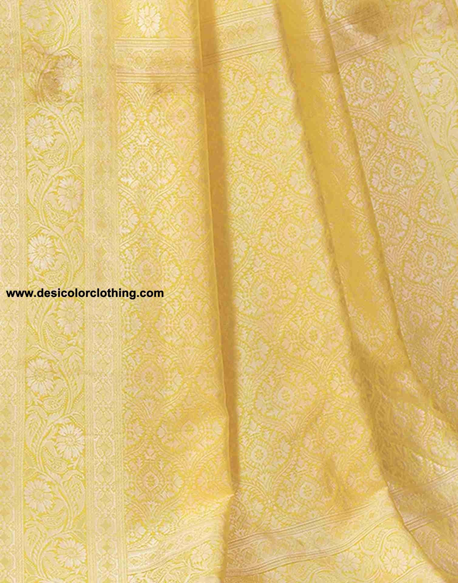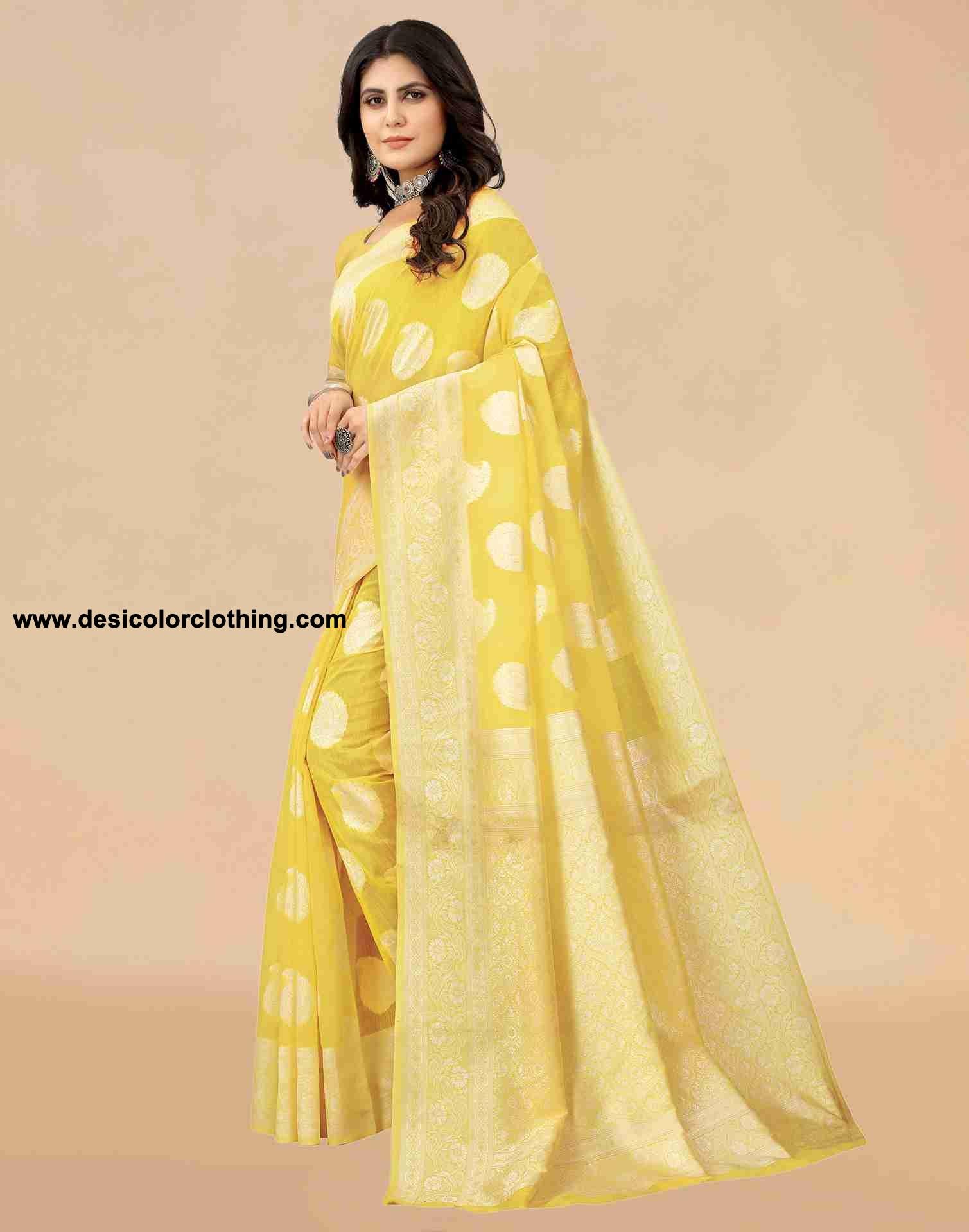 Blouse Color:Yellow Blouse Fabric:Cotton Blend Blouse Length:0.80 Mtr Blouse Work:Plain, Woven Border Saree Color:Yellow, Silver Saree Fabric:Cotton Blend Saree Length:5.50 Mtr Saree Work:Plain, Woven