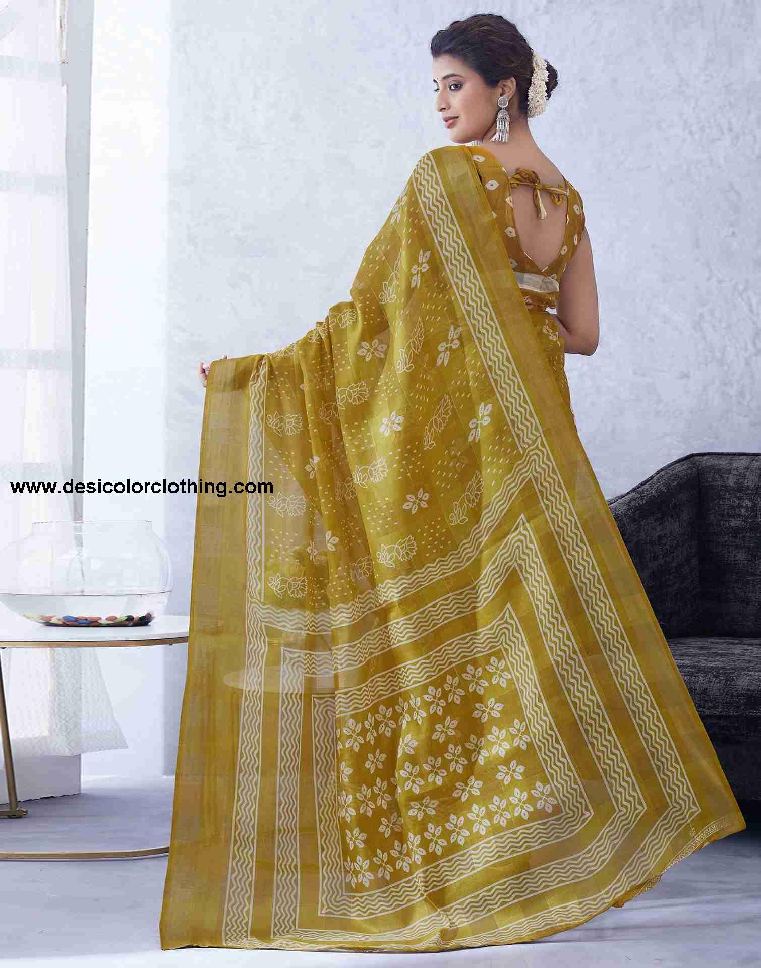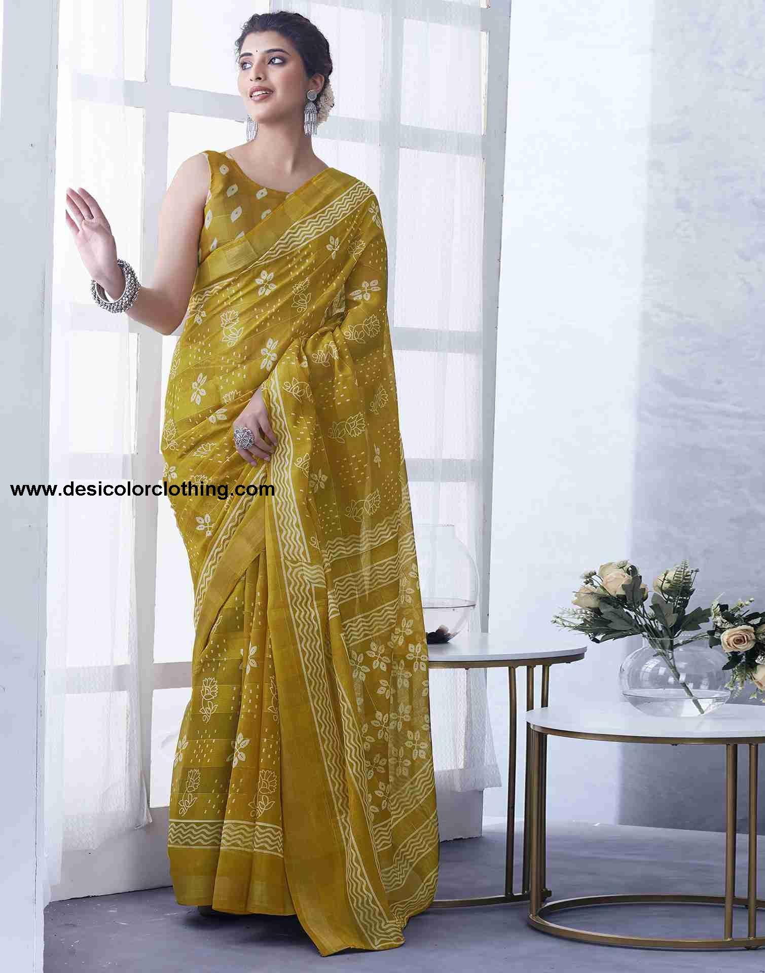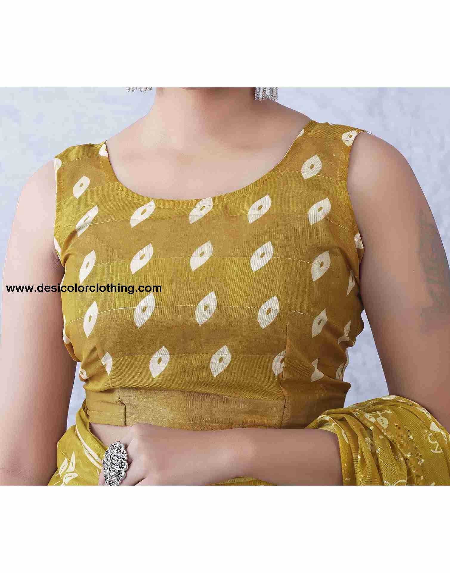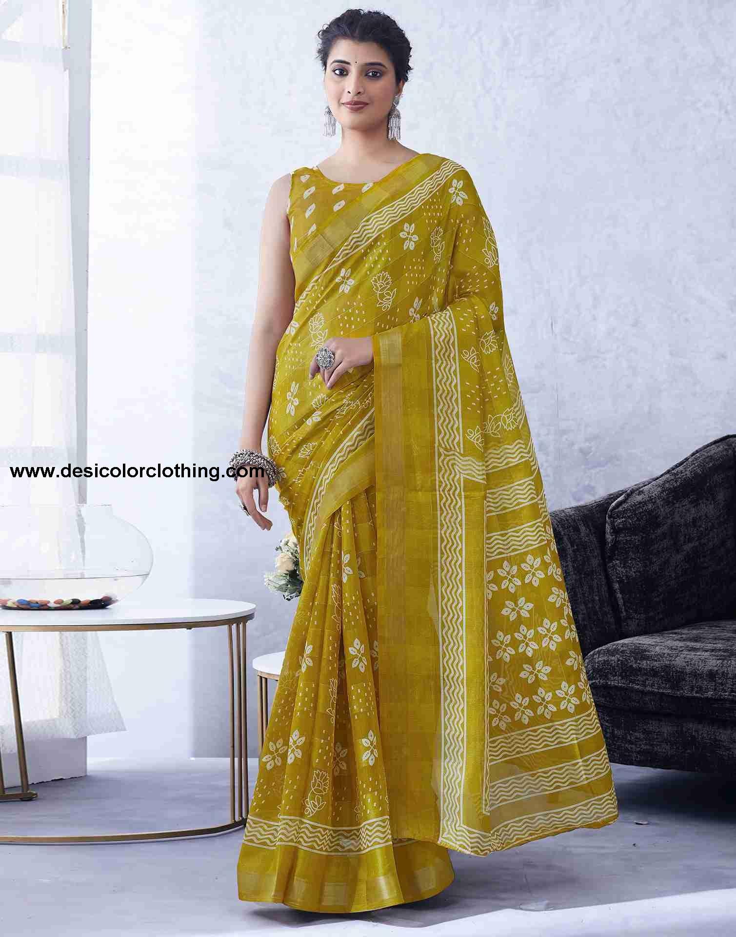 Blouse Color:Turmeric, White Blouse Fabric:Cotton Blend Blouse Length:0.80 Mtr Blouse Work:Geometric Printed, Zari Stripe Saree Color:Turmeric, White Saree Fabric:Cotton Blend Saree Length:5.30 Mtr Saree Work:Floral Printed, Zari Stripe