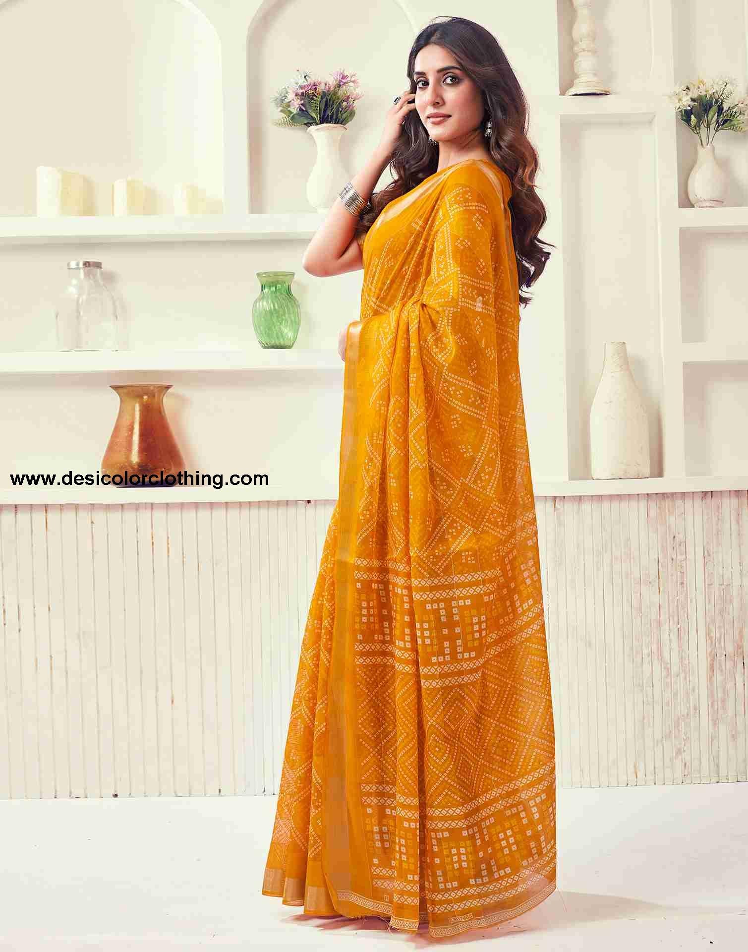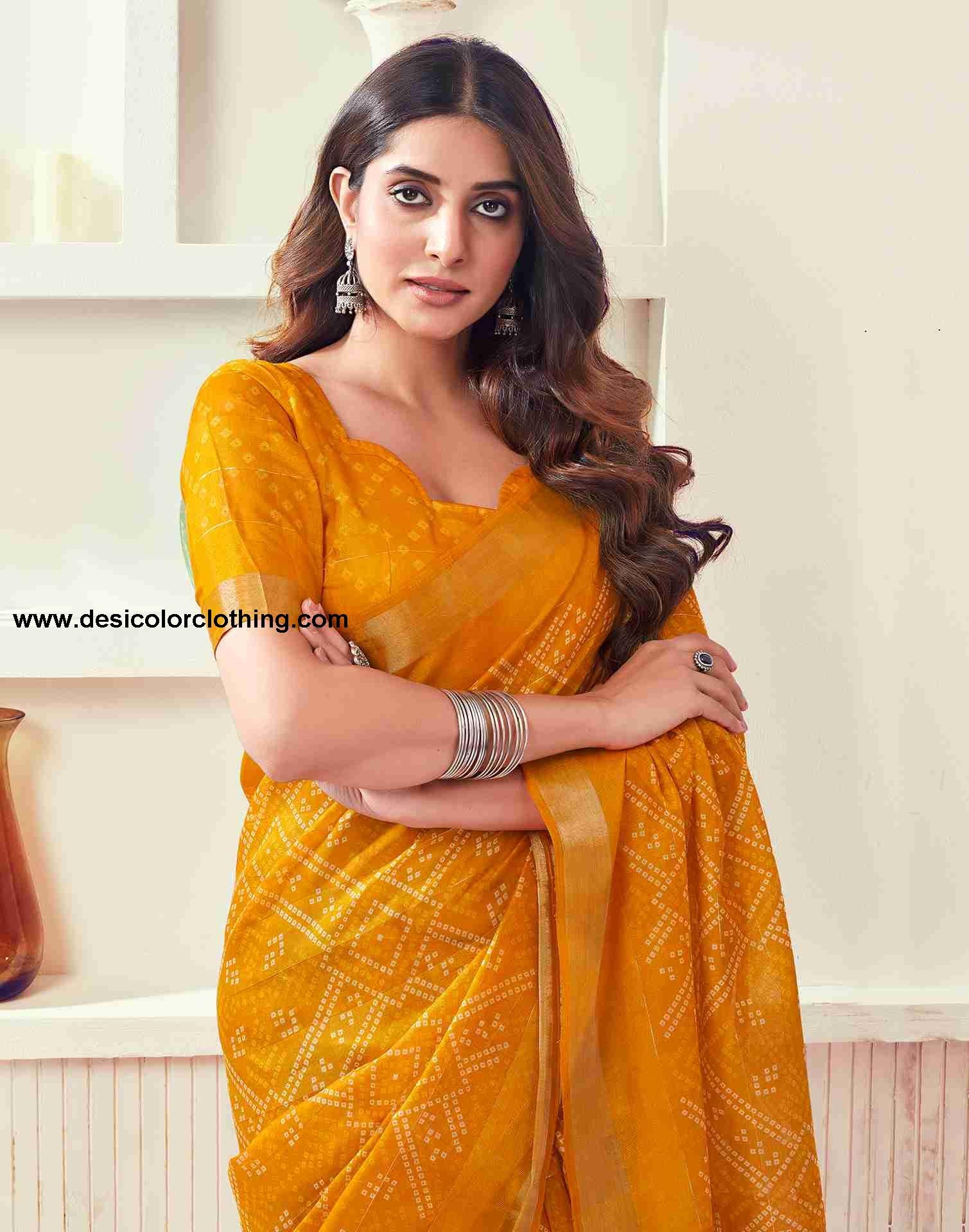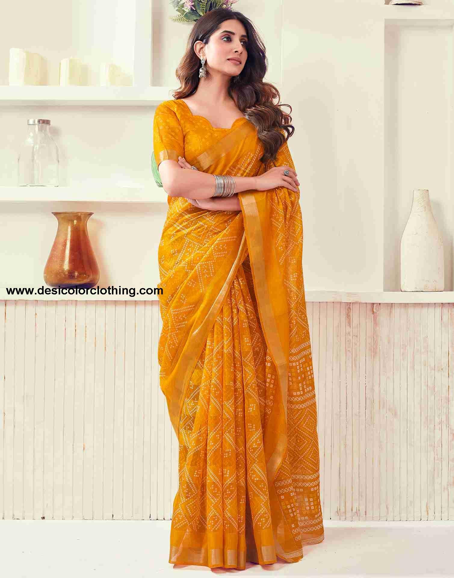 Blouse Color:Turmeric Blouse Fabric:Cotton Blend Blouse Length:0.70 Mtr Blouse Work:Bandhani Printed, Zari Stripe Saree Color:Turmeric, White Saree Fabric:Cotton Blend Saree Length:5.30 Mtr Saree Work:Bandhani Printed, Zari Stripe