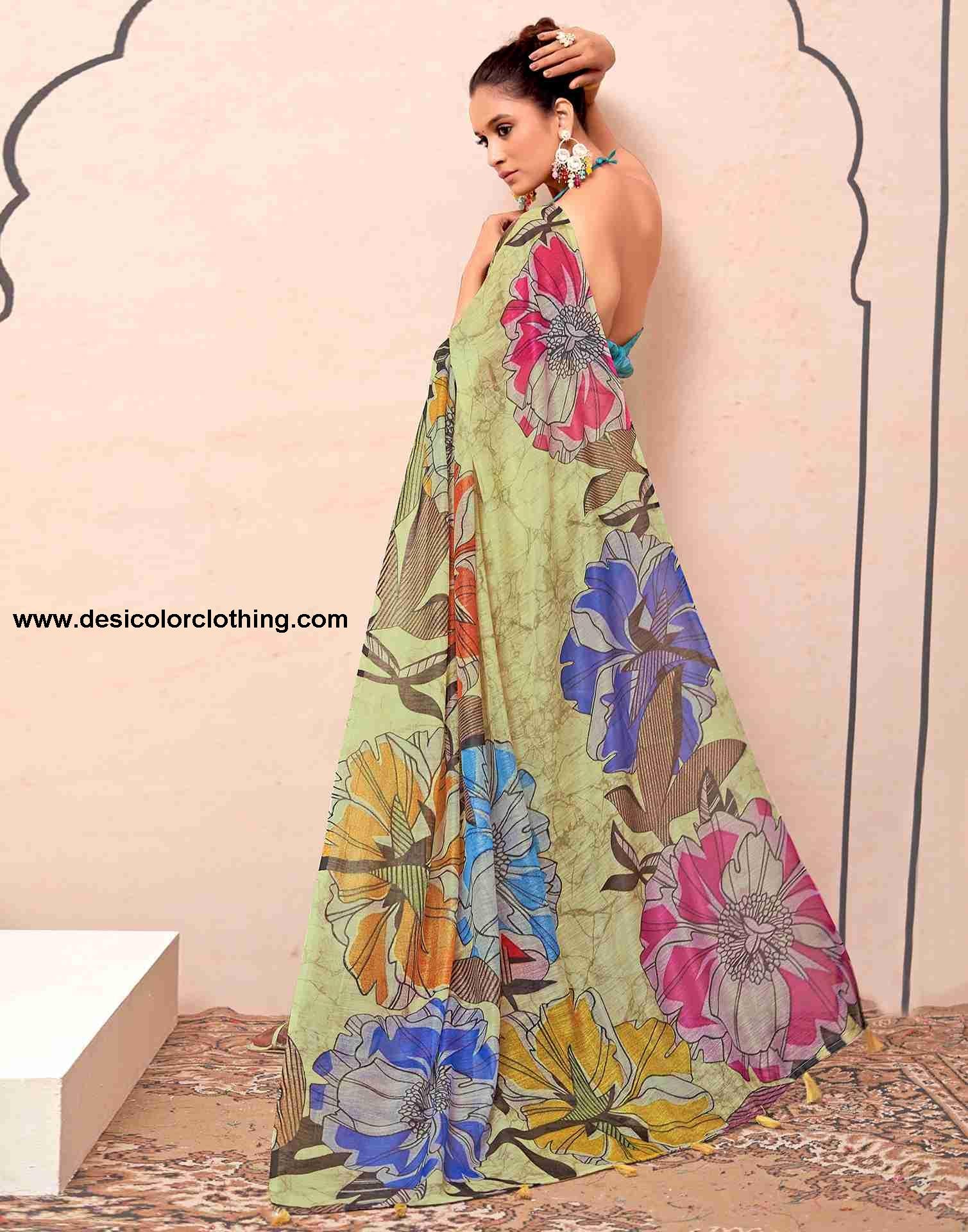 Blouse Color:Turquoise Blouse Fabric:Cotton Silk Blouse Length:0.70 Mtr Blouse Work:Printed Saree Color:Pale Yellow, Multi Saree Fabric:Cotton Silk Saree Length:5.30 Mtr Saree Work:Floral Printed, Tassels