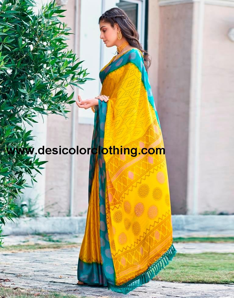 Blouse Color:Yellow Blouse Fabric:Moss Blouse Length:0.70 Mtr Blouse Work:Floral Printed Saree Color:Yellow, Teal Blue Saree Fabric:Moss Saree Length:5.50 Mtr Saree Work:Geometric Printed