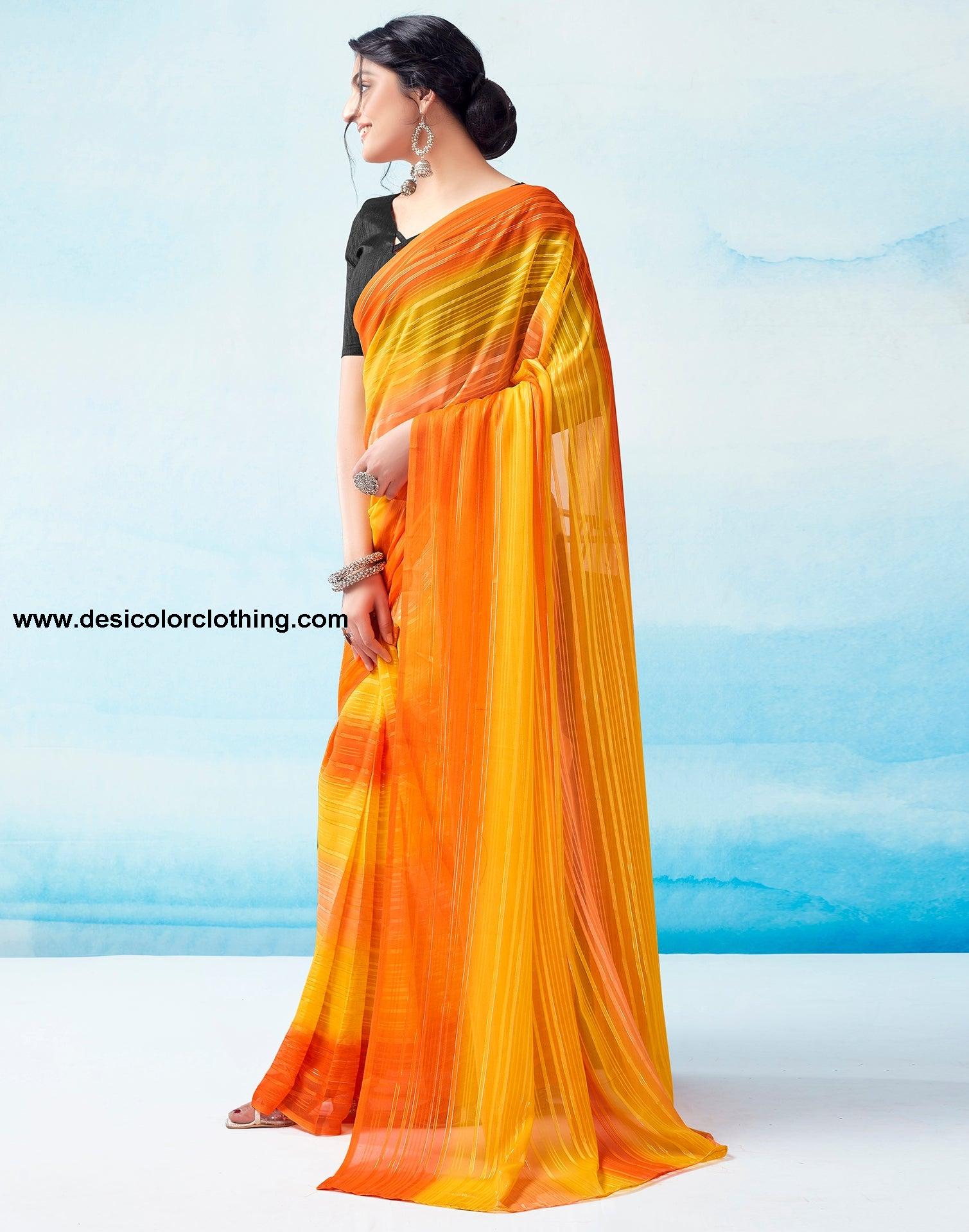 Blouse Color:Black Blouse Fabric:Plain Blouse Length:0.80 Mtr Blouse Work:Plain Saree Color:Yellow, Orange Saree Fabric:Georgette Saree Length:5.50 Mtr Saree Work:Printed