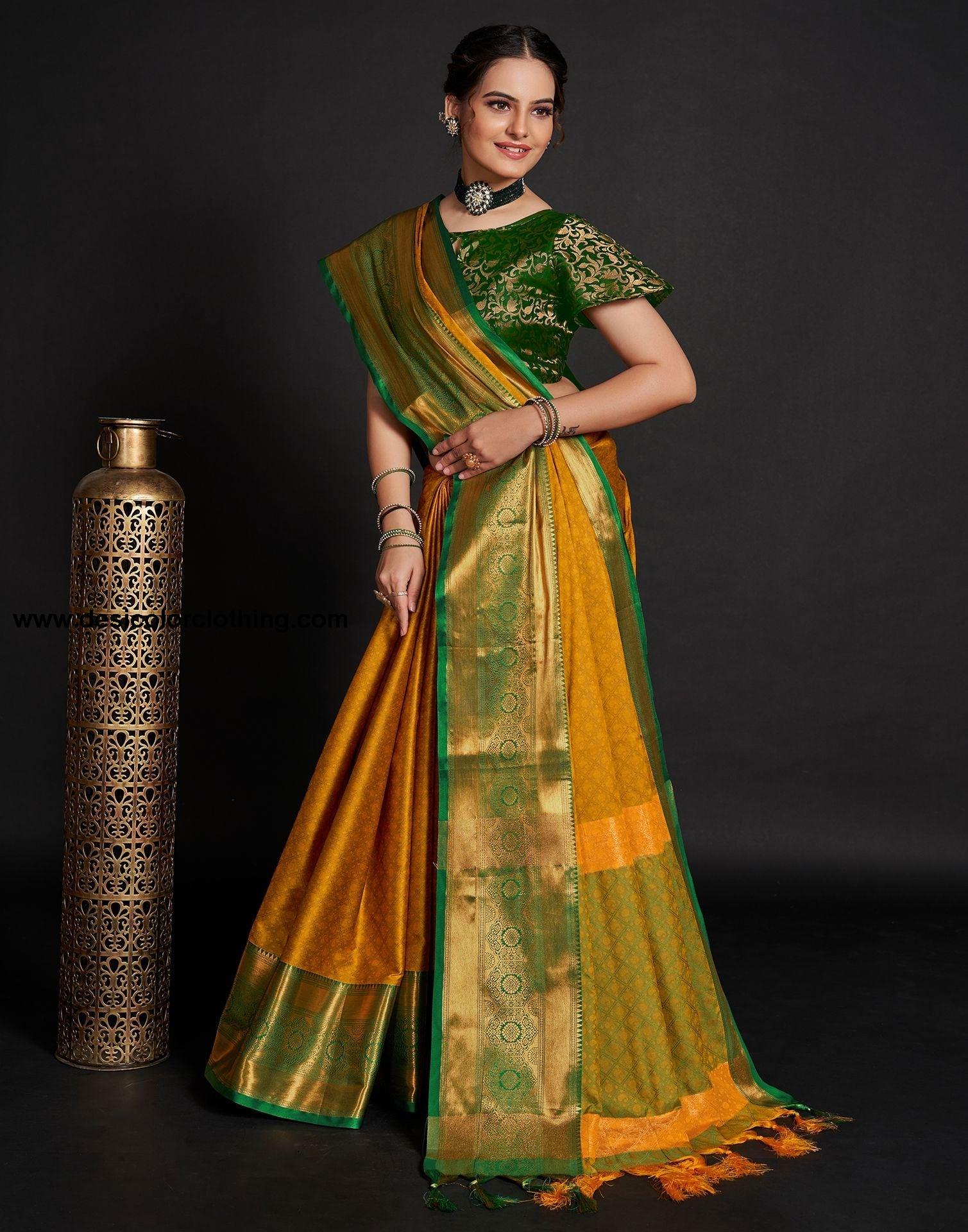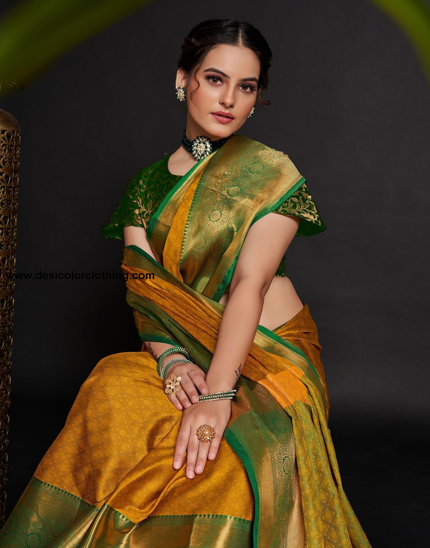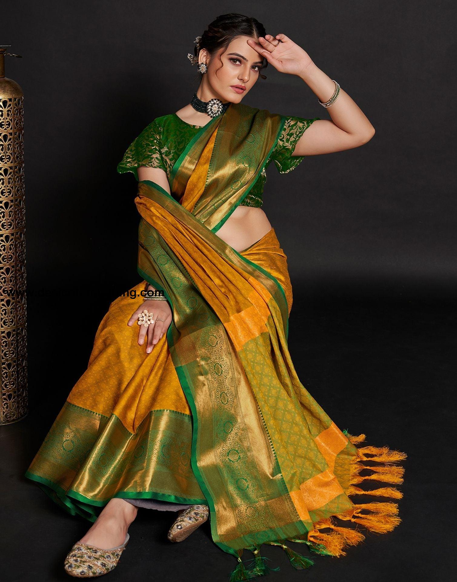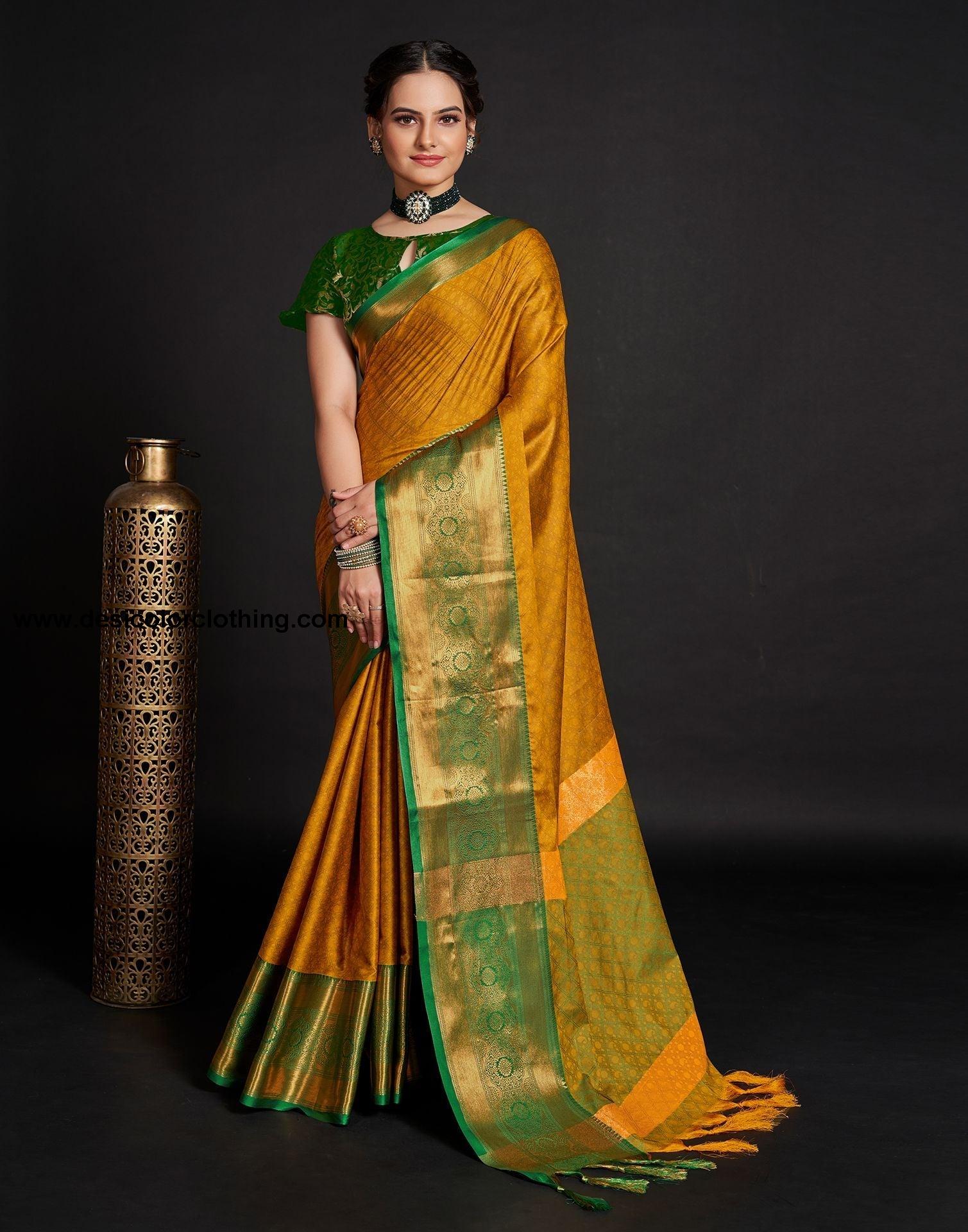 Blouse Color:Dark Green, Golden Blouse Fabric:Art Silk Blouse Length:0.80 Mtr Blouse Work:Jacquard Saree Color:Yellow Saree Fabric:Art Silk Saree Length:5.50 Mtr Saree Work:Jacquard Border, Tassels