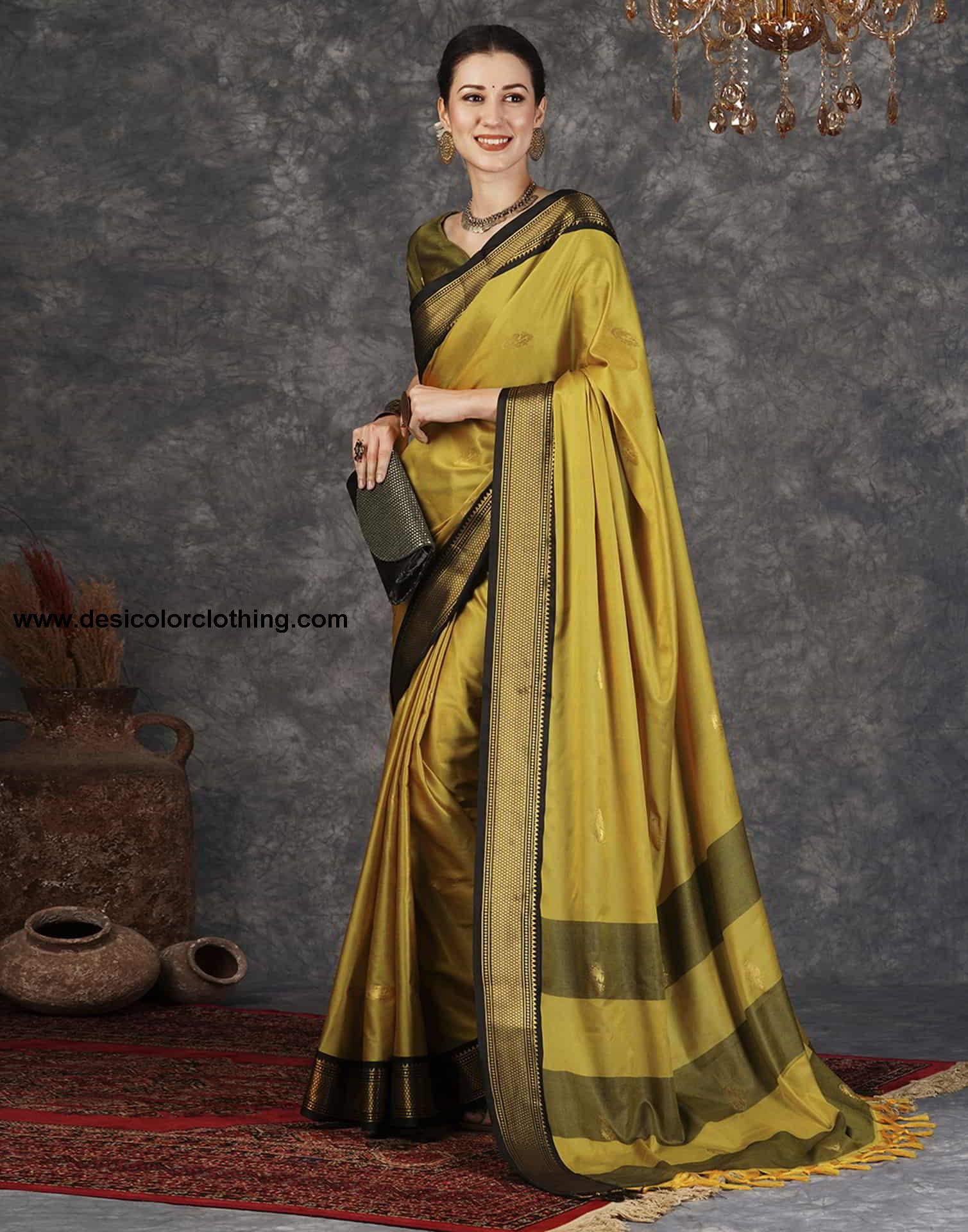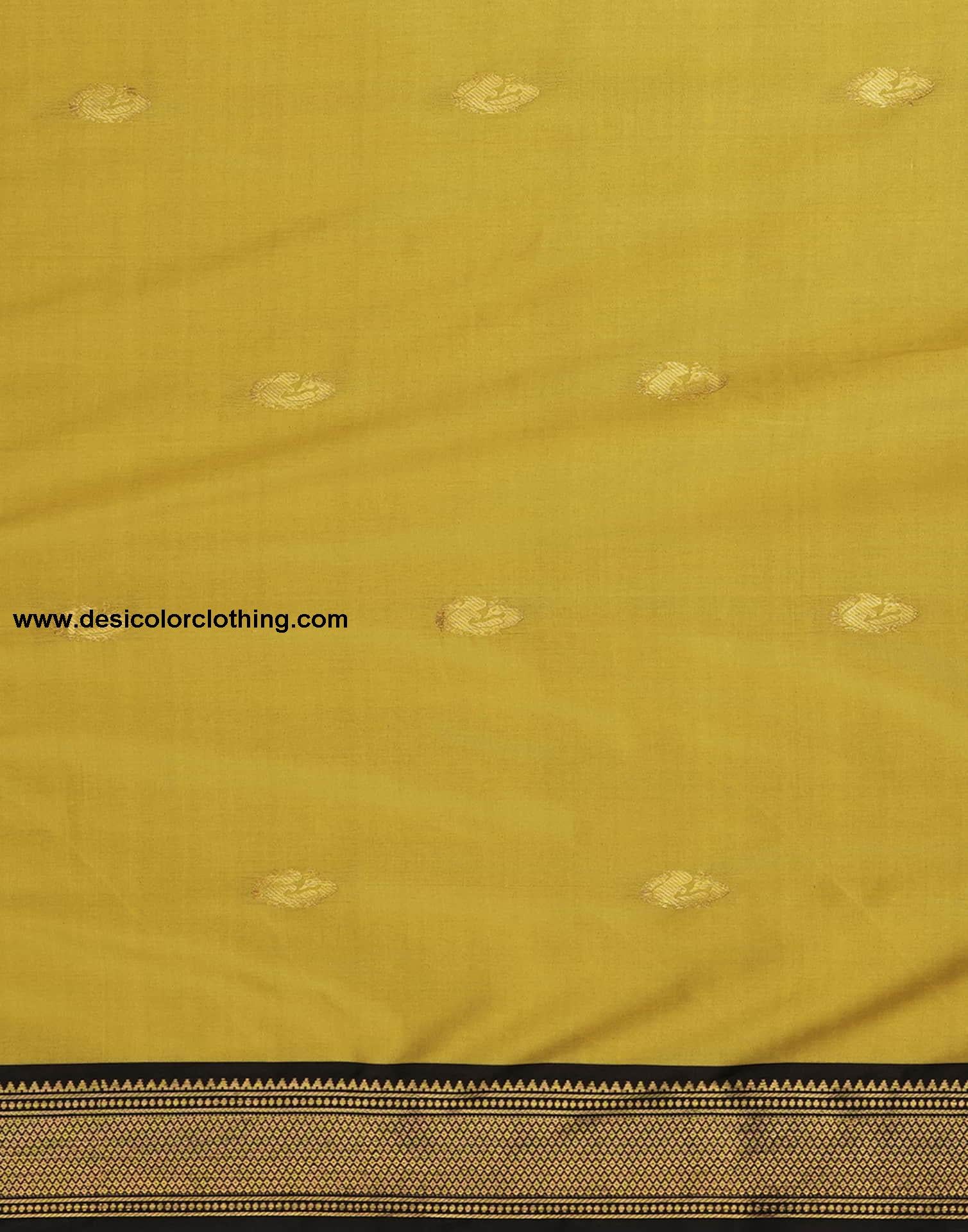 Blouse Color:Mustard Yellow, Black Blouse Fabric:Silk Blouse Length:0.80 Mtr Blouse Work:Woven Border (Dual Tone ) Saree Color:Mustard Yellow, Black, Golden Saree Fabric:Silk Saree Length:5.50 Mtr Saree Work:Woven, Tassels Type:Kanjivaram