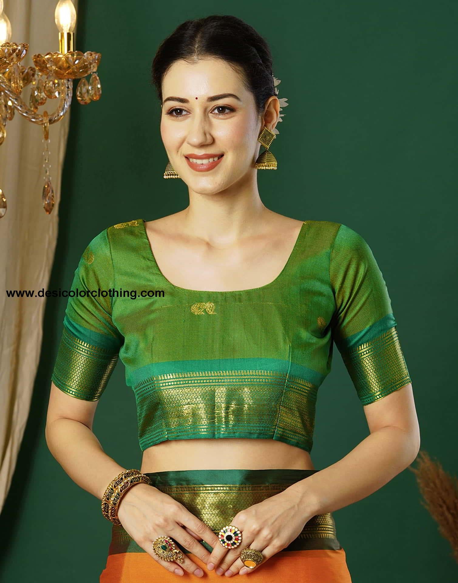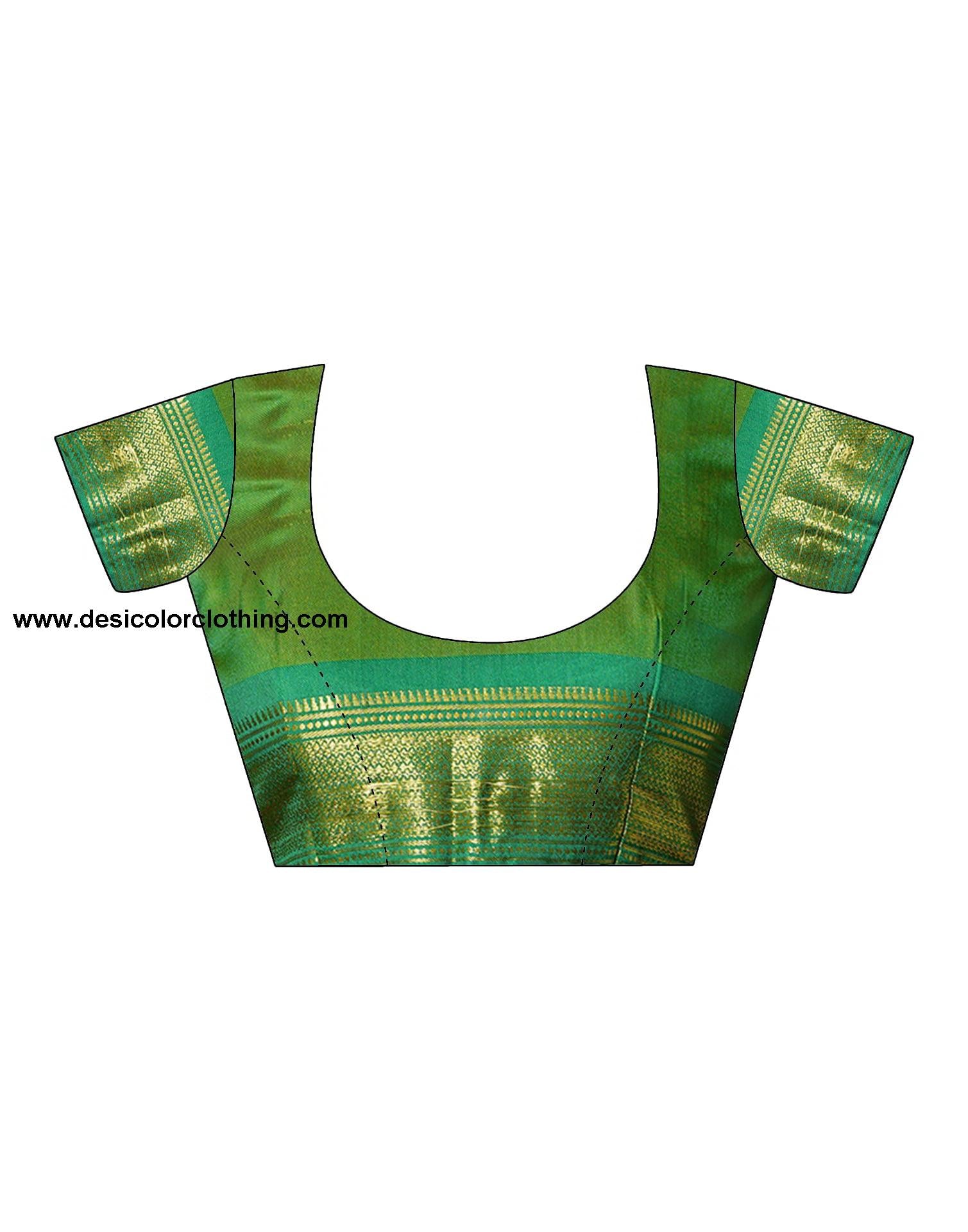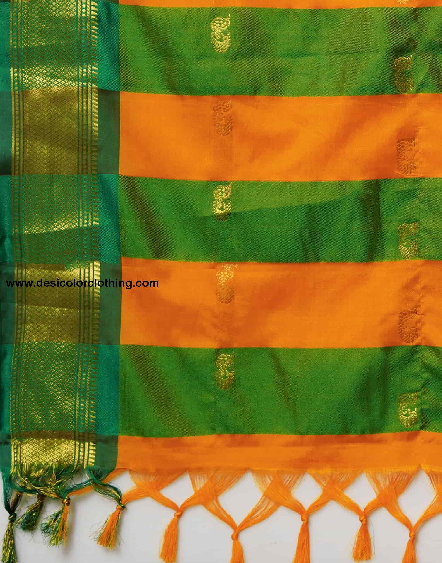 Blouse Color:Green Blouse Fabric:Silk Blouse Length:0.80 Mtr Blouse Work:Woven Border (Dual Tone ) Saree Color:Turmeric Yellow, Green, Golden Saree Fabric:Silk Saree Length:5.50 Mtr Saree Work:Woven, Tassels Type:Kanjivaram
