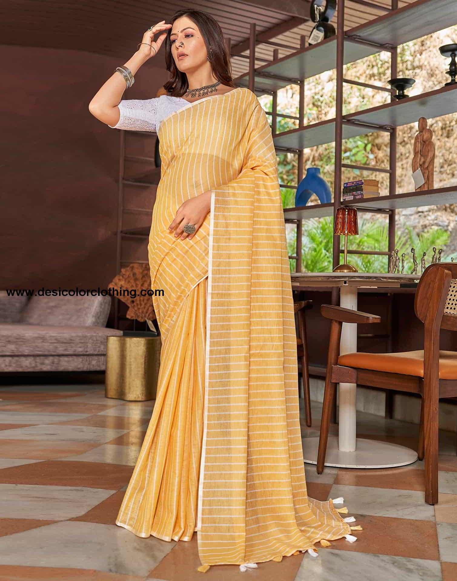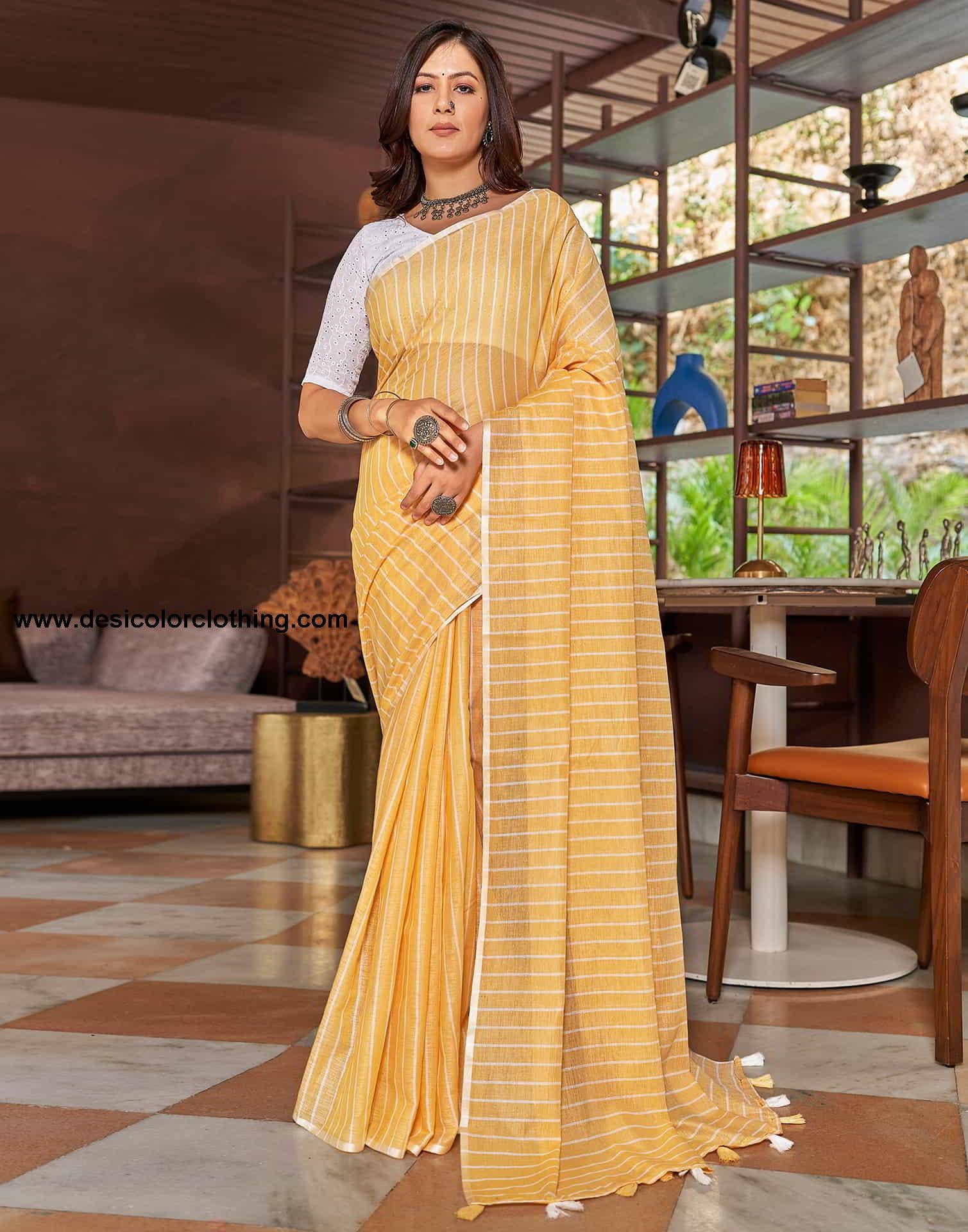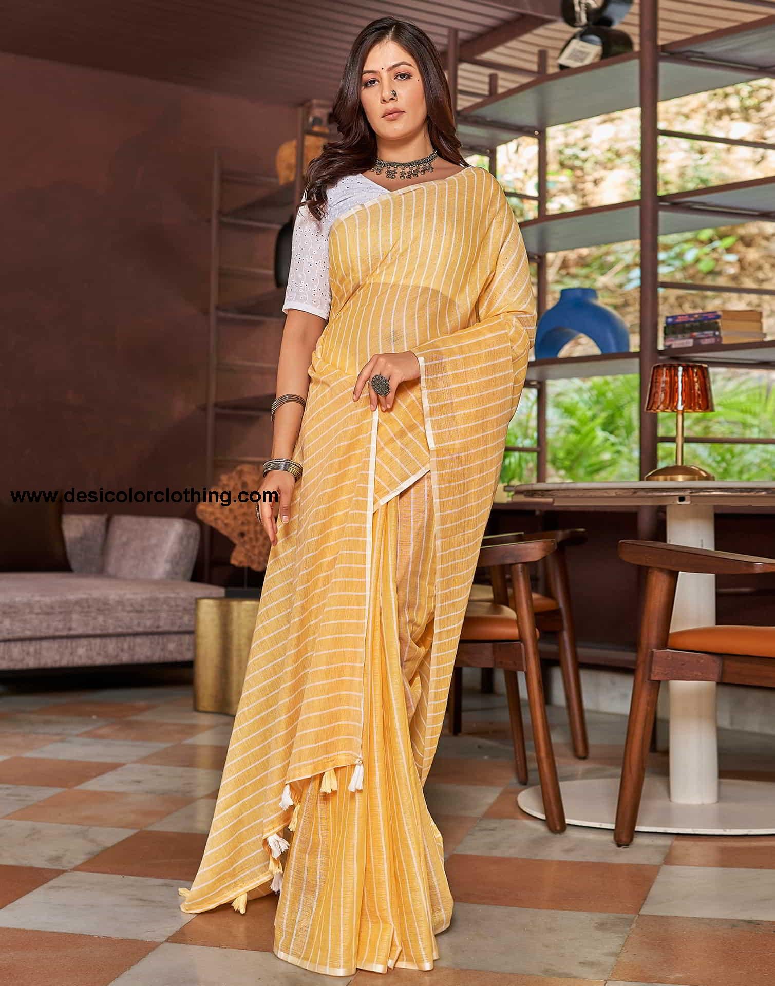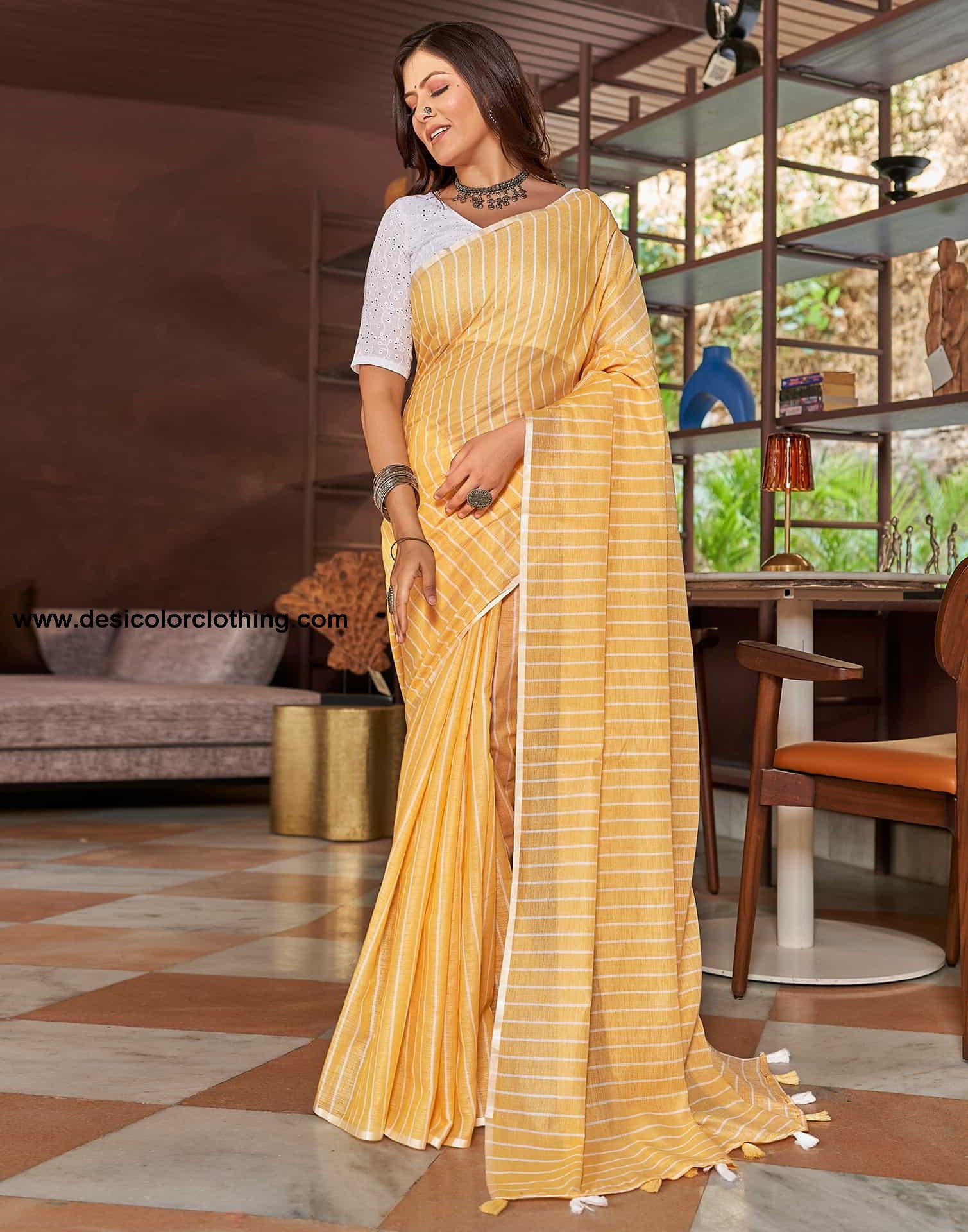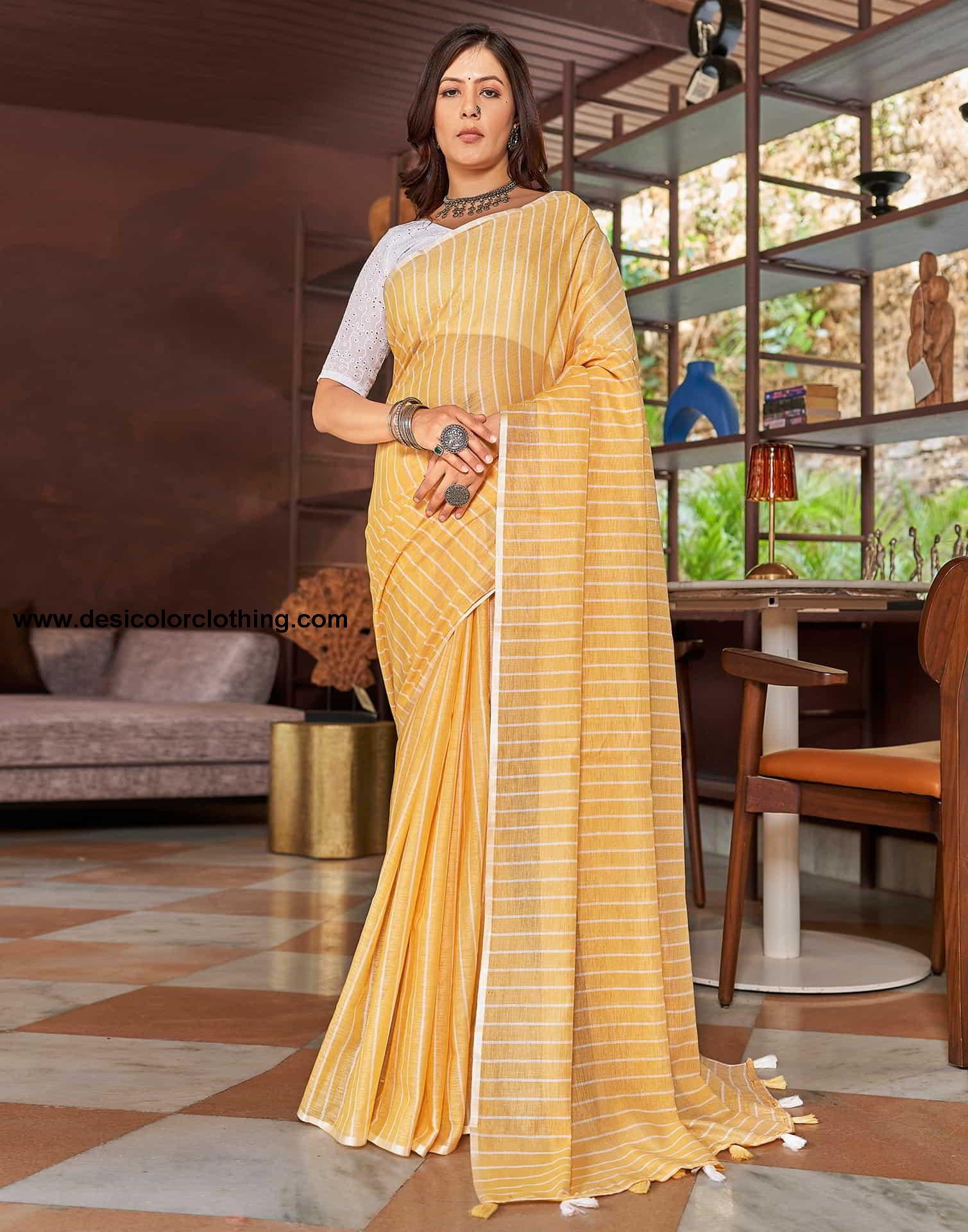 Blouse Color:White Blouse Fabric:Cotton Blouse Length:0.80 Mtr Blouse Work:Solid, Shifali Embroidery Saree Color:Yellow, White Saree Fabric:Linen Saree Length:5.40 Mtr Saree Work:Woven, Tassels Type:Leheriya