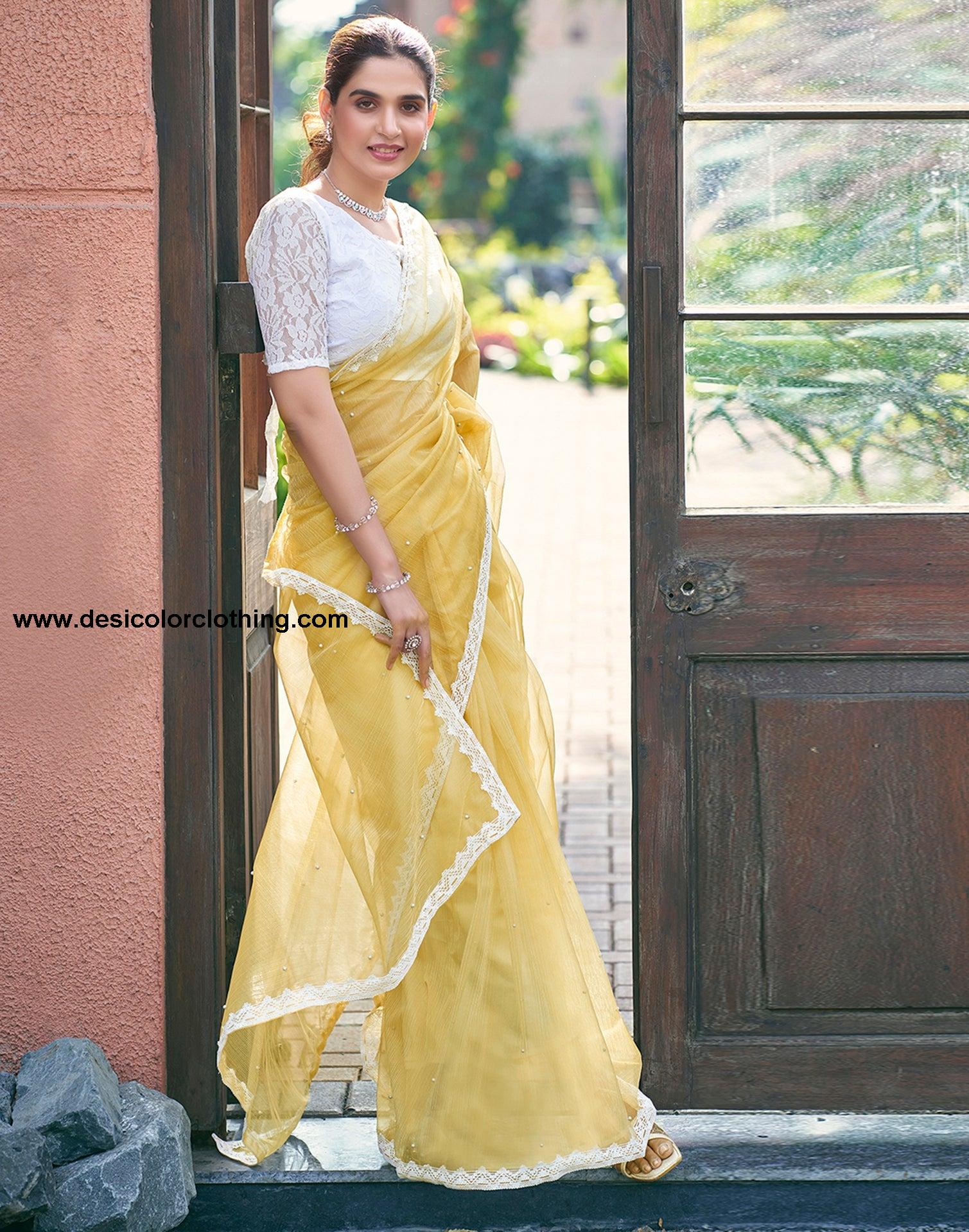 Blouse Color:White Blouse Fabric:Plain Blouse Length:0.70 Mtr Blouse Work:Plain, Self Design Saree Color:Yellow Saree Fabric:Shimmer Net Saree Length:5.30 Mtr Saree Work:Plain