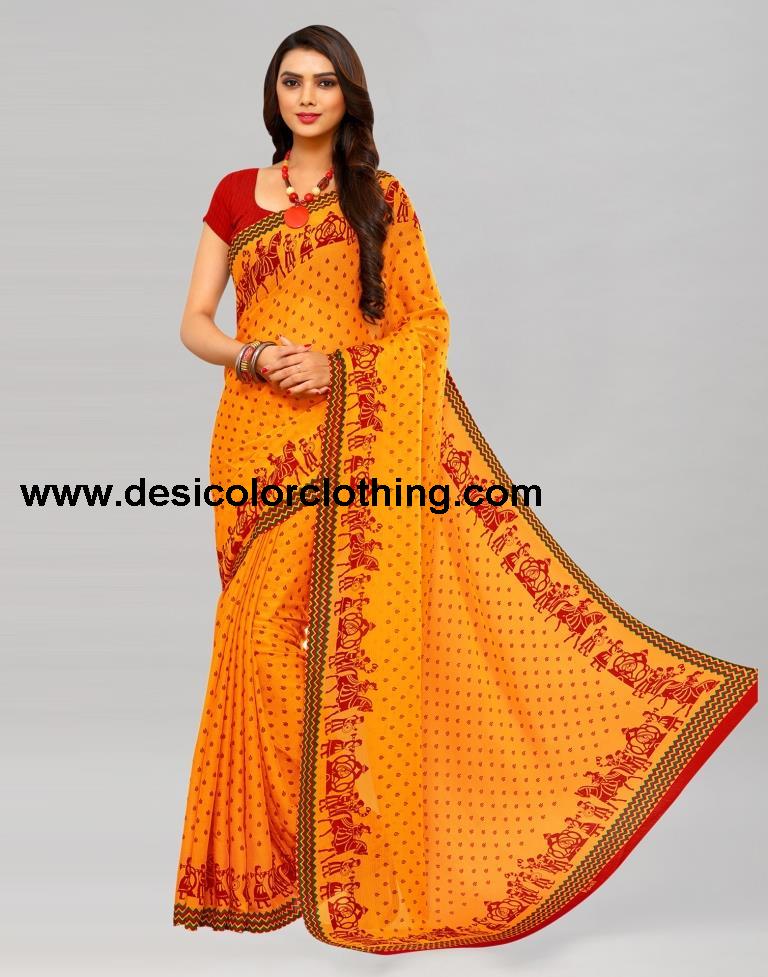 Blouse Color:Maroon Blouse Fabric:Chiffon Blouse Length:0.8 Mtr Blouse Work:Printed Saree Color:Yellow Saree Fabric:Chiffon Saree Length:5.5Mtr Saree Work:Printed Type:Printed