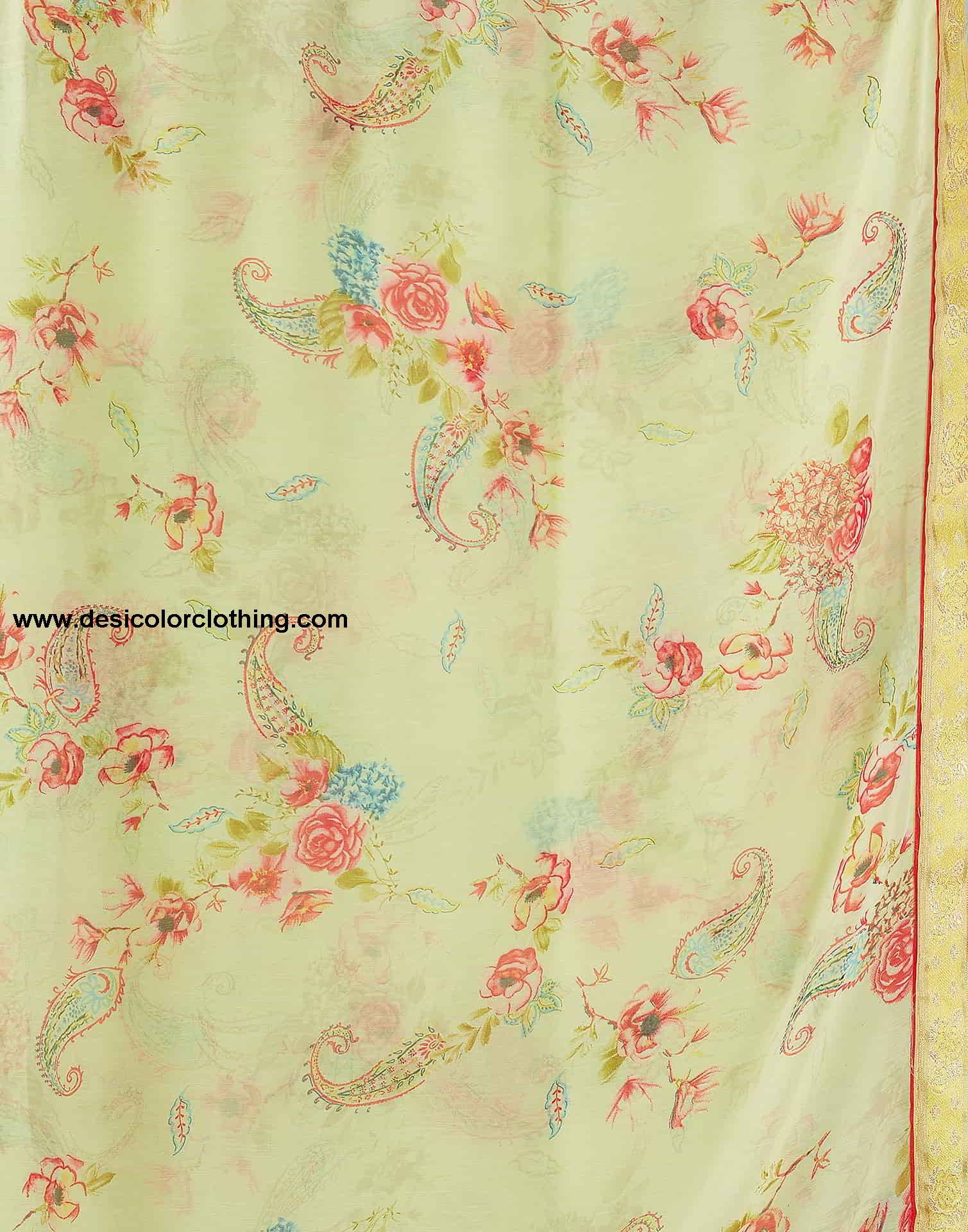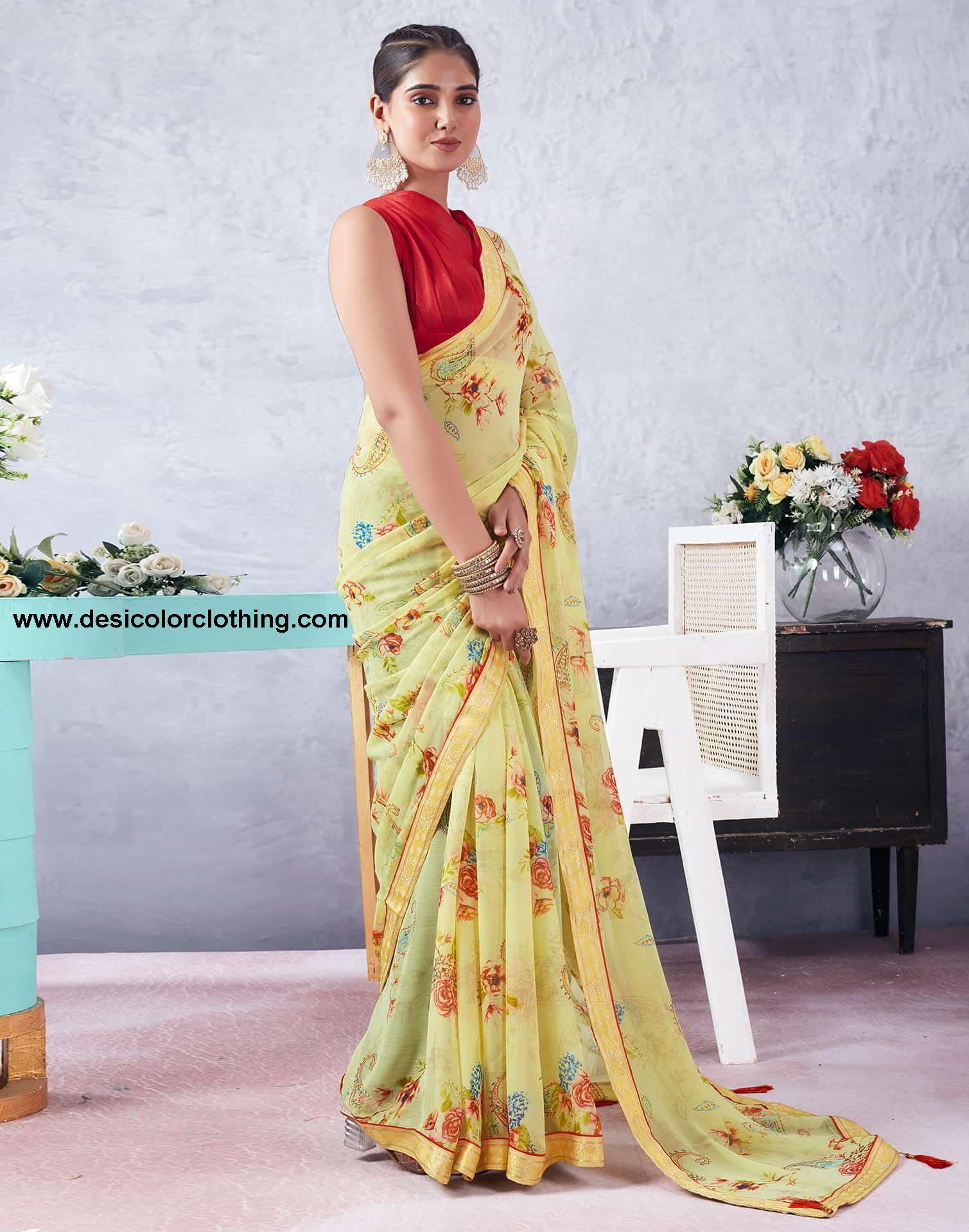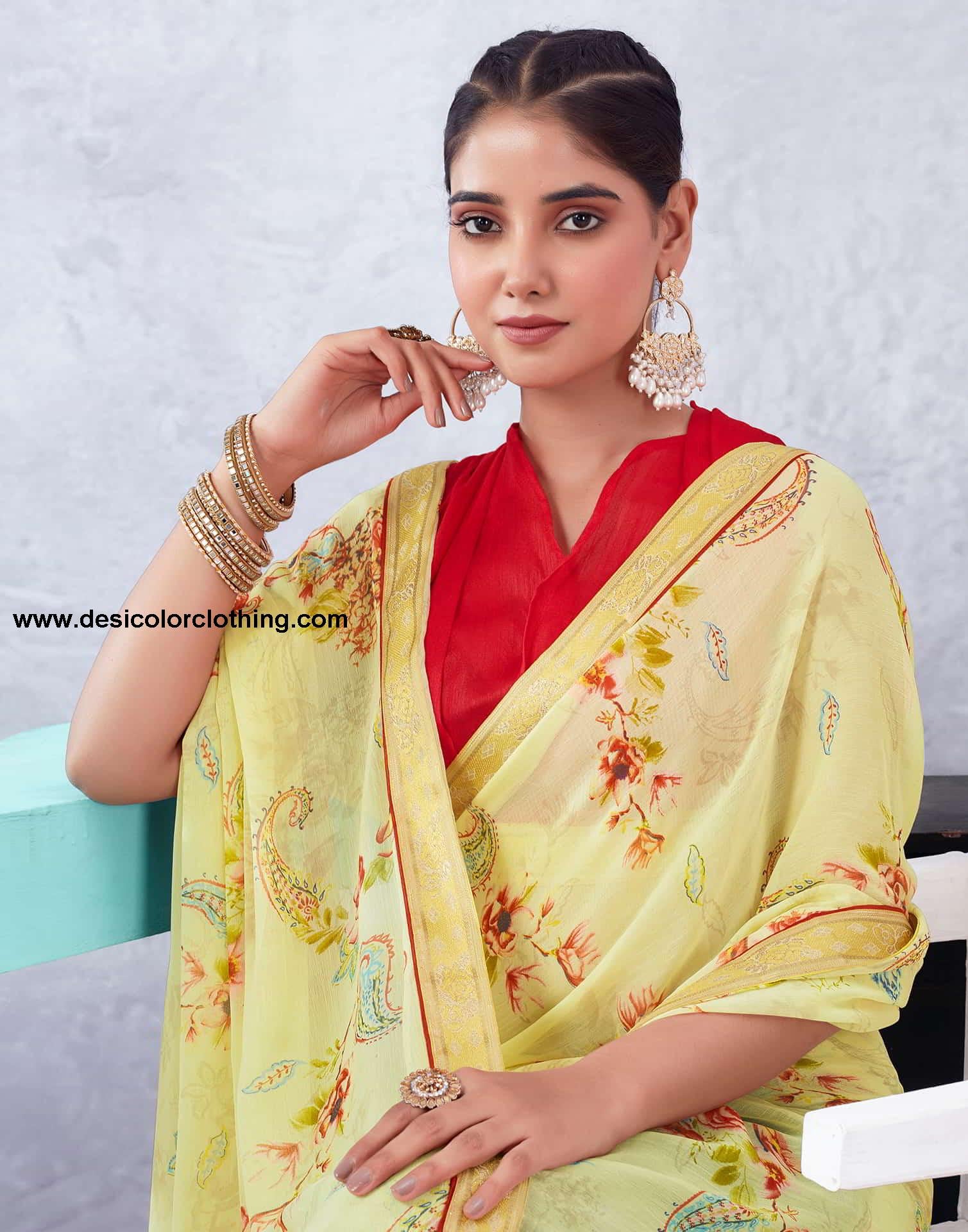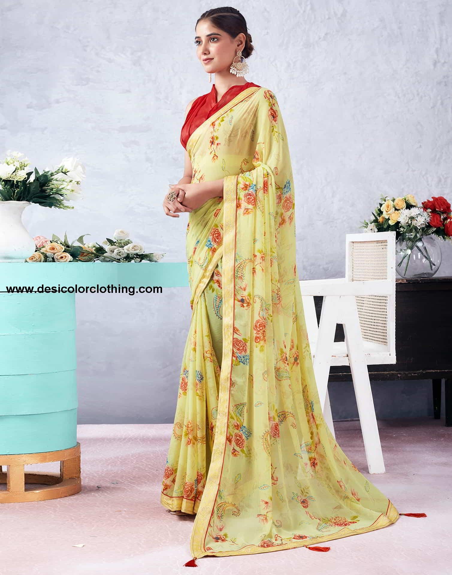 Blouse Color:Red Blouse Fabric:Bhagalpuri Silk Blouse Length:0.80 Mtr Blouse Work:Plain, Lace Saree Color:Light Yellow, Multi Saree Fabric:Chiffon Saree Length:5.50 Mtr Saree Work:Floral Printed, Lace, Tassels Type:Printed