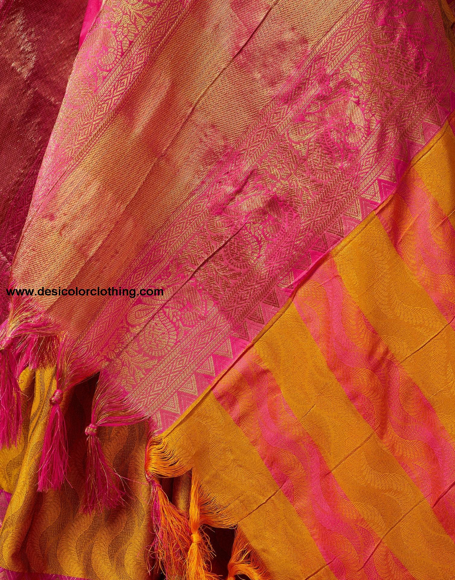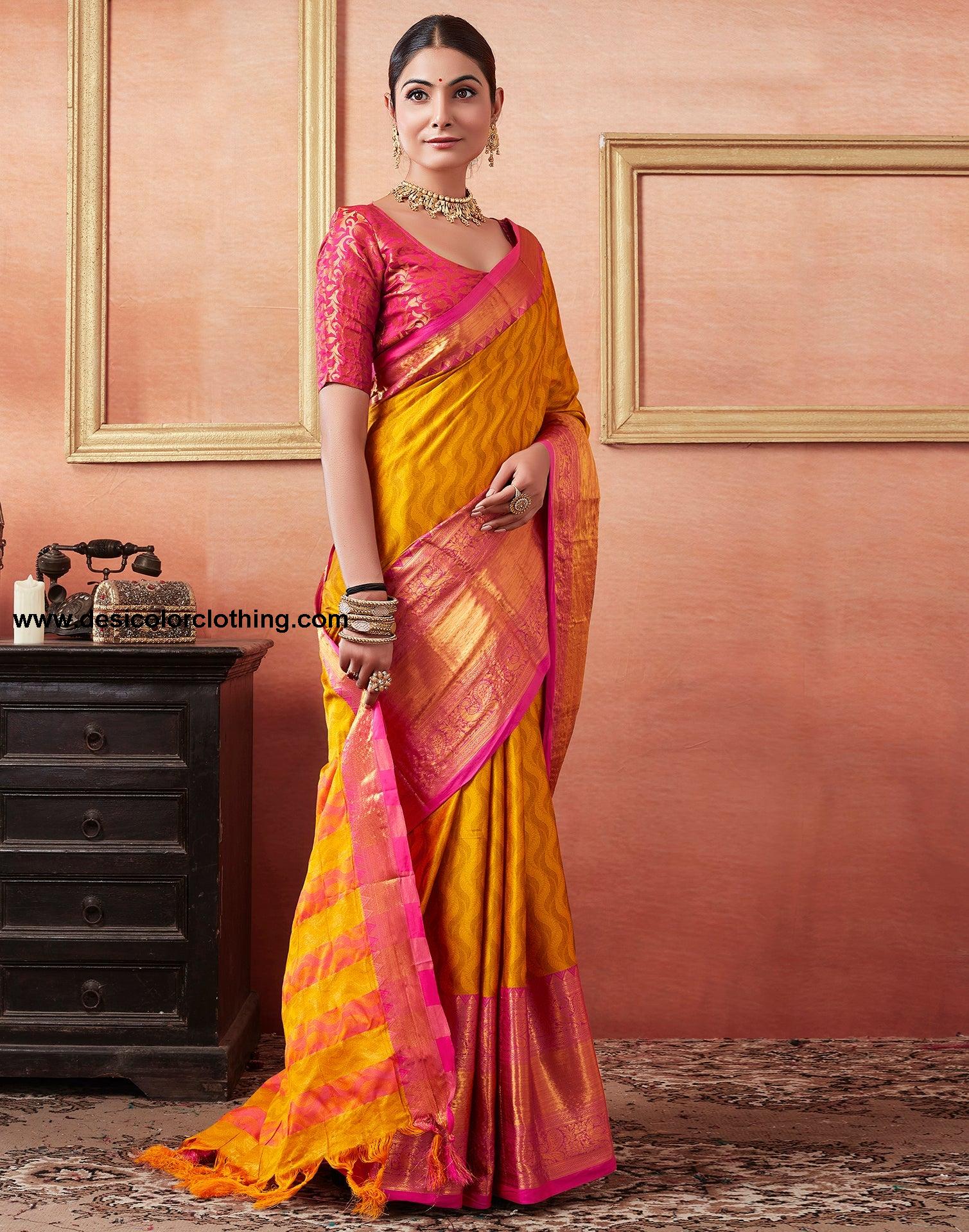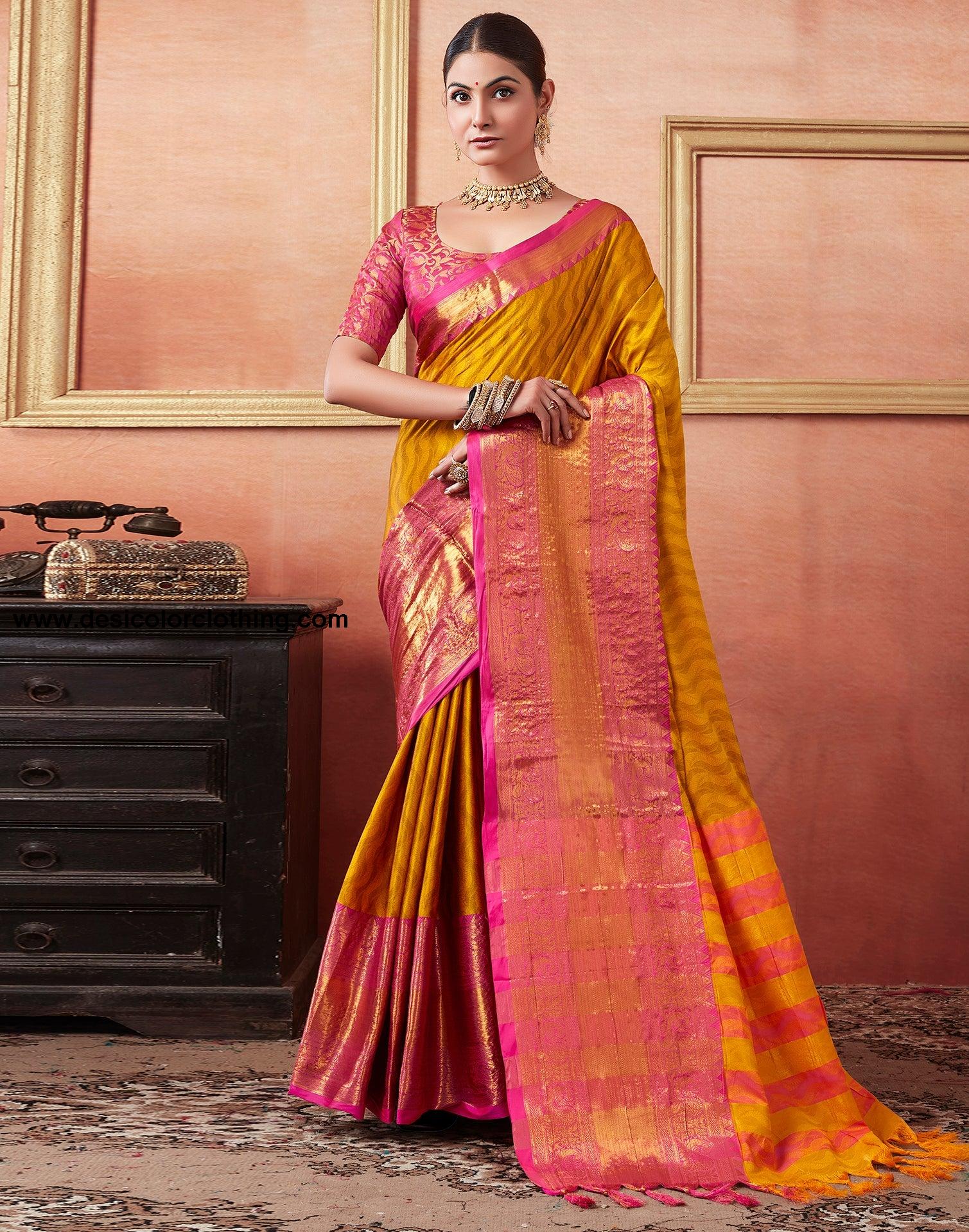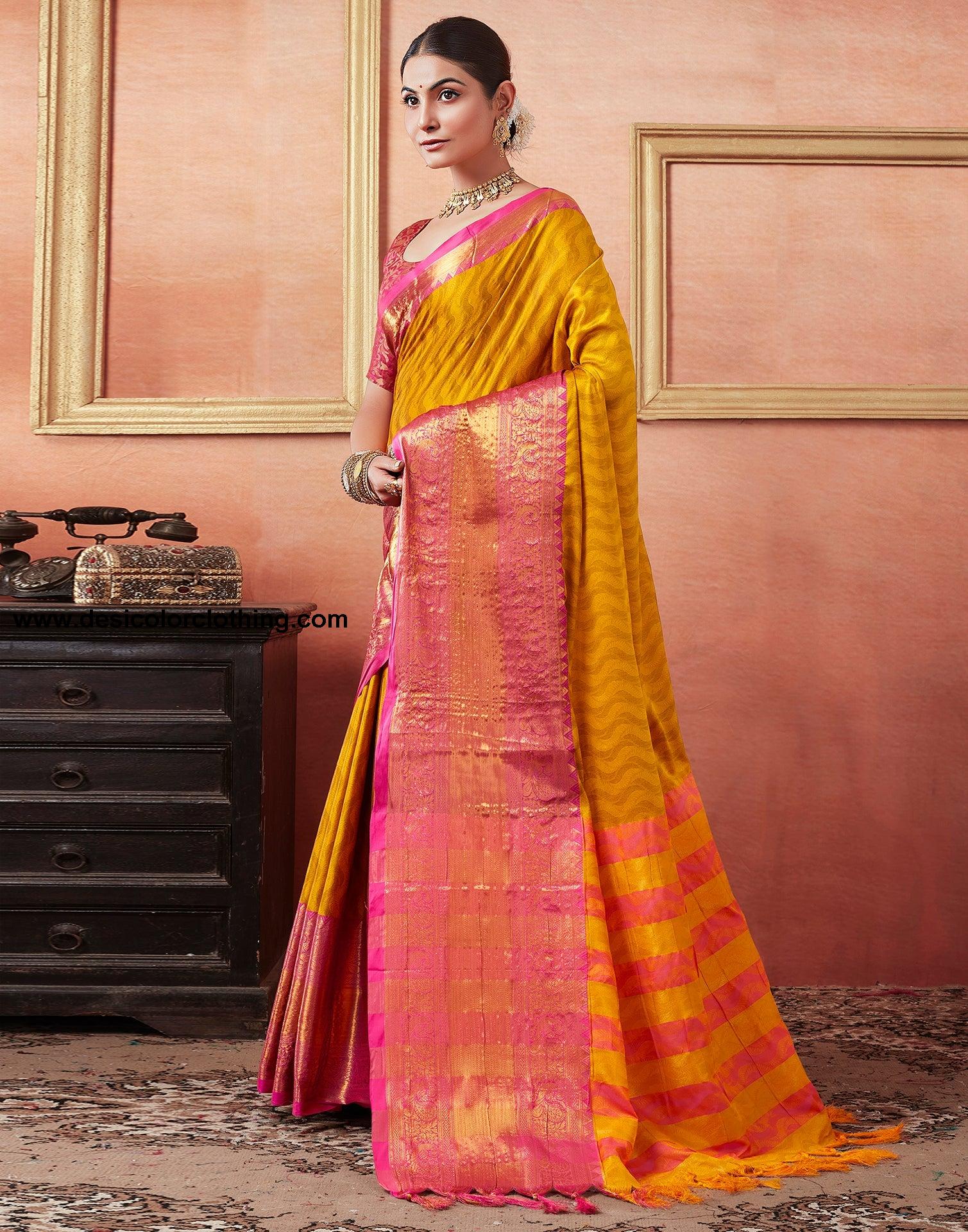 Blouse Color:Rani Pink, Golden Blouse Fabric:Plain Blouse Length:0.80 Mtr Blouse Work:Plain, Weaving Saree Color:Yellow, Rani Pink Saree Fabric:Cotton Silk Saree Length:5.50 Mtr Saree Work:Weaving